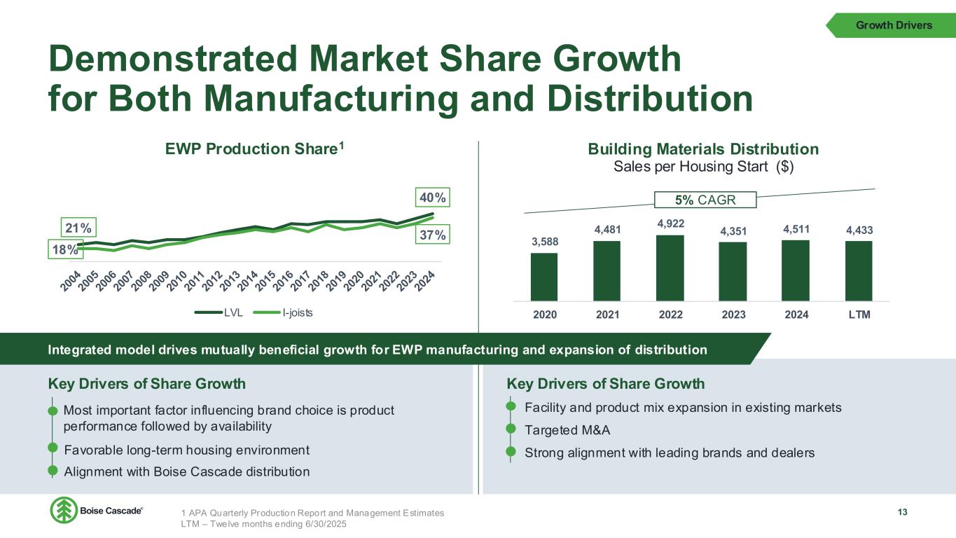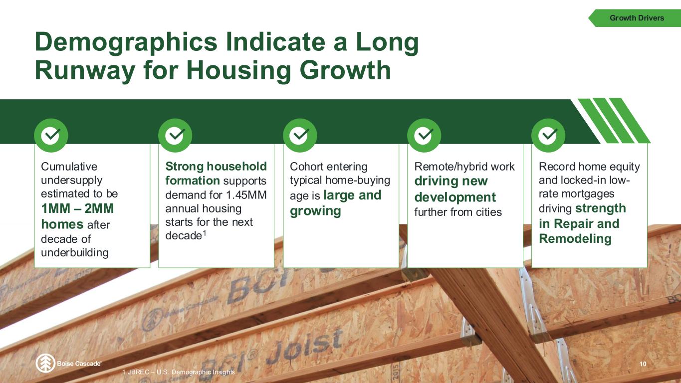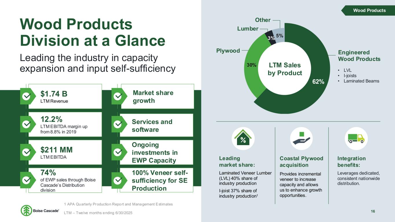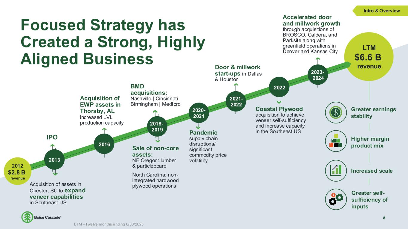 Focused Strategy has Created a Strong, Highly Aligned Business 8 LTM $6.6 B revenue Acquisition of assets in Chester, SC to expand veneer capabilities in Southeast US IPO 2013 2016 BMD acquisitions: Nashville | Cincinnati Birmingham | Medford Coastal Plywood acquisition to achieve veneer self-sufficiency and increase capacity in the Southeast US 2022 Pandemic supply chain disruptions/ significant commodity price volatility 2020- 2021 Accelerated door and millwork growth through acquisitions of BROSCO, Caldera, and Parksite along with greenfield operations in Denver and Kansas City 2018- 2019 Intro & Overview Higher margin product mix Greater earnings stability Greater self- sufficiency of inputs Increased scale Acquisition of EWP assets in Thorsby, AL increased LVL production capacity Sale of non-core assets: NE Oregon: lumber & particleboard North Carolina: non- integrated hardwood plywood operations 2012 $2.8 B revenue 2023- 2024 2021- 2022 Door & millwork start-ups in Dallas & Houston LTM –Twelve months ending 6/30/2025