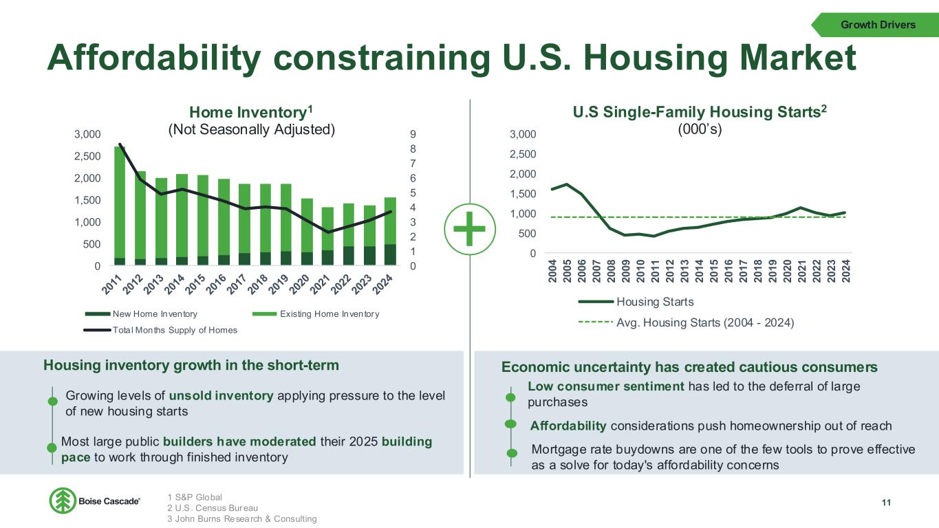 Demographics Indicate a Long Runway for Housing Growth 10 Record home equity and locked-in low- rate mortgages driving strength in Repair and Remodeling Cumulative undersupply estimated to be 1MM – 2MM homes after decade of underbuilding Cohort entering typical home-buying age is large and growing Strong household formation supports demand for 1.45MM annual housing starts for the next decade1 Remote/hybrid work driving new development further from cities Growth Drivers 1 JBREC – U.S. Demographic Insights