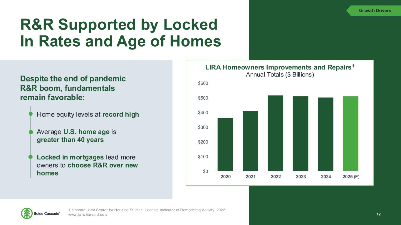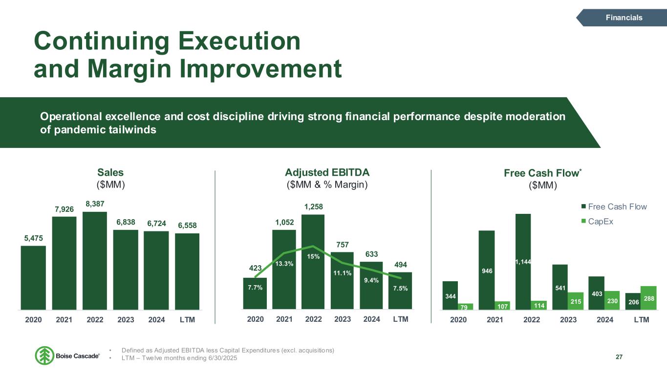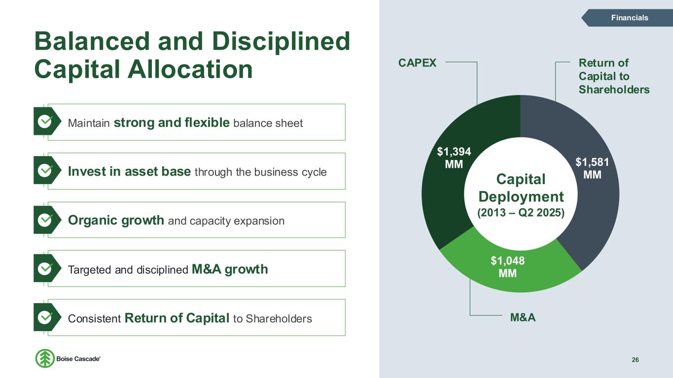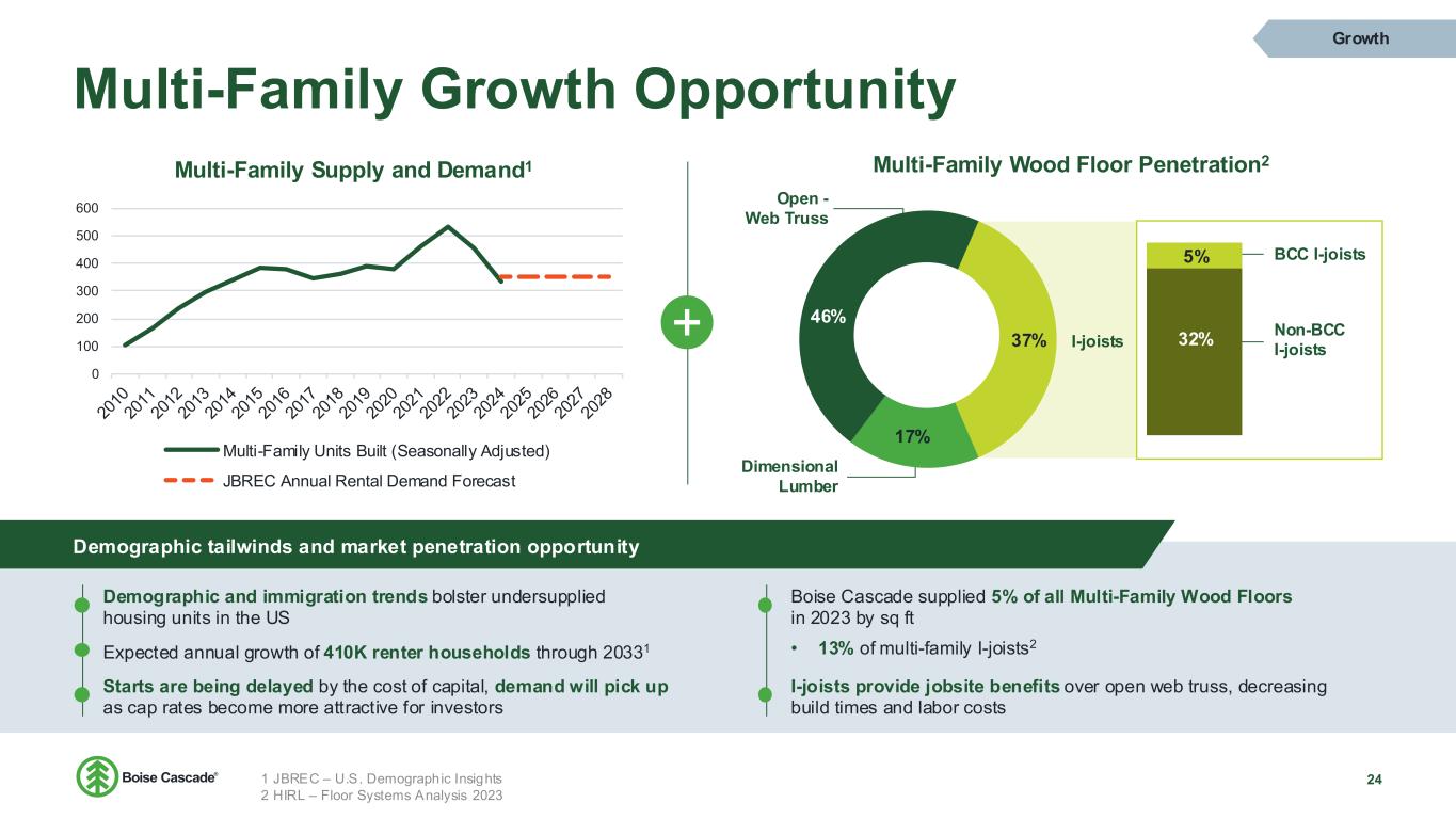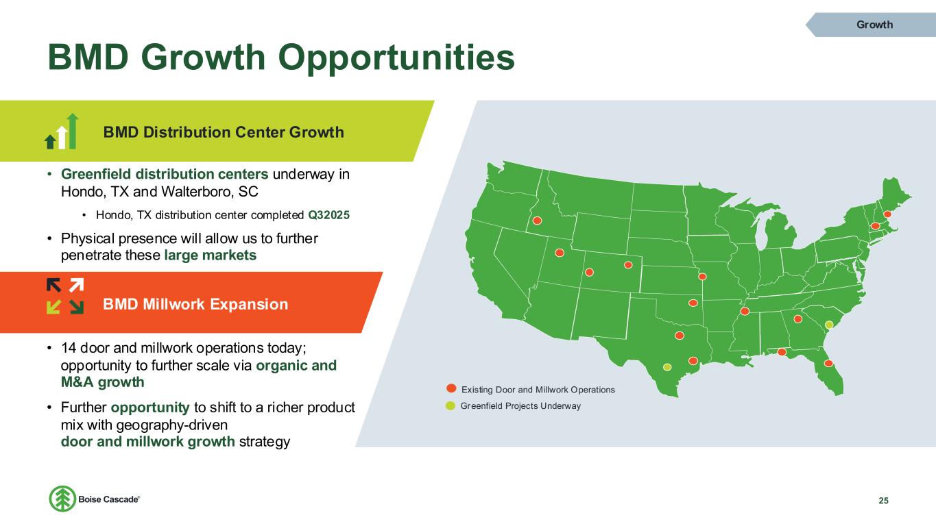 Multi-Family Growth Opportunity 24 Growth 0 100 200 300 400 500 600 Multi-Family Supply and Demand1 Multi-Family Units Built (Seasonally Adjusted) JBREC Annual Rental Demand Forecast Demographic tailwinds and market penetration opportunity Boise Cascade supplied 5% of all Multi-Family Wood Floors in 2023 by sq ft • 13% of multi-family I-joists2 17% 46% 5% 32%37% Multi-Family Wood Floor Penetration2 Open - Web Truss Dimensional Lumber I-joists BCC I-joists Non-BCC I-joists Demographic and immigration trends bolster undersupplied housing units in the US Starts are being delayed by the cost of capital, demand will pick up as cap rates become more attractive for investors Expected annual growth of 410K renter households through 20331 I-joists provide jobsite benefits over open web truss, decreasing build times and labor costs 1 JBREC – U.S. Demographic Insights 2 HIRL – Floor Systems Analysis 2023