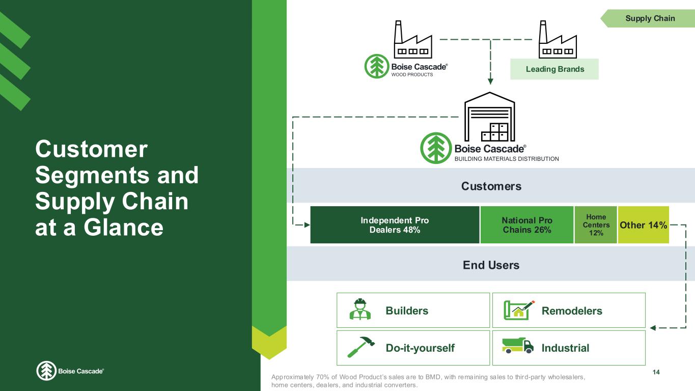 3,588 4,481 4,922 4,351 4,511 4,433 2020 2021 2022 2023 2024 LTM 5% CAGR Demonstrated Market Share Growth for Both Manufacturing and Distribution 13 EWP Production Share1 Building Materials Distribution Sales per Housing Start ($) Key Drivers of Share Growth Key Drivers of Share Growth Most important factor influencing brand choice is product performance followed by availability Favorable long-term housing environment Facility and product mix expansion in existing markets Strong alignment with leading brands and dealers Targeted M&A Growth Drivers 21% 40% 18% 37% LVL I-joists Integrated model drives mutually beneficial growth for EWP manufacturing and expansion of distribution Alignment with Boise Cascade distribution 1 APA Quarterly Production Report and Management Estimates LTM – Twelve months ending 6/30/2025