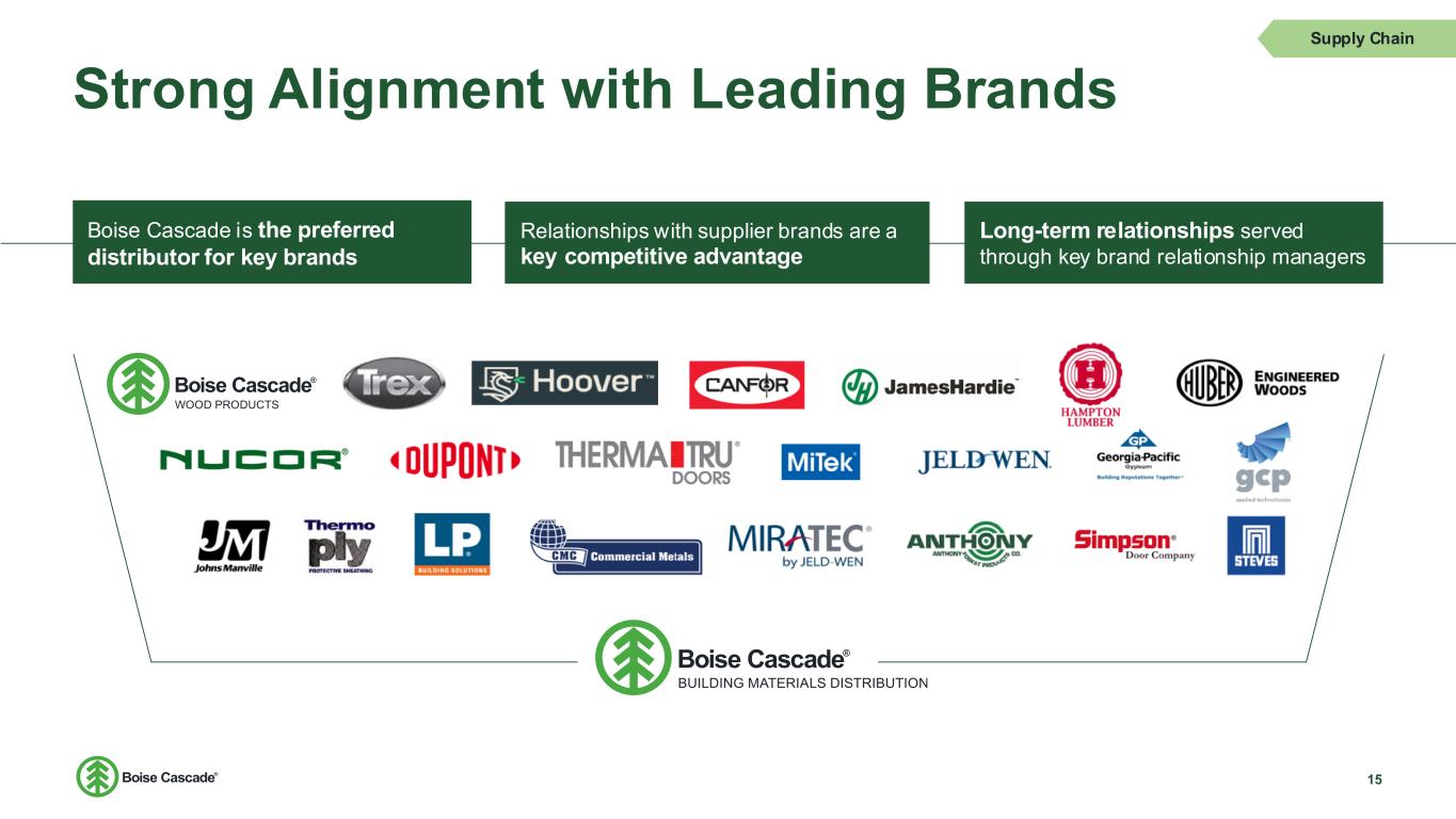 Customer Segments and Supply Chain at a Glance 14 Customers End Users Builders Remodelers Supply Chain IndustrialDo-it-yourself Leading Brands Independent Pro Dealers 48% National Pro Chains 26% Home Centers 12% Other 14% Approximately 70% of Wood Product’s sales are to BMD, with remaining sales to third-par ty wholesalers, home centers, dealers, and industrial converters.