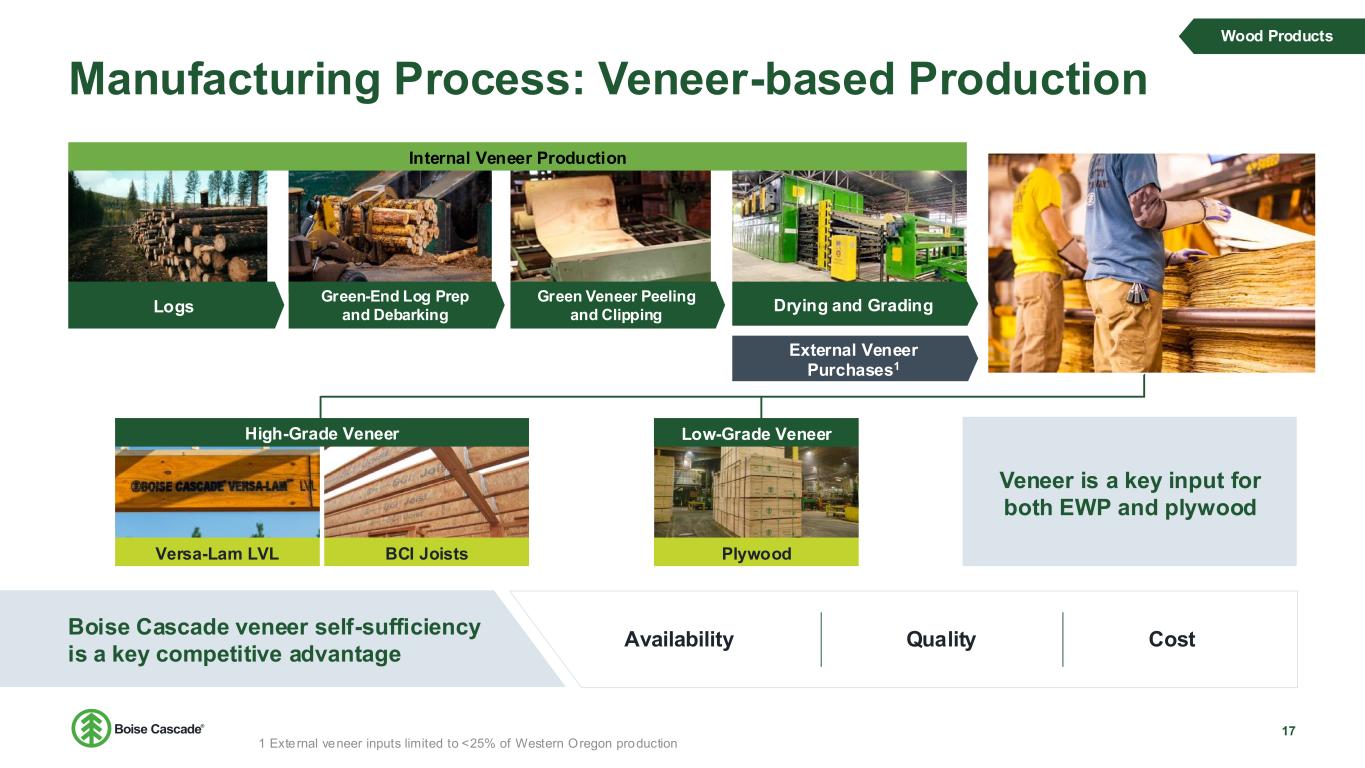 $1.74 B LTM Revenue 12.2% LTM EBITDA margin up from 8.8% in 2019 $211 MM LTM EBITDA 74% of EWP sales through Boise Cascade’s Distribution division Market share growth Services and software Ongoing investments in EWP Capacity Wood Products Division at a Glance Leading the industry in capacity expansion and input self-sufficiency 16 Plywood Lumber Other Engineered Wood Products • LVL • I-joists • Laminated Beams62% 30% 3% 5% LTM Sales by Product Leading market share: Laminated Veneer Lumber (LVL) 40% share of industry production I-joist 37% share of industry production1 Coastal Plywood acquisition Provides incremental veneer to increase capacity and allows us to enhance growth opportunities. Integration benefits: Leverages dedicated, consistent nationwide distribution. Wood Products 100% Veneer self- sufficiency for SE Production 1 APA Quarterly Production Report and Management Estimates LTM – Twelve months ending 6/30/2025