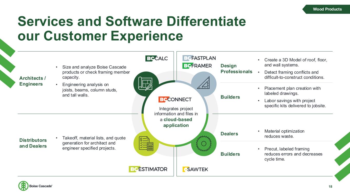 Manufacturing Process: Veneer-based Production 17 Logs Green-End Log Prep and Debarking Green Veneer Peeling and Clipping Drying and Grading External Veneer Purchases1 Boise Cascade veneer self-sufficiency is a key competitive advantage Wood Products Internal Veneer Production Veneer is a key input for both EWP and plywood Low-Grade Veneer Versa-Lam LVL BCI Joists High-Grade Veneer Plywood Availability Quality Cost 1 External veneer inputs limited to <25% of Western Oregon production