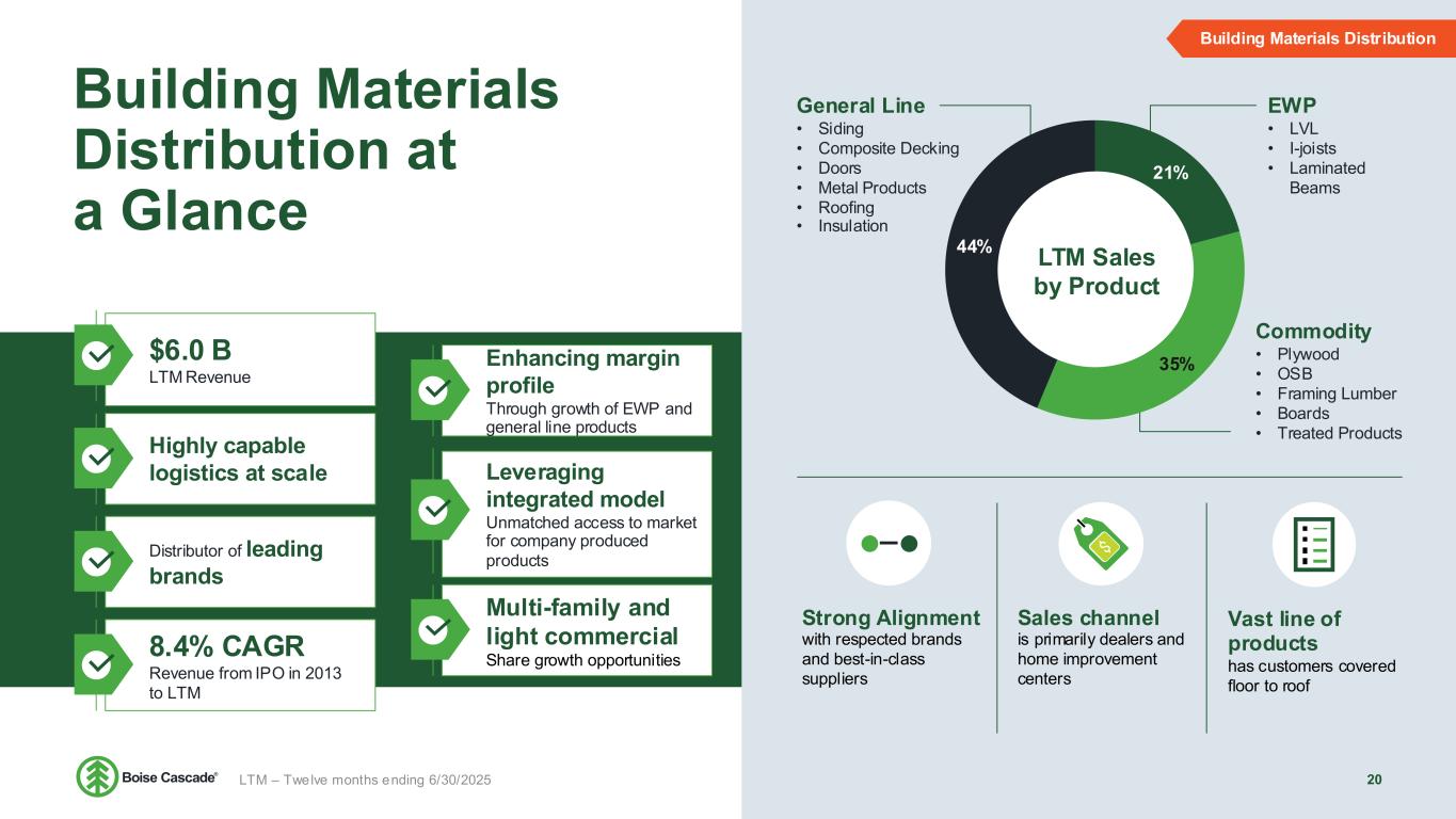 Builders Increasingly Demand Engineered Wood 19 Wood Products Superior strength, less material usage, less waste, longer spans Reduced labor and installed cost Sustainability attributes increasingly in demand Cycle time advantages for builder