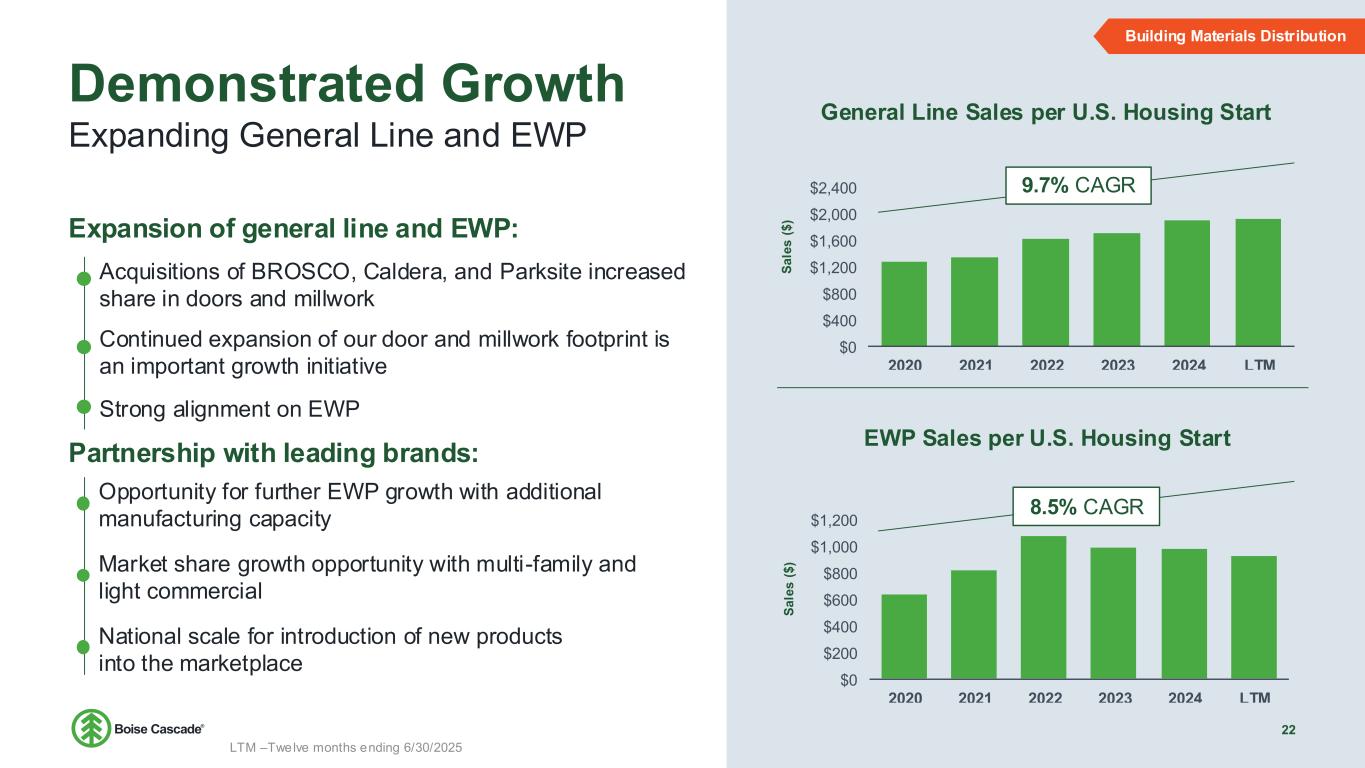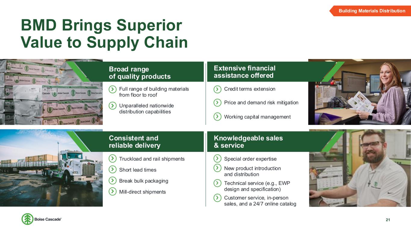Building Materials Distribution at a Glance 20 $6.0 B LTM Revenue Highly capable logistics at scale Distributor of leading brands 8.4% CAGR Revenue from IPO in 2013 to LTM Enhancing margin profile Through growth of EWP and general line products Leveraging integrated model Unmatched access to market for company produced products Multi-family and light commercial Share growth opportunities Vast line of products has customers covered floor to roof Sales channel is primarily dealers and home improvement centers Strong Alignment with respected brands and best-in-class suppliers Commodity • Plywood • OSB • Framing Lumber • Boards • Treated Products EWP • LVL • I-joists • Laminated Beams General Line • Siding • Composite Decking • Doors • Metal Products • Roofing • Insulation 21% 35% 44% LTM Sales by Product Building Materials Distribution LTM – Twelve months ending 6/30/2025