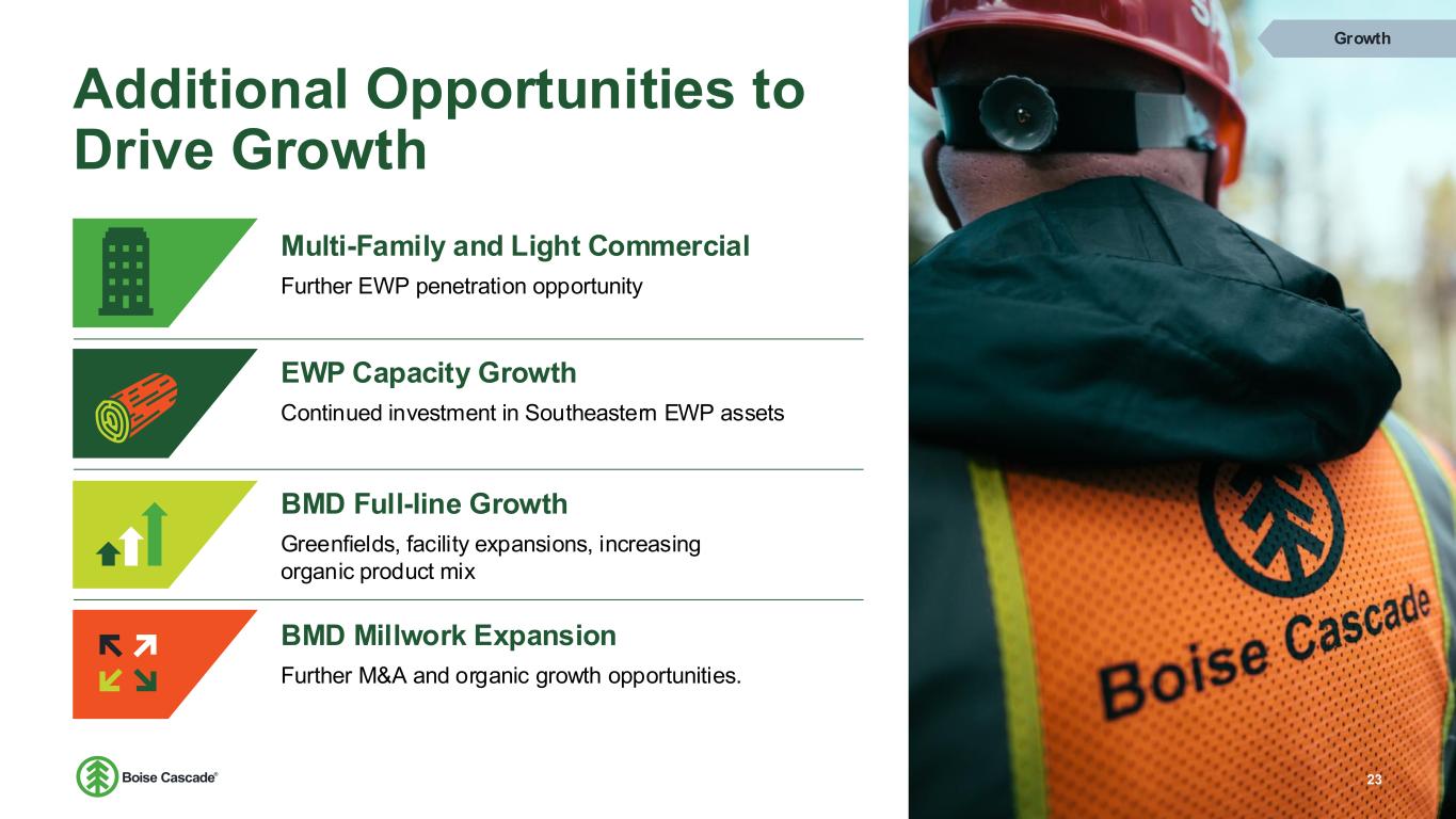 Demonstrated Growth 22 Expanding General Line and EWP Building Materials Distribution Expansion of general line and EWP: Partnership with leading brands: Opportunity for further EWP growth with additional manufacturing capacity Market share growth opportunity with multi-family and light commercial National scale for introduction of new products into the marketplace Acquisitions of BROSCO, Caldera, and Parksite increased share in doors and millwork Continued expansion of our door and millwork footprint is an important growth initiative Strong alignment on EWP $0 $400 $800 $1,200 $1,600 $2,000 $2,400 2020 2021 2022 2023 2024 LTM S a le s ( $ ) General Line Sales per U.S. Housing Start 9.7% CAGR $0 $200 $400 $600 $800 $1,000 $1,200 2020 2021 2022 2023 2024 LTM S a le s ( $ ) EWP Sales per U.S. Housing Start 8.5% CAGR LTM –Twelve months ending 6/30/2025