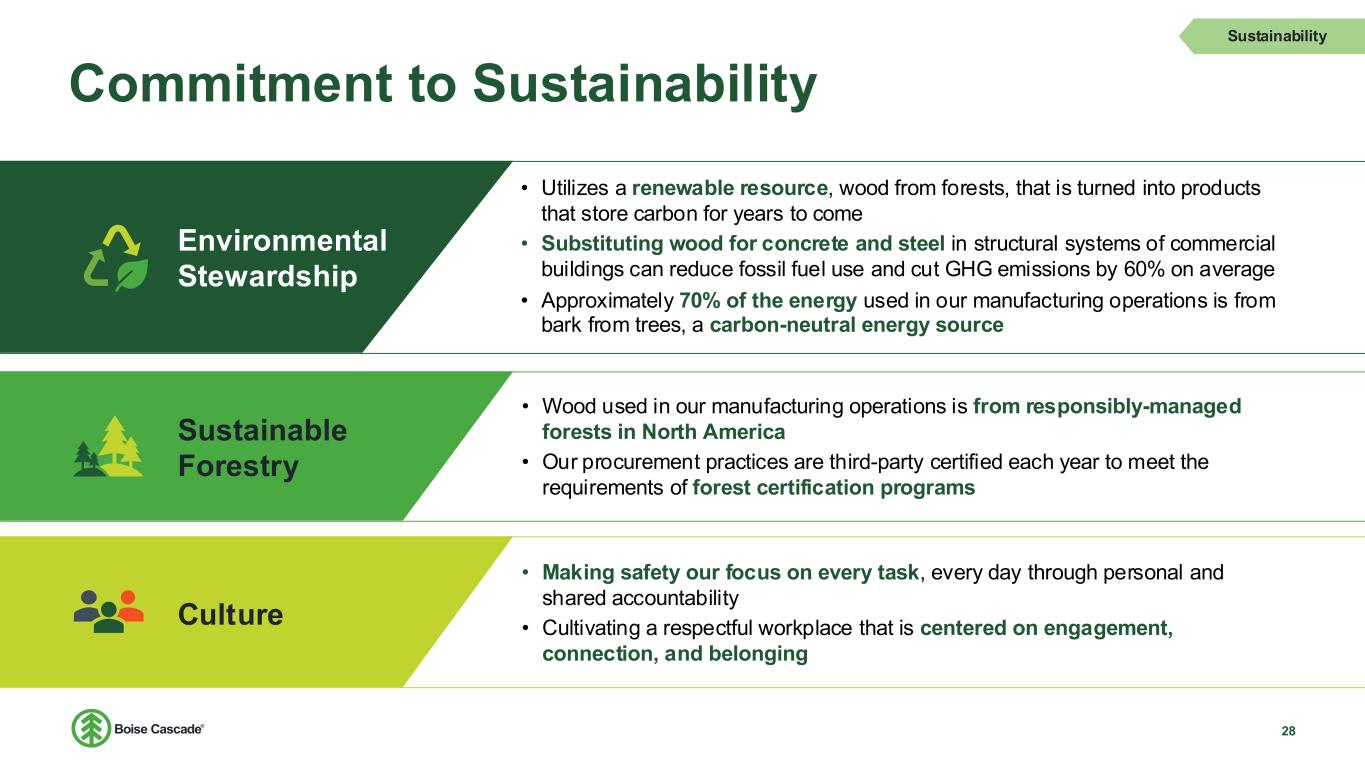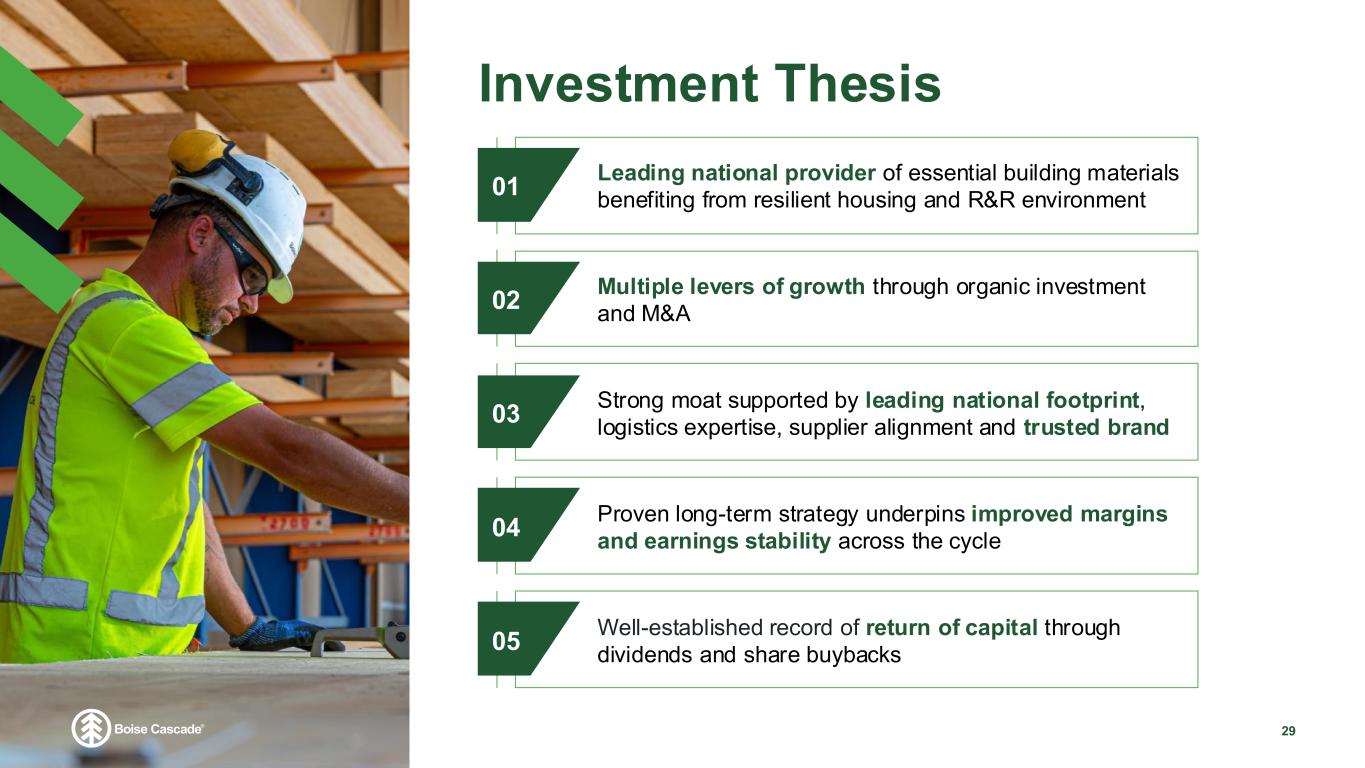 Commitment to Sustainability 28 • Utilizes a renewable resource, wood from forests, that is turned into products that store carbon for years to come • Substituting wood for concrete and steel in structural systems of commercial buildings can reduce fossil fuel use and cut GHG emissions by 60% on average • Approximately 70% of the energy used in our manufacturing operations is from bark from trees, a carbon-neutral energy source Sustainability Environmental Stewardship • Making safety our focus on every task, every day through personal and shared accountability • Cultivating a respectful workplace that is centered on engagement, connection, and belonging Culture • Wood used in our manufacturing operations is from responsibly-managed forests in North America • Our procurement practices are third-party certified each year to meet the requirements of forest certification programs Sustainable Forestry