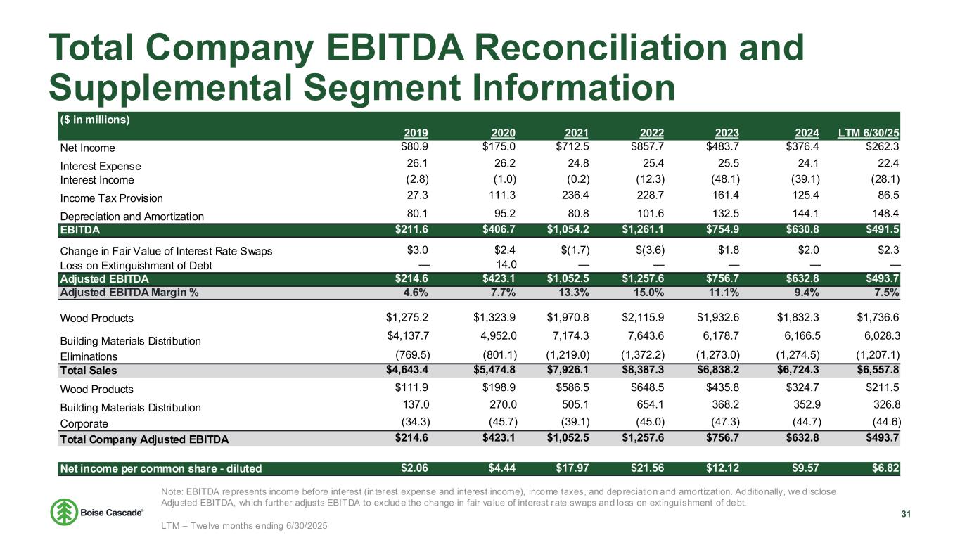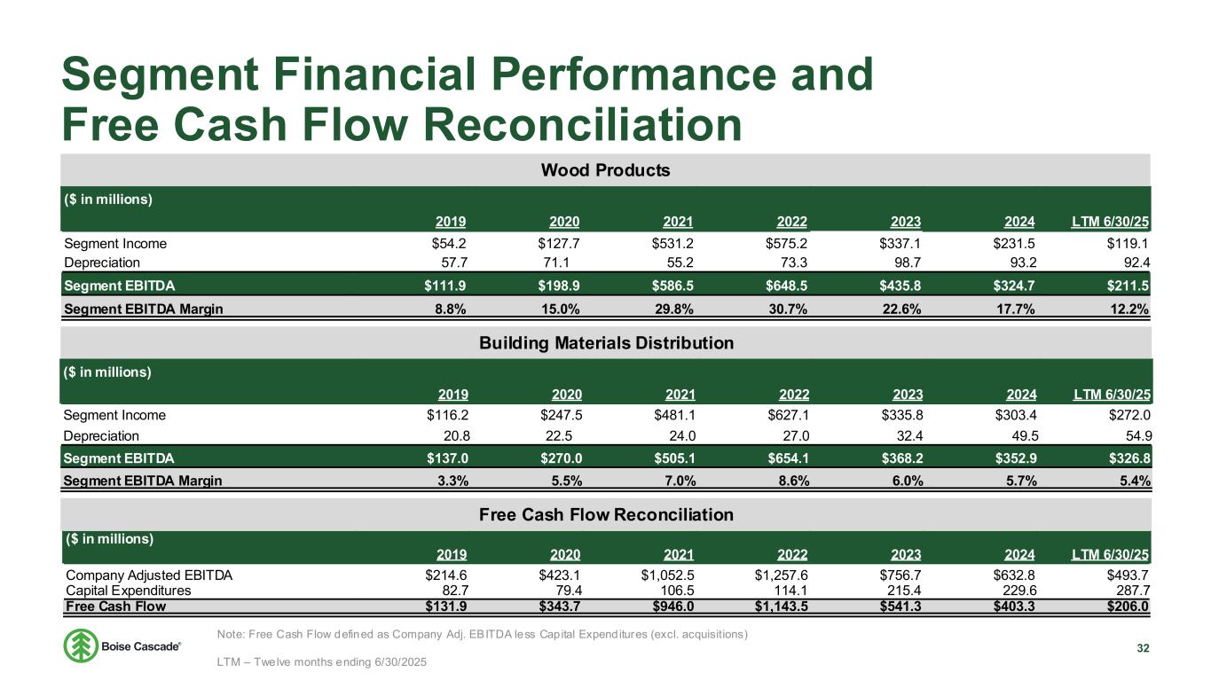 Total Company EBITDA Reconciliation and Supplemental Segment Information ($ in millions) 2019 2020 2021 2022 2023 2024 LTM 6/30/25 Net Income $80.9 $175.0 $712.5 $857.7 $483.7 $376.4 $262.3 Interest Expense 26.1 26.2 24.8 25.4 25.5 24.1 22.4 Interest Income (2.8) (1.0) (0.2) (12.3) (48.1) (39.1) (28.1) Income Tax Provision 27.3 111.3 236.4 228.7 161.4 125.4 86.5 Depreciation and Amortization 80.1 95.2 80.8 101.6 132.5 144.1 148.4 EBITDA $211.6 $406.7 $1,054.2 $1,261.1 $754.9 $630.8 $491.5 Change in Fair Value of Interest Rate Swaps $3.0 $2.4 $(1.7) $(3.6) $1.8 $2.0 $2.3 Loss on Extinguishment of Debt — 14.0 — — — — — Adjusted EBITDA $214.6 $423.1 $1,052.5 $1,257.6 $756.7 $632.8 $493.7 Adjusted EBITDA Margin % 4.6% 7.7% 13.3% 15.0% 11.1% 9.4% 7.5% Wood Products $1,275.2 $1,323.9 $1,970.8 $2,115.9 $1,932.6 $1,832.3 $1,736.6 Building Materials Distribution $4,137.7 4,952.0 7,174.3 7,643.6 6,178.7 6,166.5 6,028.3 Eliminations (769.5) (801.1) (1,219.0) (1,372.2) (1,273.0) (1,274.5) (1,207.1) Total Sales $4,643.4 $5,474.8 $7,926.1 $8,387.3 $6,838.2 $6,724.3 $6,557.8 Wood Products $111.9 $198.9 $586.5 $648.5 $435.8 $324.7 $211.5 Building Materials Distribution 137.0 270.0 505.1 654.1 368.2 352.9 326.8 Corporate (34.3) (45.7) (39.1) (45.0) (47.3) (44.7) (44.6) Total Company Adjusted EBITDA $214.6 $423.1 $1,052.5 $1,257.6 $756.7 $632.8 $493.7 Net income per common share - diluted $2.06 $4.44 $17.97 $21.56 $12.12 $9.57 $6.82 Total Compa y EBITDA Reco ciliation and Supplemental Segment Information Note: EBITDA represents income before interest (in terest expense and interest income), income taxes, and depreciation and amortization. Additionally, we d isclose Adjusted EBITDA, which further adjusts EBITDA to exclude the change in fair va lue of interest rate swaps and loss on extinguishment of debt. LTM – Twelve months ending 6/30/2025 31