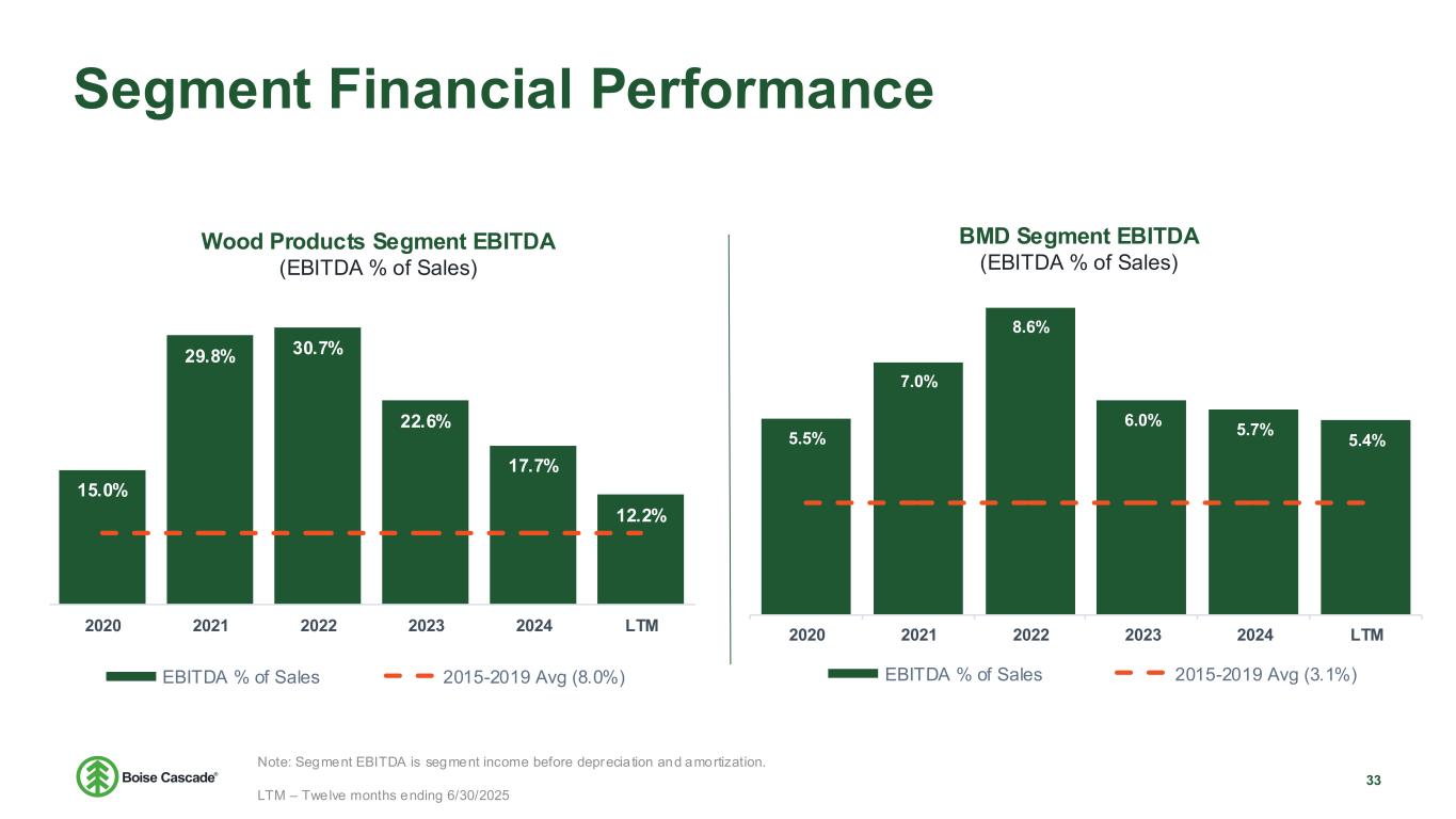 Segment Financial Performance and Free Cash Flow Reconciliation Wood Products Building Materials Distribution Free Cash Flow Reconciliation ($ in millions) 2019 2020 2021 2022 2023 2024 LTM 6/30/25 Segment Income $54.2 $127.7 $531.2 $575.2 $337.1 $231.5 $119.1 Depreciation 57.7 71.1 55.2 73.3 98.7 93.2 92.4 Segment EBITDA $111.9 $198.9 $586.5 $648.5 $435.8 $324.7 $211.5 Segment EBITDA Margin 8.8% 15.0% 29.8% 30.7% 22.6% 17.7% 12.2% ($ in millions) 2019 2020 2021 2022 2023 2024 LTM 6/30/25 Segment Income $116.2 $247.5 $481.1 $627.1 $335.8 $303.4 $272.0 Depreciation 20.8 22.5 24.0 27.0 32.4 49.5 54.9 Segment EBITDA $137.0 $270.0 $505.1 $654.1 $368.2 $352.9 $326.8 Segment EBITDA Margin 3.3% 5.5% 7.0% 8.6% 6.0% 5.7% 5.4% ($ in millions) 2019 2020 2021 2022 2023 2024 LTM 6/30/25 Company Adjusted EBITDA $214.6 $423.1 $1,052.5 $1,257.6 $756.7 $632.8 $493.7 Capital Expenditures 82.7 79.4 106.5 114.1 215.4 229.6 287.7 Free Cash Flow $131.9 $343.7 $946.0 $1,143.5 $541.3 $403.3 $206.0 Segment Financial Performance and Free Cash Flow Reconciliation Note: Free Cash Flow defined as Company Adj. EBITDA less Capital Expenditures (excl. acquisitions) LTM – Twelve months ending 6/30/2025 32