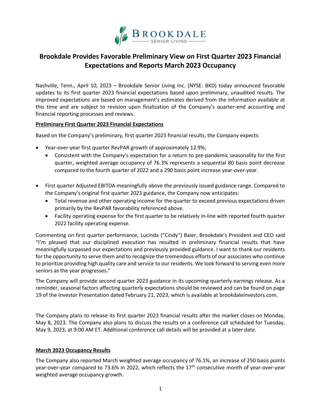 1 Brookdale Provides Favorable Preliminary View on First Quarter 2023 Financial Expectations and Reports March 2023 Occupancy Nashville, Tenn., April 10, 2023 – Brookdale Senior Living Inc. (NYSE: BKD) today announced favorable updates to its first quarter 2023 financial expectations based upon preliminary, unaudited results. The improved expectations are based on management’s estimates derived from the information available at this time and are subject to revision upon finalization of the Company’s quarter-end accounting and financial reporting processes and reviews. Preliminary First Quarter 2023 Financial Expectations Based on the Company’s preliminary, first quarter 2023 financial results, the Company expects:  Year-over-year first quarter RevPAR growth of approximately 12.9%;  Consistent with the Company’s expectation for a return to pre-pandemic seasonality for the first quarter, weighted average occupancy of 76.3% represents a sequential 80 basis point decrease compared to the fourth quarter of 2022 and a 290 basis point increase year-over-year.  First quarter Adjusted EBITDA meaningfully above the previously issued guidance range. Compared to the Company’s original first quarter 2023 guidance, the Company now anticipates:  Total revenue and other operating income for the quarter to exceed previous expectations driven primarily by the RevPAR favorability referenced above.  Facility operating expense for the first quarter to be relatively in-line with reported fourth quarter 2022 facility operating expense. Commenting on first quarter performance, Lucinda (“Cindy”) Baier, Brookdale’s President and CEO said “I’m pleased that our disciplined execution has resulted in preliminary financial results that have meaningfully surpassed our expectations and previously provided guidance. I want to thank our residents for the opportunity to serve them and to recognize the tremendous efforts of our associates who continue to prioritize providing high quality care and service to our residents. We look forward to serving even more seniors as the year progresses.” The Company will provide second quarter 2023 guidance in its upcoming quarterly earnings release. As a reminder, seasonal factors affecting quarterly expectations should be reviewed and can be found on page 19 of the Investor Presentation dated February 21, 2023, which is available at brookdaleinvestors.com. The Company plans to release its first quarter 2023 financial results after the market closes on Monday, May 8, 2023. The Company also plans to discuss the results on a conference call scheduled for Tuesday, May 9, 2023, at 9:00 AM ET. Additional conference call details will be provided at a later date. March 2023 Occupancy Results The Company also reported March weighted average occupancy of 76.1%, an increase of 250 basis points year-over-year compared to 73.6% in 2022, which reflects the 17th consecutive month of year-over-year weighted average occupancy growth.