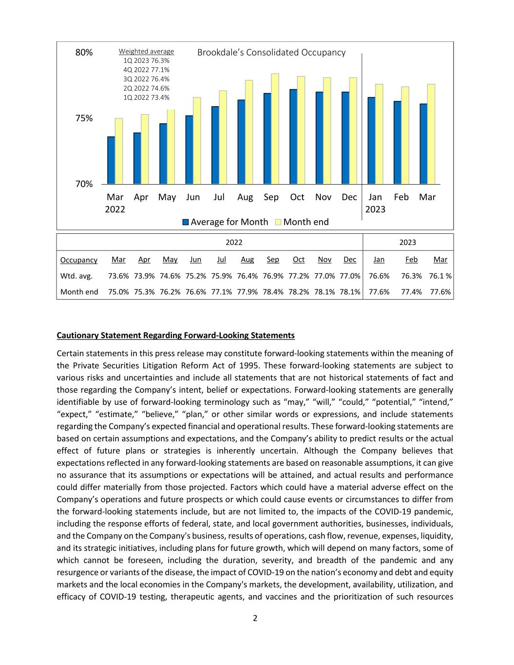 2 2022 2023 Occupancy Mar Apr May Jun Jul Aug Sep Oct Nov Dec Jan Feb Mar Wtd. avg. 73.6% 73.9% 74.6% 75.2% 75.9% 76.4% 76.9% 77.2% 77.0% 77.0% 76.6% 76.3% 76.1 % Month end 75.0% 75.3% 76.2% 76.6% 77.1% 77.9% 78.4% 78.2% 78.1% 78.1% 77.6% 77.4% 77.6% Cautionary Statement Regarding Forward-Looking Statements Certain statements in this press release may constitute forward-looking statements within the meaning of the Private Securities Litigation Reform Act of 1995. These forward-looking statements are subject to various risks and uncertainties and include all statements that are not historical statements of fact and those regarding the Company’s intent, belief or expectations. Forward-looking statements are generally identifiable by use of forward-looking terminology such as “may,” “will,” “could,” “potential,” “intend,” “expect,” “estimate,” “believe,” “plan,” or other similar words or expressions, and include statements regarding the Company’s expected financial and operational results. These forward-looking statements are based on certain assumptions and expectations, and the Company’s ability to predict results or the actual effect of future plans or strategies is inherently uncertain. Although the Company believes that expectations reflected in any forward-looking statements are based on reasonable assumptions, it can give no assurance that its assumptions or expectations will be attained, and actual results and performance could differ materially from those projected. Factors which could have a material adverse effect on the Company’s operations and future prospects or which could cause events or circumstances to differ from the forward-looking statements include, but are not limited to, the impacts of the COVID-19 pandemic, including the response efforts of federal, state, and local government authorities, businesses, individuals, and the Company on the Company's business, results of operations, cash flow, revenue, expenses, liquidity, and its strategic initiatives, including plans for future growth, which will depend on many factors, some of which cannot be foreseen, including the duration, severity, and breadth of the pandemic and any resurgence or variants of the disease, the impact of COVID-19 on the nation’s economy and debt and equity markets and the local economies in the Company's markets, the development, availability, utilization, and efficacy of COVID-19 testing, therapeutic agents, and vaccines and the prioritization of such resources 70% 75% 80% Mar 2022 Apr May Jun Jul Aug Sep Oct Nov Dec Jan 2023 Feb Mar Average for Month Month end Weighted average 1Q 2023 76.3% 4Q 2022 77.1% 3Q 2022 76.4% 2Q 2022 74.6% 1Q 2022 73.4% Brookdale’s Consolidated Occupancy