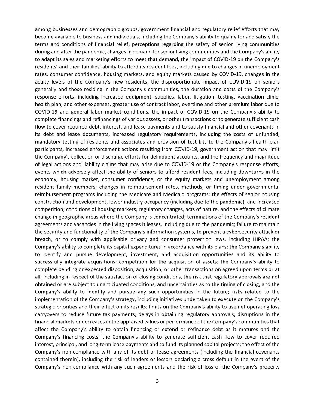 3 among businesses and demographic groups, government financial and regulatory relief efforts that may become available to business and individuals, including the Company's ability to qualify for and satisfy the terms and conditions of financial relief, perceptions regarding the safety of senior living communities during and after the pandemic, changes in demand for senior living communities and the Company's ability to adapt its sales and marketing efforts to meet that demand, the impact of COVID-19 on the Company's residents’ and their families’ ability to afford its resident fees, including due to changes in unemployment rates, consumer confidence, housing markets, and equity markets caused by COVID-19, changes in the acuity levels of the Company's new residents, the disproportionate impact of COVID-19 on seniors generally and those residing in the Company's communities, the duration and costs of the Company's response efforts, including increased equipment, supplies, labor, litigation, testing, vaccination clinic, health plan, and other expenses, greater use of contract labor, overtime and other premium labor due to COVID-19 and general labor market conditions, the impact of COVID-19 on the Company's ability to complete financings and refinancings of various assets, or other transactions or to generate sufficient cash flow to cover required debt, interest, and lease payments and to satisfy financial and other covenants in its debt and lease documents, increased regulatory requirements, including the costs of unfunded, mandatory testing of residents and associates and provision of test kits to the Company's health plan participants, increased enforcement actions resulting from COVID-19, government action that may limit the Company's collection or discharge efforts for delinquent accounts, and the frequency and magnitude of legal actions and liability claims that may arise due to COVID-19 or the Company's response efforts; events which adversely affect the ability of seniors to afford resident fees, including downturns in the economy, housing market, consumer confidence, or the equity markets and unemployment among resident family members; changes in reimbursement rates, methods, or timing under governmental reimbursement programs including the Medicare and Medicaid programs; the effects of senior housing construction and development, lower industry occupancy (including due to the pandemic), and increased competition; conditions of housing markets, regulatory changes, acts of nature, and the effects of climate change in geographic areas where the Company is concentrated; terminations of the Company's resident agreements and vacancies in the living spaces it leases, including due to the pandemic; failure to maintain the security and functionality of the Company's information systems, to prevent a cybersecurity attack or breach, or to comply with applicable privacy and consumer protection laws, including HIPAA; the Company's ability to complete its capital expenditures in accordance with its plans; the Company's ability to identify and pursue development, investment, and acquisition opportunities and its ability to successfully integrate acquisitions; competition for the acquisition of assets; the Company's ability to complete pending or expected disposition, acquisition, or other transactions on agreed upon terms or at all, including in respect of the satisfaction of closing conditions, the risk that regulatory approvals are not obtained or are subject to unanticipated conditions, and uncertainties as to the timing of closing, and the Company's ability to identify and pursue any such opportunities in the future; risks related to the implementation of the Company's strategy, including initiatives undertaken to execute on the Company's strategic priorities and their effect on its results; limits on the Company's ability to use net operating loss carryovers to reduce future tax payments; delays in obtaining regulatory approvals; disruptions in the financial markets or decreases in the appraised values or performance of the Company's communities that affect the Company's ability to obtain financing or extend or refinance debt as it matures and the Company's financing costs; the Company's ability to generate sufficient cash flow to cover required interest, principal, and long-term lease payments and to fund its planned capital projects; the effect of the Company's non-compliance with any of its debt or lease agreements (including the financial covenants contained therein), including the risk of lenders or lessors declaring a cross default in the event of the Company's non-compliance with any such agreements and the risk of loss of the Company's property