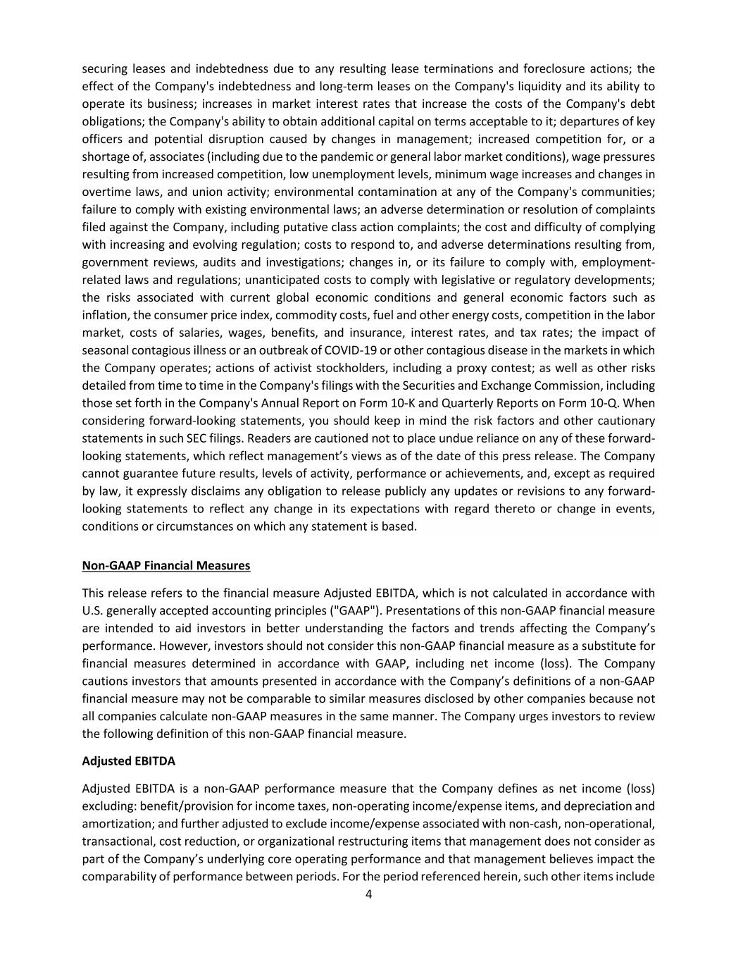 4 securing leases and indebtedness due to any resulting lease terminations and foreclosure actions; the effect of the Company's indebtedness and long-term leases on the Company's liquidity and its ability to operate its business; increases in market interest rates that increase the costs of the Company's debt obligations; the Company's ability to obtain additional capital on terms acceptable to it; departures of key officers and potential disruption caused by changes in management; increased competition for, or a shortage of, associates (including due to the pandemic or general labor market conditions), wage pressures resulting from increased competition, low unemployment levels, minimum wage increases and changes in overtime laws, and union activity; environmental contamination at any of the Company's communities; failure to comply with existing environmental laws; an adverse determination or resolution of complaints filed against the Company, including putative class action complaints; the cost and difficulty of complying with increasing and evolving regulation; costs to respond to, and adverse determinations resulting from, government reviews, audits and investigations; changes in, or its failure to comply with, employment- related laws and regulations; unanticipated costs to comply with legislative or regulatory developments; the risks associated with current global economic conditions and general economic factors such as inflation, the consumer price index, commodity costs, fuel and other energy costs, competition in the labor market, costs of salaries, wages, benefits, and insurance, interest rates, and tax rates; the impact of seasonal contagious illness or an outbreak of COVID-19 or other contagious disease in the markets in which the Company operates; actions of activist stockholders, including a proxy contest; as well as other risks detailed from time to time in the Company's filings with the Securities and Exchange Commission, including those set forth in the Company's Annual Report on Form 10-K and Quarterly Reports on Form 10-Q. When considering forward-looking statements, you should keep in mind the risk factors and other cautionary statements in such SEC filings. Readers are cautioned not to place undue reliance on any of these forward- looking statements, which reflect management’s views as of the date of this press release. The Company cannot guarantee future results, levels of activity, performance or achievements, and, except as required by law, it expressly disclaims any obligation to release publicly any updates or revisions to any forward- looking statements to reflect any change in its expectations with regard thereto or change in events, conditions or circumstances on which any statement is based. Non-GAAP Financial Measures This release refers to the financial measure Adjusted EBITDA, which is not calculated in accordance with U.S. generally accepted accounting principles ("GAAP"). Presentations of this non-GAAP financial measure are intended to aid investors in better understanding the factors and trends affecting the Company’s performance. However, investors should not consider this non-GAAP financial measure as a substitute for financial measures determined in accordance with GAAP, including net income (loss). The Company cautions investors that amounts presented in accordance with the Company’s definitions of a non-GAAP financial measure may not be comparable to similar measures disclosed by other companies because not all companies calculate non-GAAP measures in the same manner. The Company urges investors to review the following definition of this non-GAAP financial measure. Adjusted EBITDA Adjusted EBITDA is a non-GAAP performance measure that the Company defines as net income (loss) excluding: benefit/provision for income taxes, non-operating income/expense items, and depreciation and amortization; and further adjusted to exclude income/expense associated with non-cash, non-operational, transactional, cost reduction, or organizational restructuring items that management does not consider as part of the Company’s underlying core operating performance and that management believes impact the comparability of performance between periods. For the period referenced herein, such other items include