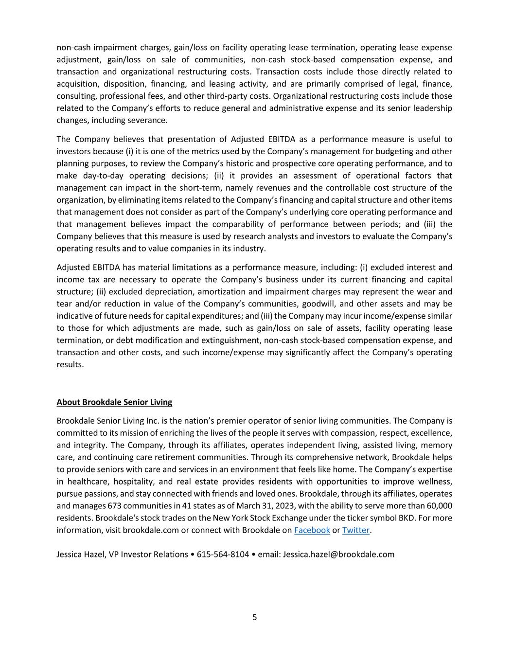 5 non-cash impairment charges, gain/loss on facility operating lease termination, operating lease expense adjustment, gain/loss on sale of communities, non-cash stock-based compensation expense, and transaction and organizational restructuring costs. Transaction costs include those directly related to acquisition, disposition, financing, and leasing activity, and are primarily comprised of legal, finance, consulting, professional fees, and other third-party costs. Organizational restructuring costs include those related to the Company’s efforts to reduce general and administrative expense and its senior leadership changes, including severance. The Company believes that presentation of Adjusted EBITDA as a performance measure is useful to investors because (i) it is one of the metrics used by the Company’s management for budgeting and other planning purposes, to review the Company’s historic and prospective core operating performance, and to make day-to-day operating decisions; (ii) it provides an assessment of operational factors that management can impact in the short-term, namely revenues and the controllable cost structure of the organization, by eliminating items related to the Company’s financing and capital structure and other items that management does not consider as part of the Company’s underlying core operating performance and that management believes impact the comparability of performance between periods; and (iii) the Company believes that this measure is used by research analysts and investors to evaluate the Company’s operating results and to value companies in its industry. Adjusted EBITDA has material limitations as a performance measure, including: (i) excluded interest and income tax are necessary to operate the Company’s business under its current financing and capital structure; (ii) excluded depreciation, amortization and impairment charges may represent the wear and tear and/or reduction in value of the Company’s communities, goodwill, and other assets and may be indicative of future needs for capital expenditures; and (iii) the Company may incur income/expense similar to those for which adjustments are made, such as gain/loss on sale of assets, facility operating lease termination, or debt modification and extinguishment, non-cash stock-based compensation expense, and transaction and other costs, and such income/expense may significantly affect the Company’s operating results. About Brookdale Senior Living Brookdale Senior Living Inc. is the nation’s premier operator of senior living communities. The Company is committed to its mission of enriching the lives of the people it serves with compassion, respect, excellence, and integrity. The Company, through its affiliates, operates independent living, assisted living, memory care, and continuing care retirement communities. Through its comprehensive network, Brookdale helps to provide seniors with care and services in an environment that feels like home. The Company’s expertise in healthcare, hospitality, and real estate provides residents with opportunities to improve wellness, pursue passions, and stay connected with friends and loved ones. Brookdale, through its affiliates, operates and manages 673 communities in 41 states as of March 31, 2023, with the ability to serve more than 60,000 residents. Brookdale's stock trades on the New York Stock Exchange under the ticker symbol BKD. For more information, visit brookdale.com or connect with Brookdale on Facebook or Twitter. Jessica Hazel, VP Investor Relations • 615-564-8104 • email: Jessica.hazel@brookdale.com