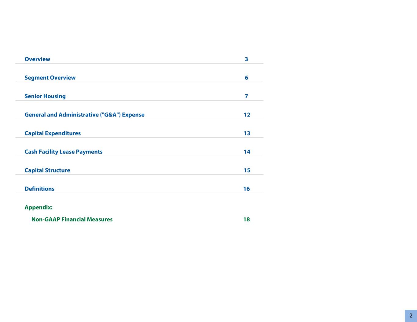 2 Overview 3 Segment Overview 6 Senior Housing 7 General and Administrative ("G&A") Expense 12 Capital Expenditures 13 Cash Facility Lease Payments 14 Capital Structure 15 Definitions 16 Appendix: Non-GAAP Financial Measures 18 Table of Contents