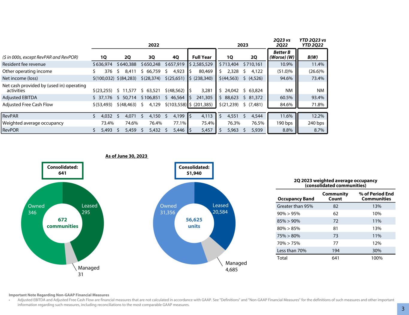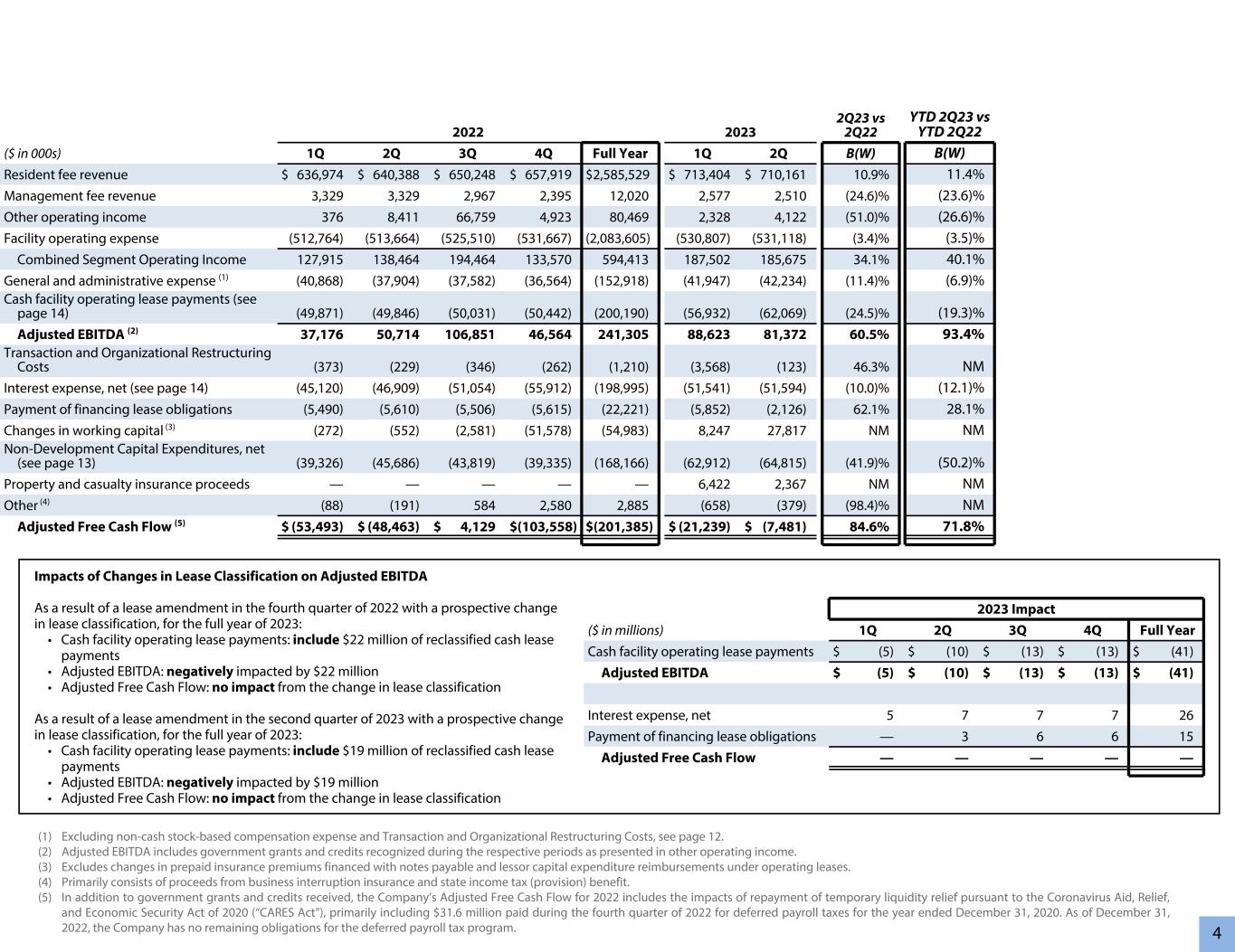 3 Managed 4,685 Owned 31,356 Leased 20,584 Managed 31 Owned 346 Leased 295 672 communities 56,625 units Important Note Regarding Non-GAAP Financial Measures • Adjusted EBITDA and Adjusted Free Cash Flow are financial measures that are not calculated in accordance with GAAP. See "Definitions" and "Non-GAAP Financial Measures" for the definitions of such measures and other important information regarding such measures, including reconciliations to the most comparable GAAP measures. 2022 2023 2Q23 vs 2Q22 YTD 2Q23 vs YTD 2Q22 ($ in 000s, except RevPAR and RevPOR) 1Q 2Q 3Q 4Q Full Year 1Q 2Q Better B (Worse) (W) B(W) Resident fee revenue $ 636,974 $ 640,388 $ 650,248 $ 657,919 $ 2,585,529 $ 713,404 $ 710,161 $ 1,423,565 10.9 % 11.4 % Other operating income $ 376 $ 8,411 $ 66,759 $ 4,923 $ 80,469 $ 2,328 $ 4,122 (51.0) % (26.6) % Net income (loss) $ (100,032) $ (84,283) $ (28,374) $ (25,651) $ (238,340) $ (44,563) $ (4,526) 94.6 % 73.4 % Net cash provided by (used in) operating activities $ (23,255) $ 11,577 $ 63,521 $ (48,562) $ 3,281 $ 24,042 $ 63,824 NM NM Adjusted EBITDA $ 37,176 $ 50,714 $ 106,851 $ 46,564 $ 241,305 $ 88,623 $ 81,372 60.5 % 93.4 % Adjusted Free Cash Flow $ (53,493) $ (48,463) $ 4,129 $ (103,558) $ (201,385) $ (21,239) $ (7,481) 84.6 % 71.8 % RevPAR $ 4,032 $ 4,071 $ 4,150 $ 4,199 $ 4,113 $ 4,551 $ 4,544 11.6 % 12.2 % Weighted average occupancy 73.4% 74.6% 76.4% 77.1% 75.4% 76.3% 76.5% 190 bps 240 bps RevPOR $ 5,493 $ 5,459 $ 5,432 $ 5,446 $ 5,457 $ 5,963 $ 5,939 8.8 % 8.7 % 2Q 2023 weighted average occupancy (consolidated communities) Occupancy Band Community Count % of Period End Communities Greater than 95% 82 13% 90% > 95% 62 10% 85% > 90% 72 11% 80% > 85% 81 13% 75% > 80% 73 11% 70% > 75% 77 12% Less than 70% 194 30% Total 641 100% Overview As of June 30, 2023 Consolidated: 51,940 Consolidated: 641