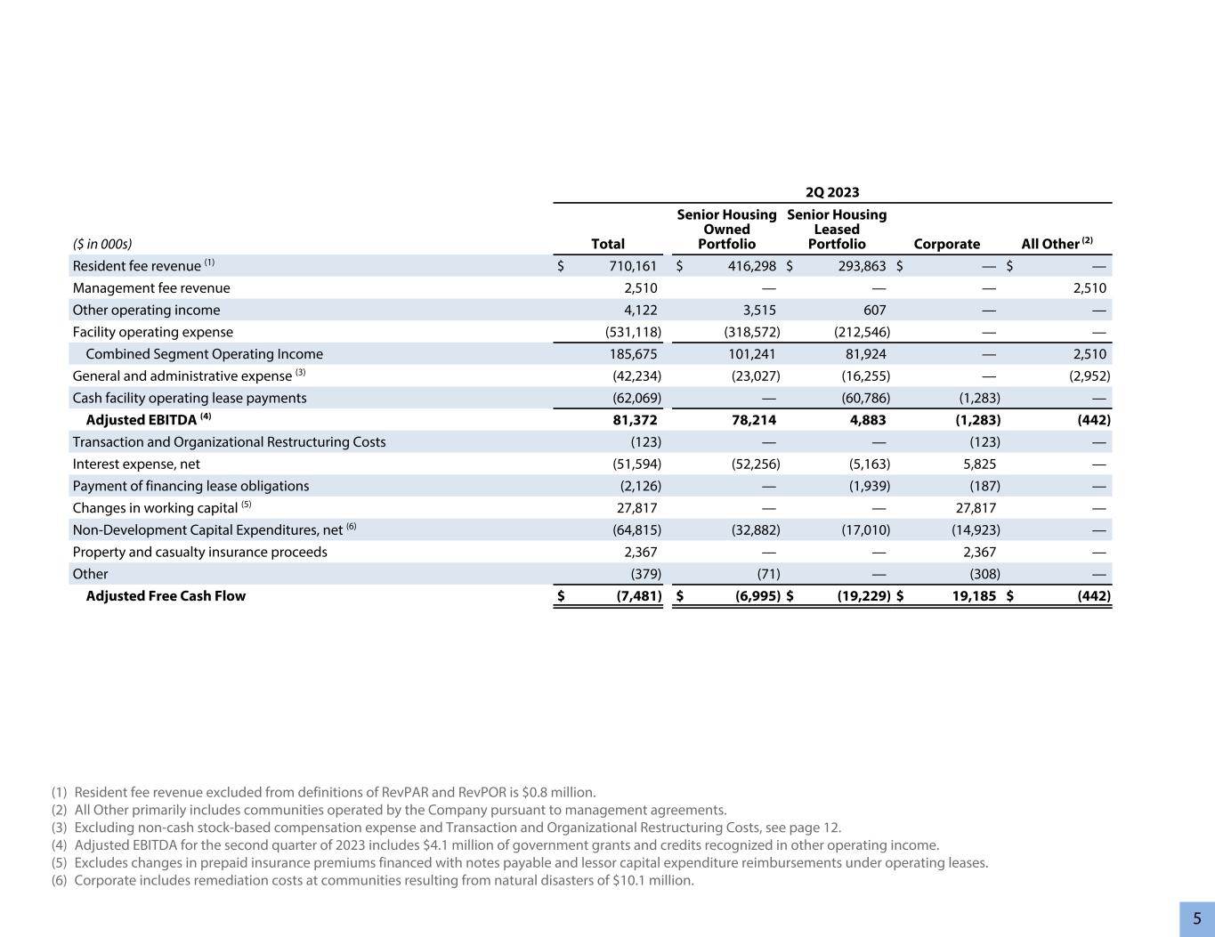 4 2022 2023 2Q23 vs 2Q22 YTD 2Q23 vs YTD 2Q22 ($ in 000s) 1Q 2Q 3Q 4Q Full Year 1Q 2Q B(W) B(W) Resident fee revenue $ 636,974 $ 640,388 $ 650,248 $ 657,919 $ 2,585,529 $ 713,404 $ 710,161 10.9 % 11.4 % Management fee revenue 3,329 3,329 2,967 2,395 12,020 2,577 2,510 (24.6) % (23.6) % Other operating income 376 8,411 66,759 4,923 80,469 2,328 4,122 (51.0) % (26.6) % Facility operating expense (512,764) (513,664) (525,510) (531,667) (2,083,605) (530,807) (531,118) (3.4) % (3.5) % Combined Segment Operating Income 127,915 138,464 194,464 133,570 594,413 187,502 185,675 34.1 % 40.1 % General and administrative expense (1) (40,868) (37,904) (37,582) (36,564) (152,918) (41,947) (42,234) (11.4) % (6.9) % Cash facility operating lease payments (see page 14) (49,871) (49,846) (50,031) (50,442) (200,190) (56,932) (62,069) (24.5) % (19.3) % Adjusted EBITDA (2) 37,176 50,714 106,851 46,564 241,305 88,623 81,372 60.5 % 93.4 % Transaction and Organizational Restructuring Costs (373) (229) (346) (262) (1,210) (3,568) (123) 46.3 % NM Interest expense, net (see page 14) (45,120) (46,909) (51,054) (55,912) (198,995) (51,541) (51,594) (10.0) % (12.1) % Payment of financing lease obligations (5,490) (5,610) (5,506) (5,615) (22,221) (5,852) (2,126) 62.1 % 28.1 % Changes in working capital (3) (272) (552) (2,581) (51,578) (54,983) 8,247 27,817 NM NM Non-Development Capital Expenditures, net (see page 13) (39,326) (45,686) (43,819) (39,335) (168,166) (62,912) (64,815) (41.9) % (50.2) % Property and casualty insurance proceeds — — — — — 6,422 2,367 NM NM Other (4) (88) (191) 584 2,580 2,885 - 6 (658) (379) (98.4) % NM Adjusted Free Cash Flow (5) $ (53,493) $ (48,463) $ 4,129 $ (103,558) $ (201,385) $ (21,239) $ (7,481) 84.6 % 71.8 % Adjusted EBITDA and Adjusted Free Cash Flow (1) Excluding non-cash stock-based compensation expense and Transaction and Organizational Restructuring Costs, see page 12. (2) Adjusted EBITDA includes government grants and credits recognized during the respective periods as presented in other operating income. (3) Excludes changes in prepaid insurance premiums financed with notes payable and lessor capital expenditure reimbursements under operating leases. (4) Primarily consists of proceeds from business interruption insurance and state income tax (provision) benefit. (5) In addition to government grants and credits received, the Company’s Adjusted Free Cash Flow for 2022 includes the impacts of repayment of temporary liquidity relief pursuant to the Coronavirus Aid, Relief, and Economic Security Act of 2020 (“CARES Act”), primarily including $31.6 million paid during the fourth quarter of 2022 for deferred payroll taxes for the year ended December 31, 2020. As of December 31, 2022, the Company has no remaining obligations for the deferred payroll tax program. 2023 Impact ($ in millions) 1Q 2Q 3Q 4Q Full Year Cash facility operating lease payments $ (5) $ (10) $ (13) $ (13) $ (41) Adjusted EBITDA $ (5) $ (10) $ (13) $ (13) $ (41) Interest expense, net 5 7 7 7 26 Payment of financing lease obligations — 3 6 6 15 Adjusted Free Cash Flow — — — — — Impacts of Changes in Lease Classification on Adjusted EBITDA As a result of a lease amendment in the fourth quarter of 2022 with a prospective change in lease classification, for the full year of 2023: • Cash facility operating lease payments: include $22 million of reclassified cash lease payments • Adjusted EBITDA: negatively impacted by $22 million • Adjusted Free Cash Flow: no impact from the change in lease classification As a result of a lease amendment in the second quarter of 2023 with a prospective change in lease classification, for the full year of 2023: • Cash facility operating lease payments: include $19 million of reclassified cash lease payments • Adjusted EBITDA: negatively impacted by $19 million • Adjusted Free Cash Flow: no impact from the change in lease classification