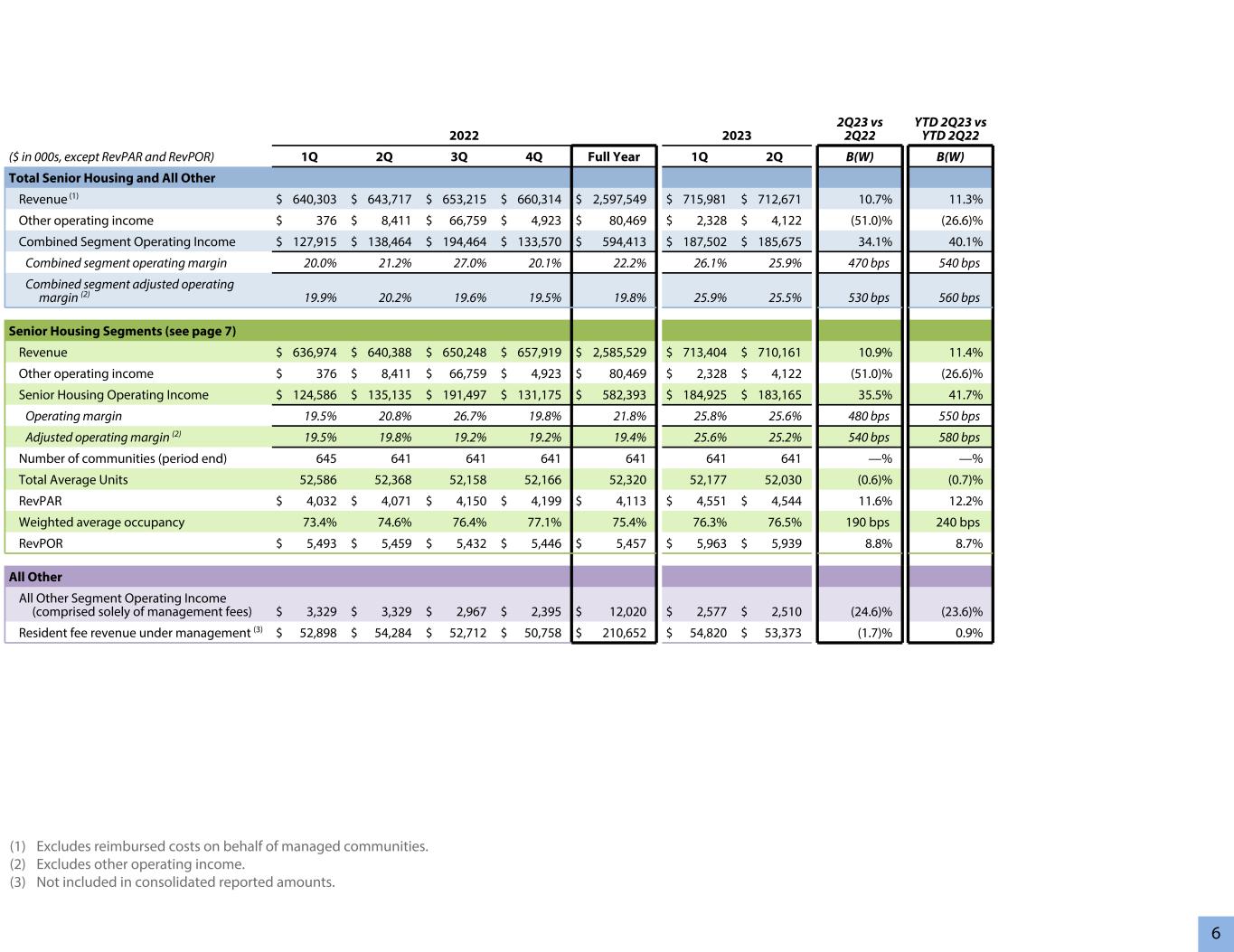 5 (1) Resident fee revenue excluded from definitions of RevPAR and RevPOR is $0.8 million. (2) All Other primarily includes communities operated by the Company pursuant to management agreements. (3) Excluding non-cash stock-based compensation expense and Transaction and Organizational Restructuring Costs, see page 12. (4) Adjusted EBITDA for the second quarter of 2023 includes $4.1 million of government grants and credits recognized in other operating income. (5) Excludes changes in prepaid insurance premiums financed with notes payable and lessor capital expenditure reimbursements under operating leases. (6) Corporate includes remediation costs at communities resulting from natural disasters of $10.1 million. 2Q 2023 ($ in 000s) Total Senior Housing Owned Portfolio Senior Housing Leased Portfolio Corporate All Other (2) Resident fee revenue (1) $ 710,161 $ 416,298 $ 293,863 $ — $ — Management fee revenue 2,510 — — — 2,510 Other operating income 4,122 3,515 607 — — Facility operating expense (531,118) (318,572) (212,546) — — Combined Segment Operating Income 185,675 101,241 81,924 — 2,510 General and administrative expense (3) (42,234) (23,027) (16,255) — (2,952) Cash facility operating lease payments (62,069) — (60,786) (1,283) — Adjusted EBITDA (4) 81,372 78,214 4,883 (1,283) (442) Transaction and Organizational Restructuring Costs (123) — — (123) — Interest expense, net (51,594) (52,256) (5,163) 5,825 — Payment of financing lease obligations (2,126) — (1,939) (187) — Changes in working capital (5) 27,817 — — 27,817 — Non-Development Capital Expenditures, net (6) (64,815) (32,882) (17,010) (14,923) — Property and casualty insurance proceeds 2,367 — — 2,367 — Other (379) (71) — (308) — Adjusted Free Cash Flow $ (7,481) $ (6,995) $ (19,229) $ 19,185 $ (442) Adjusted EBITDA and Adjusted Free Cash Flow Distribution