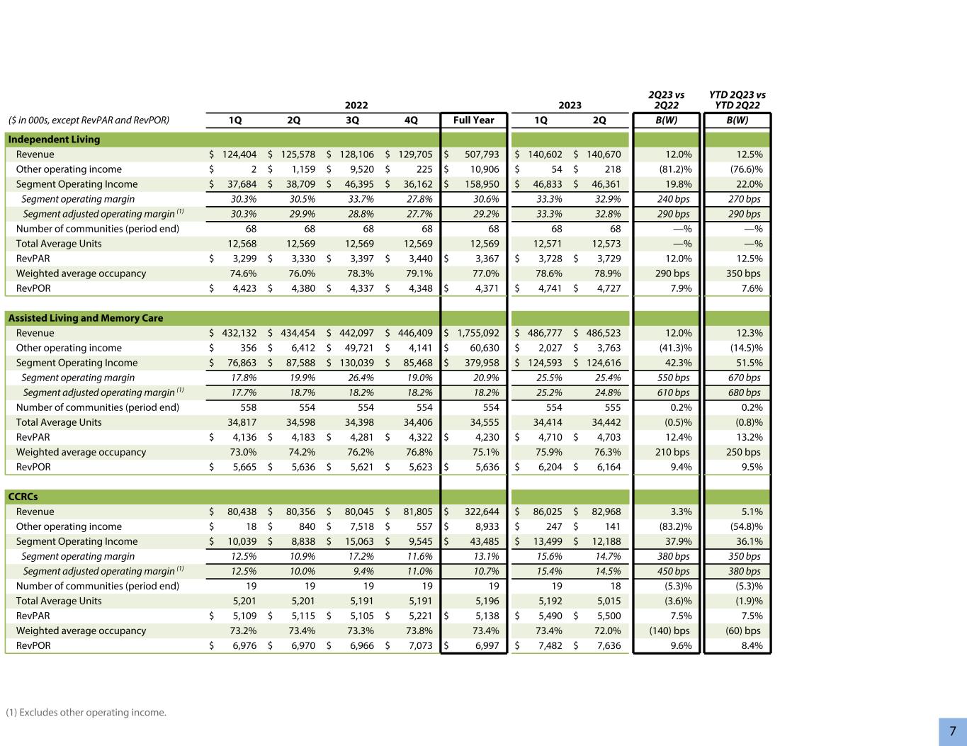 6 2022 2023 2Q23 vs 2Q22 YTD 2Q23 vs YTD 2Q22 ($ in 000s, except RevPAR and RevPOR) 1Q 2Q 3Q 4Q Full Year 1Q 2Q B(W) B(W) Total Senior Housing and All Other Revenue (1) $ 640,303 $ 643,717 $ 653,215 $ 660,314 $ 2,597,549 $ 715,981 $ 712,671 10.7 % 11.3 % Other operating income $ 376 $ 8,411 $ 66,759 $ 4,923 $ 80,469 $ 2,328 $ 4,122 (51.0) % (26.6) % Combined Segment Operating Income $ 127,915 $ 138,464 $ 194,464 $ 133,570 $ 594,413 $ 187,502 $ 185,675 34.1 % 40.1 % Combined segment operating margin 20.0 % 21.2 % 27.0 % 20.1 % 22.2 % 26.1 % 25.9 % 470 bps 540 bps Combined segment adjusted operating margin (2) 19.9 % 20.2 % 19.6 % 19.5 % 19.8 % 25.9 % 25.5 % 530 bps 560 bps Senior Housing Segments (see page 7) Revenue $ 636,974 $ 640,388 $ 650,248 $ 657,919 $ 2,585,529 $ 713,404 $ 710,161 10.9 % 11.4 % Other operating income $ 376 $ 8,411 $ 66,759 $ 4,923 $ 80,469 $ 2,328 $ 4,122 (51.0) % (26.6) % Senior Housing Operating Income $ 124,586 $ 135,135 $ 191,497 $ 131,175 $ 582,393 $ 184,925 $ 183,165 35.5 % 41.7 % Operating margin 19.5 % 20.8 % 26.7 % 19.8 % 21.8 % 25.8 % 25.6 % 480 bps 550 bps Adjusted operating margin (2) 19.5 % 19.8 % 19.2 % 19.2 % 19.4 % 25.6 % 25.2 % 540 bps 580 bps Number of communities (period end) 645 641 641 641 641 641 641 — % — % Total Average Units 52,586 52,368 52,158 52,166 52,320 52,177 52,030 (0.6) % (0.7) % RevPAR $ 4,032 $ 4,071 $ 4,150 $ 4,199 $ 4,113 $ 4,551 $ 4,544 11.6 % 12.2 % Weighted average occupancy 73.4 % 74.6 % 76.4 % 77.1 % 75.4 % 76.3 % 76.5 % 190 bps 240 bps RevPOR $ 5,493 $ 5,459 $ 5,432 $ 5,446 $ 5,457 $ 5,963 $ 5,939 8.8 % 8.7 % All Other All Other Segment Operating Income (comprised solely of management fees) $ 3,329 $ 3,329 $ 2,967 $ 2,395 $ 12,020 $ 2,577 $ 2,510 (24.6) % (23.6) % Resident fee revenue under management (3) $ 52,898 $ 54,284 $ 52,712 $ 50,758 $ 210,652 $ 54,820 $ 53,373 (1.7) % 0.9 % Segment Overview (1) Excludes reimbursed costs on behalf of managed communities. (2) Excludes other operating income. (3) Not included in consolidated reported amounts.