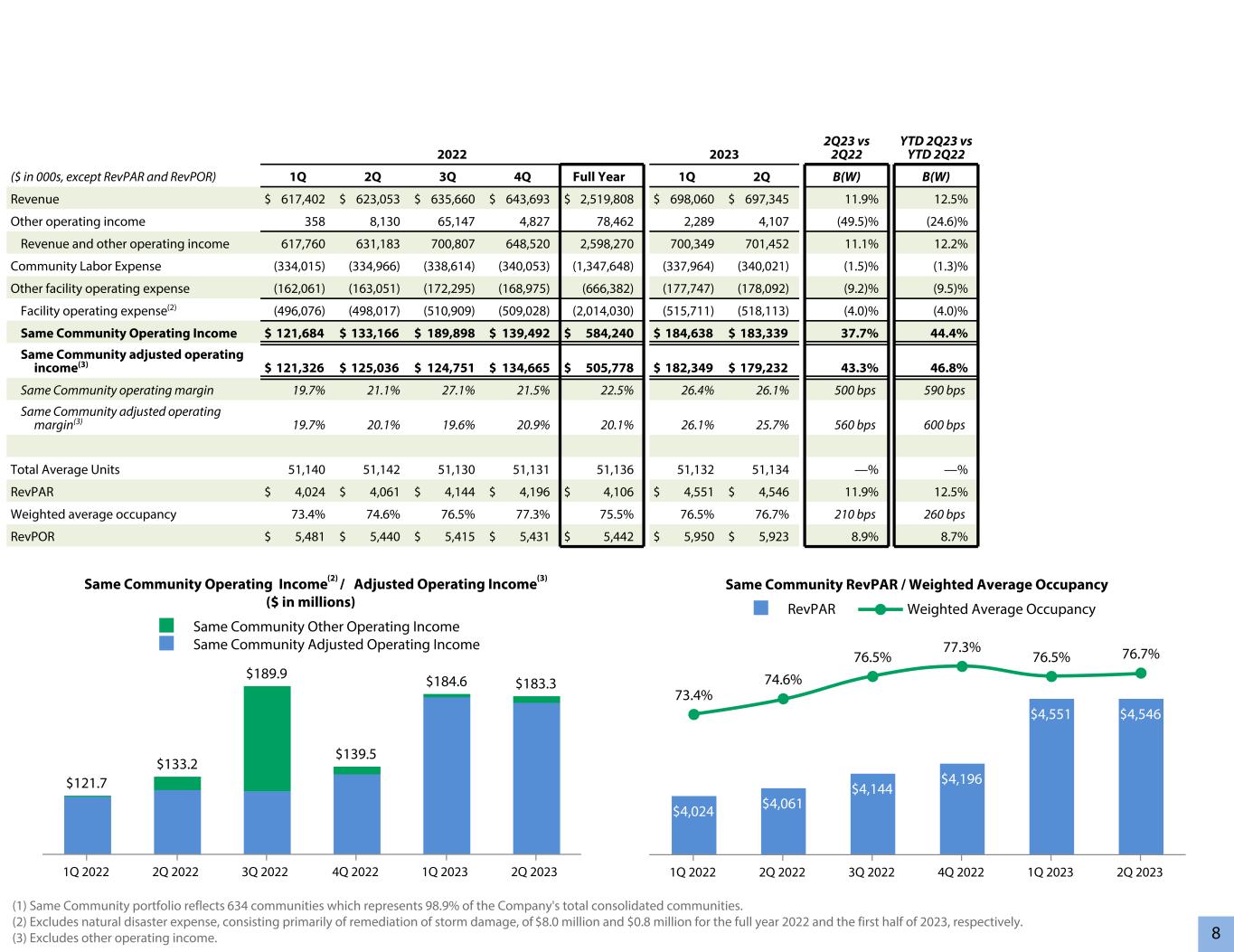 7 2022 2023 2Q23 vs 2Q22 YTD 2Q23 vs YTD 2Q22 ($ in 000s, except RevPAR and RevPOR) 1Q 2Q 3Q 4Q Full Year 1Q 2Q B(W) B(W) Independent Living Revenue $ 124,404 $ 125,578 $ 128,106 $ 129,705 $ 507,793 $ 140,602 $ 140,670 12.0 % 12.5 % Other operating income $ 2 $ 1,159 $ 9,520 $ 225 $ 10,906 $ 54 $ 218 (81.2) % (76.6) % Segment Operating Income $ 37,684 $ 38,709 $ 46,395 $ 36,162 $ 158,950 $ 46,833 $ 46,361 19.8 % 22.0 % Segment operating margin 30.3 % 30.5 % 33.7 % 27.8 % 30.6 % 33.3 % 32.9 % 240 bps 270 bps Segment adjusted operating margin (1) 30.3 % 29.9 % 28.8 % 27.7 % 29.2 % 33.3 % 32.8 % 290 bps 290 bps Number of communities (period end) 68 68 68 68 68 68 68 — % — % Total Average Units 12,568 12,569 12,569 12,569 12,569 12,571 12,573 — % — % RevPAR $ 3,299 $ 3,330 $ 3,397 $ 3,440 $ 3,367 $ 3,728 $ 3,729 12.0 % 12.5 % Weighted average occupancy 74.6 % 76.0 % 78.3 % 79.1 % 77.0 % 78.6 % 78.9 % 290 bps 350 bps RevPOR $ 4,423 $ 4,380 $ 4,337 $ 4,348 $ 4,371 $ 4,741 $ 4,727 7.9 % 7.6 % Assisted Living and Memory Care Revenue $ 432,132 $ 434,454 $ 442,097 $ 446,409 $ 1,755,092 $ 486,777 $ 486,523 12.0 % 12.3 % Other operating income $ 356 $ 6,412 $ 49,721 $ 4,141 $ 60,630 $ 2,027 $ 3,763 (41.3) % (14.5) % Segment Operating Income $ 76,863 $ 87,588 $ 130,039 $ 85,468 $ 379,958 $ 124,593 $ 124,616 42.3 % 51.5 % Segment operating margin 17.8 % 19.9 % 26.4 % 19.0 % 20.9 % 25.5 % 25.4 % 550 bps 670 bps Segment adjusted operating margin (1) 17.7 % 18.7 % 18.2 % 18.2 % 18.2 % 25.2 % 24.8 % 610 bps 680 bps Number of communities (period end) 558 554 554 554 554 554 555 0.2 % 0.2 % Total Average Units 34,817 34,598 34,398 34,406 34,555 34,414 34,442 (0.5) % (0.8) % RevPAR $ 4,136 $ 4,183 $ 4,281 $ 4,322 $ 4,230 $ 4,710 $ 4,703 12.4 % 13.2 % Weighted average occupancy 73.0 % 74.2 % 76.2 % 76.8 % 75.1 % 75.9 % 76.3 % 210 bps 250 bps RevPOR $ 5,665 $ 5,636 $ 5,621 $ 5,623 $ 5,636 $ 6,204 $ 6,164 9.4 % 9.5 % CCRCs Revenue $ 80,438 $ 80,356 $ 80,045 $ 81,805 $ 322,644 $ 86,025 $ 82,968 3.3 % 5.1 % Other operating income $ 18 $ 840 $ 7,518 $ 557 $ 8,933 $ 247 $ 141 (83.2) % (54.8) % Segment Operating Income $ 10,039 $ 8,838 $ 15,063 $ 9,545 $ 43,485 $ 13,499 $ 12,188 37.9 % 36.1 % Segment operating margin 12.5 % 10.9 % 17.2 % 11.6 % 13.1 % 15.6 % 14.7 % 380 bps 350 bps Segment adjusted operating margin (1) 12.5 % 10.0 % 9.4 % 11.0 % 10.7 % 15.4 % 14.5 % 450 bps 380 bps Number of communities (period end) 19 19 19 19 19 19 18 (5.3) % (5.3) % Total Average Units 5,201 5,201 5,191 5,191 5,196 5,192 5,015 (3.6) % (1.9) % RevPAR $ 5,109 $ 5,115 $ 5,105 $ 5,221 $ 5,138 $ 5,490 $ 5,500 7.5 % 7.5 % Weighted average occupancy 73.2 % 73.4 % 73.3 % 73.8 % 73.4 % 73.4 % 72.0 % (140) bps (60) bps RevPOR $ 6,976 $ 6,970 $ 6,966 $ 7,073 $ 6,997 $ 7,482 $ 7,636 9.6 % 8.4 % Senior Housing Segments (1) Excludes other operating income.