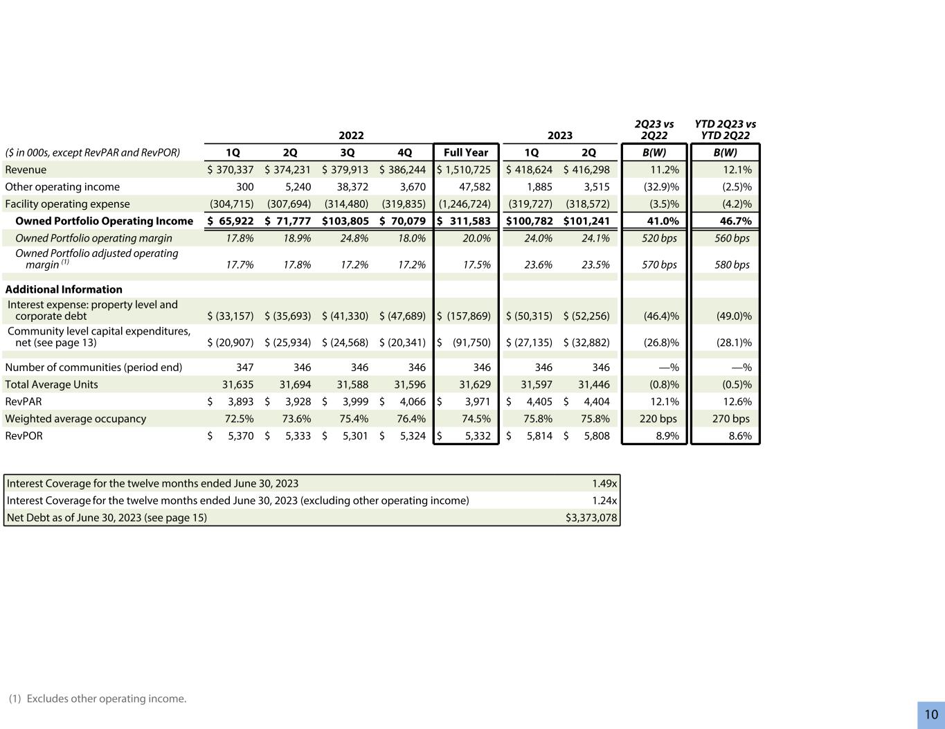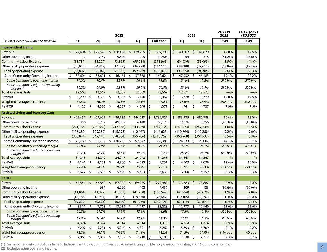 9 2022 2023 2Q23 vs 2Q22 YTD 2Q23 vs YTD 2Q22 ($ in 000s, except RevPAR and RevPOR) 1Q 2Q 3Q 4Q Full Year 1Q 2Q B(W) B(W) Independent Living Revenue $ 124,404 $ 125,578 $ 128,106 $ 129,705 $ 507,793 $ 140,602 $ 140,670 12.0 % 12.5 % Other operating income 2 1,159 9,520 225 10,906 54 218 (81.2) % (76.6) % Community Labor Expense (51,787) (53,229) (53,865) (55,084) (213,965) (54,936) (55,093) (3.5) % (4.8) % Other facility operating expense (35,015) (34,817) (37,300) (36,978) (144,110) (38,688) (39,612) (13.8) % (12.1) % Facility operating expense (86,802) (88,046) (91,165) (92,062) (358,075) (93,624) (94,705) (7.6) % (7.7) % Same Community Operating Income $ 37,604 $ 38,691 $ 46,461 $ 37,868 $ 160,624 $ 47,032 $ 46,183 19.4 % 22.2 % Same Community operating margin 30.2 % 30.5 % 33.8 % 29.1 % 31.0 % 33.4 % 32.8 % 230 bps 270 bps Same Community adjusted operating margin (2) 30.2 % 29.9 % 28.8 % 29.0 % 29.5 % 33.4 % 32.7 % 280 bps 290 bps Total Average Units 12,568 12,569 12,569 12,569 12,569 12,571 12,573 — % — % RevPAR $ 3,299 $ 3,330 $ 3,397 $ 3,440 $ 3,367 $ 3,728 $ 3,729 12.0 % 12.5 % Weighted average occupancy 74.6 % 76.0 % 78.3 % 79.1 % 77.0 % 78.6 % 78.9 % 290 bps 350 bps RevPOR $ 4,423 $ 4,380 $ 4,337 $ 4,348 $ 4,371 $ 4,741 $ 4,727 7.9 % 7.6 % Assisted Living and Memory Care Revenue $ 425,457 $ 429,625 $ 439,732 $ 444,213 $ 1,739,027 $ 483,775 $ 482,788 12.4 % 13.0 % Other operating income 356 6,287 49,337 4,140 60,120 2,026 3,756 (40.3) % (13.0) % Community Labor Expense (241,164) (239,865) (242,866) (243,239) (967,134) (241,074) (242,249) (1.0) % (0.5) % Other facility operating expense (108,880) (109,280) (115,998) (112,467) (446,625) (119,894) (119,288) (9.2) % (9.6) % Facility operating expense (350,044) (349,145) (358,864) (355,706) (1,413,759) (360,968) (361,537) (3.5) % (3.3) % Same Community Operating Income $ 75,769 $ 86,767 $ 130,205 $ 92,647 $ 385,388 $ 124,833 $ 125,007 44.1 % 53.7 % Same Community operating margin 17.8 % 19.9 % 26.6 % 20.7 % 21.4 % 25.7 % 25.7 % 580 bps 680 bps Same Community adjusted operating margin (2) 17.7 % 18.7 % 18.4 % 19.9 % 18.7 % 25.4 % 25.1 % 640 bps 710 bps Total Average Units 34,248 34,249 34,247 34,248 34,248 34,247 34,247 — % — % RevPAR $ 4,141 $ 4,181 $ 4,280 $ 4,323 $ 4,231 $ 4,709 $ 4,699 12.4 % 13.0 % Weighted average occupancy 72.9 % 74.2 % 76.2 % 76.9 % 75.1 % 75.9 % 76.3 % 210 bps 250 bps RevPOR $ 5,677 $ 5,635 $ 5,620 $ 5,623 $ 5,639 $ 6,200 $ 6,159 9.3 % 9.3 % CCRCs Revenue $ 67,541 $ 67,850 $ 67,822 $ 69,775 $ 272,988 $ 73,683 $ 73,887 8.9 % 9.0 % Other operating income — 684 6,290 462 7,436 209 133 (80.6) % (50.0) % Community Labor Expense (41,064) (41,872) (41,883) (41,730) (166,549) (41,954) (42,679) (1.9) % (2.0) % Other facility operating expense (18,166) (18,954) (18,997) (19,530) (75,647) (19,165) (19,192) (1.3) % (3.3) % Facility operating expense (59,230) (60,826) (60,880) (61,260) (242,196) (61,119) (61,871) (1.7) % (2.4) % Same Community Operating Income $ 8,311 $ 7,708 $ 13,232 $ 8,977 $ 38,228 $ 12,773 $ 12,149 57.6 % 55.6 % Same Community operating margin 12.3 % 11.2 % 17.9 % 12.8 % 13.6 % 17.3 % 16.4 % 520 bps 500 bps Same Community adjusted operating margin (2) 12.3 % 10.4 % 10.2 % 12.2 % 11.3 % 17.1 % 16.3 % 590 bps 540 bps Total Average Units 4,324 4,324 4,314 4,314 4,319 4,314 4,314 (0.2) % (0.2) % RevPAR $ 5,207 $ 5,231 $ 5,240 $ 5,391 $ 5,267 $ 5,693 $ 5,709 9.1 % 9.2 % Weighted average occupancy 73.7 % 74.1 % 74.2 % 74.8 % 74.2 % 74.5 % 74.0 % (10) bps 40 bps RevPOR $ 7,063 $ 7,059 $ 7,067 $ 7,210 $ 7,100 $ 7,638 $ 7,712 9.3 % 8.7 % Senior Housing Segments: Same Community (1) (1) Same Community portfolio reflects 68 Independent Living communities, 550 Assisted Living and Memory Care communities, and 16 CCRC communities. (2) Excludes other operating income.