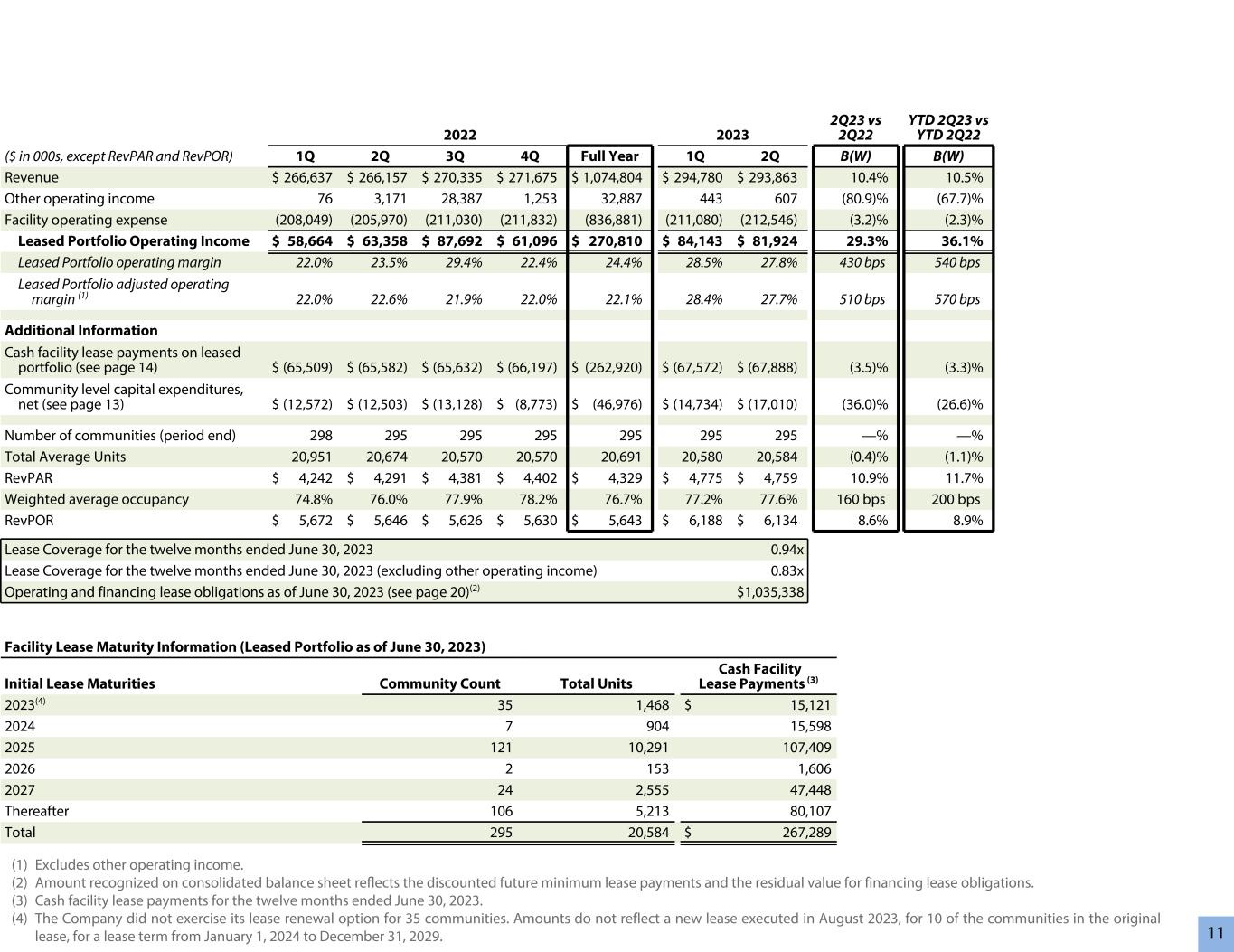 10 2022 2023 2Q23 vs 2Q22 YTD 2Q23 vs YTD 2Q22 ($ in 000s, except RevPAR and RevPOR) 1Q 2Q 3Q 4Q Full Year 1Q 2Q B(W) B(W) Revenue $ 370,337 $ 374,231 $ 379,913 $ 386,244 $ 1,510,725 $ 418,624 $ 416,298 11.2 % 12.1 % Other operating income 300 5,240 38,372 3,670 47,582 1,885 3,515 (32.9) % (2.5) % Facility operating expense (304,715) (307,694) (314,480) (319,835) (1,246,724) (319,727) (318,572) (3.5) % (4.2) % Owned Portfolio Operating Income $ 65,922 $ 71,777 $ 103,805 $ 70,079 $ 311,583 $ 100,782 $ 101,241 41.0 % 46.7 % Owned Portfolio operating margin 17.8 % 18.9 % 24.8 % 18.0 % 20.0 % 24.0 % 24.1 % 520 bps 560 bps Owned Portfolio adjusted operating margin (1) 17.7 % 17.8 % 17.2 % 17.2 % 17.5 % 23.6 % 23.5 % 570 bps 580 bps Additional Information Interest expense: property level and corporate debt $ (33,157) $ (35,693) $ (41,330) $ (47,689) $ (157,869) $ (50,315) $ (52,256) (46.4) % (49.0) % Community level capital expenditures, net (see page 13) $ (20,907) $ (25,934) $ (24,568) $ (20,341) $ (91,750) $ (27,135) $ (32,882) (26.8) % (28.1) % Number of communities (period end) 347 346 346 346 346 346 346 — % — % Total Average Units 31,635 31,694 31,588 31,596 31,629 31,597 31,446 (0.8) % (0.5) % RevPAR $ 3,893 $ 3,928 $ 3,999 $ 4,066 $ 3,971 $ 4,405 $ 4,404 12.1 % 12.6 % Weighted average occupancy 72.5 % 73.6 % 75.4 % 76.4 % 74.5 % 75.8 % 75.8 % 220 bps 270 bps RevPOR $ 5,370 $ 5,333 $ 5,301 $ 5,324 $ 5,332 $ 5,814 $ 5,808 8.9 % 8.6 % Senior Housing Owned Portfolio Interest Coverage for the twelve months ended June 30, 2023 1.49x Interest Coverage for the twelve months ended June 30, 2023 (excluding other operating income) 1.24x Net Debt as of June 30, 2023 (see page 15) $3,373,078 (1) Excludes other operating income.