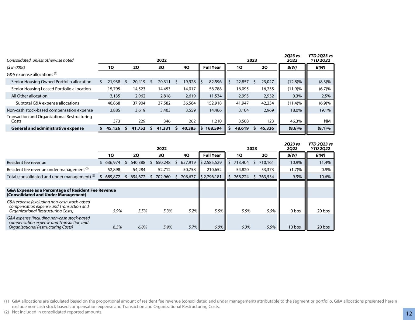 12 (1) G&A allocations are calculated based on the proportional amount of resident fee revenue (consolidated and under management) attributable to the segment or portfolio. G&A allocations presented herein exclude non-cash stock-based compensation expense and Transaction and Organizational Restructuring Costs. (2) Not included in consolidated reported amounts. Consolidated, unless otherwise noted 2022 2023 2Q23 vs 2Q22 YTD 2Q23 vs YTD 2Q22 ($ in 000s) 1Q 2Q 3Q 4Q Full Year 1Q 2Q B(W) B(W) G&A expense allocations (1) Senior Housing Owned Portfolio allocation $ 21,938 $ 20,419 $ 20,311 $ 19,928 $ 82,596 $ 22,857 $ 23,027 (12.8) % (8.3) % Senior Housing Leased Portfolio allocation 15,795 14,523 14,453 14,017 58,788 16,095 16,255 (11.9) % (6.7) % All Other allocation 3,135 2,962 2,818 2,619 11,534 2,995 2,952 0.3 % 2.5 % Subtotal G&A expense allocations 40,868 37,904 37,582 36,564 152,918 41,947 42,234 (11.4) % (6.9) % Non-cash stock-based compensation expense 3,885 3,619 3,403 3,559 14,466 3,104 2,969 18.0 % 19.1 % Transaction and Organizational Restructuring Costs 373 229 346 262 1,210 3,568 123 46.3% NM General and administrative expense $ 45,126 $ 41,752 $ 41,331 $ 40,385 $ 168,594 $ 48,619 $ 45,326 (8.6) % (8.1) % 2022 2023 2Q23 vs 2Q22 YTD 2Q23 vs YTD 2Q22 1Q 2Q 3Q 4Q Full Year 1Q 2Q B(W) B(W) Resident fee revenue $ 636,974 $ 640,388 $ 650,248 $ 657,919 $ 2,585,529 $ 713,404 $ 710,161 10.9 % 11.4 % Resident fee revenue under management (2) 52,898 54,284 52,712 50,758 210,652 54,820 53,373 (1.7) % 0.9 % Total (consolidated and under management) (2) $ 689,872 $ 694,672 $ 702,960 $ 708,677 $ 2,796,181 $ 768,224 $ 763,534 9.9 % 10.6 % G&A Expense as a Percentage of Resident Fee Revenue (Consolidated and Under Management) G&A expense (excluding non-cash stock-based compensation expense and Transaction and Organizational Restructuring Costs) 5.9% 5.5% 5.3% 5.2% 5.5% 5.5% 5.5% 0 bps 20 bps G&A expense (including non-cash stock-based compensation expense and Transaction and Organizational Restructuring Costs) 6.5% 6.0% 5.9% 5.7% 6.0% 6.3% 5.9% 10 bps 20 bps G&A Expense