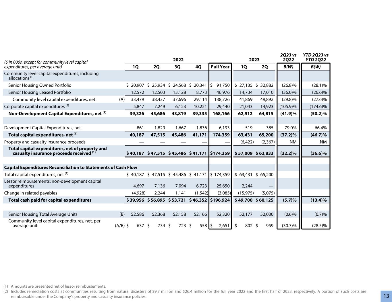 13 ($ in 000s, except for community level capital expenditures, per average unit) 2022 2023 2Q23 vs 2Q22 YTD 2Q23 vs YTD 2Q22 1Q 2Q 3Q 4Q Full Year 1Q 2Q B(W) B(W) Community level capital expenditures, including allocations (1) Senior Housing Owned Portfolio $ 20,907 $ 25,934 $ 24,568 $ 20,341 $ 91,750 $ 27,135 $ 32,882 (26.8) % (28.1) % Senior Housing Leased Portfolio 12,572 12,503 13,128 8,773 46,976 14,734 17,010 (36.0) % (26.6) % Community level capital expenditures, net (A) 33,479 38,437 37,696 29,114 138,726 41,869 49,892 (29.8) % (27.6) % Corporate capital expenditures (2) 5,847 7,249 6,123 10,221 29,440 21,043 14,923 (105.9) % (174.6) % Non-Development Capital Expenditures, net (1) 39,326 45,686 43,819 39,335 168,166 62,912 64,815 (41.9) % (50.2) % Development Capital Expenditures, net 861 1,829 1,667 1,836 6,193 519 385 79.0 % 66.4 % Total capital expenditures, net (1) 40,187 47,515 45,486 41,171 174,359 63,431 65,200 (37.2) % (46.7) % Property and casualty insurance proceeds — — — — — (6,422) (2,367) NM NM Total capital expenditures, net of property and casualty insurance proceeds received (1) $ 40,187 $ 47,515 $ 45,486 $ 41,171 $ 174,359 $ 57,009 $ 62,833 (32.2) % (36.6) % Capital Expenditures Reconciliation to Statements of Cash Flow Total capital expenditures, net (1) $ 40,187 $ 47,515 $ 45,486 $ 41,171 $ 174,359 $ 63,431 $ 65,200 Lessor reimbursements: non-development capital expenditures 4,697 7,136 7,094 6,723 25,650 2,244 — Change in related payables (4,928) 2,244 1,141 (1,542) (3,085) (15,975) (5,075) Total cash paid for capital expenditures $ 39,956 $ 56,895 $ 53,721 $ 46,352 $ 196,924 $ 49,700 $ 60,125 (5.7) % (13.4) % Senior Housing Total Average Units (B) 52,586 52,368 52,158 52,166 52,320 52,177 52,030 (0.6) % (0.7) % Community level capital expenditures, net, per average unit (A/B) $ 637 $ 734 $ 723 $ 558 $ 2,651 $ 802 $ 959 (30.7) % (28.5) % Capital Expenditures (1) Amounts are presented net of lessor reimbursements. (2) Includes remediation costs at communities resulting from natural disasters of $9.7 million and $26.4 million for the full year 2022 and the first half of 2023, respectively. A portion of such costs are reimbursable under the Company's property and casualty insurance policies.