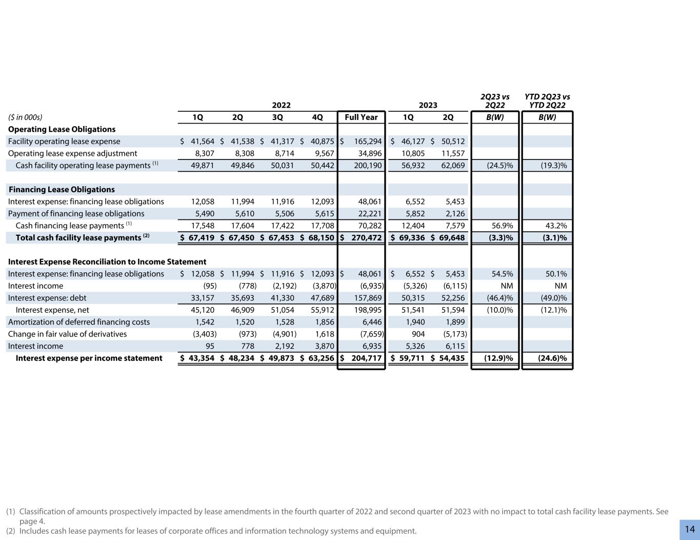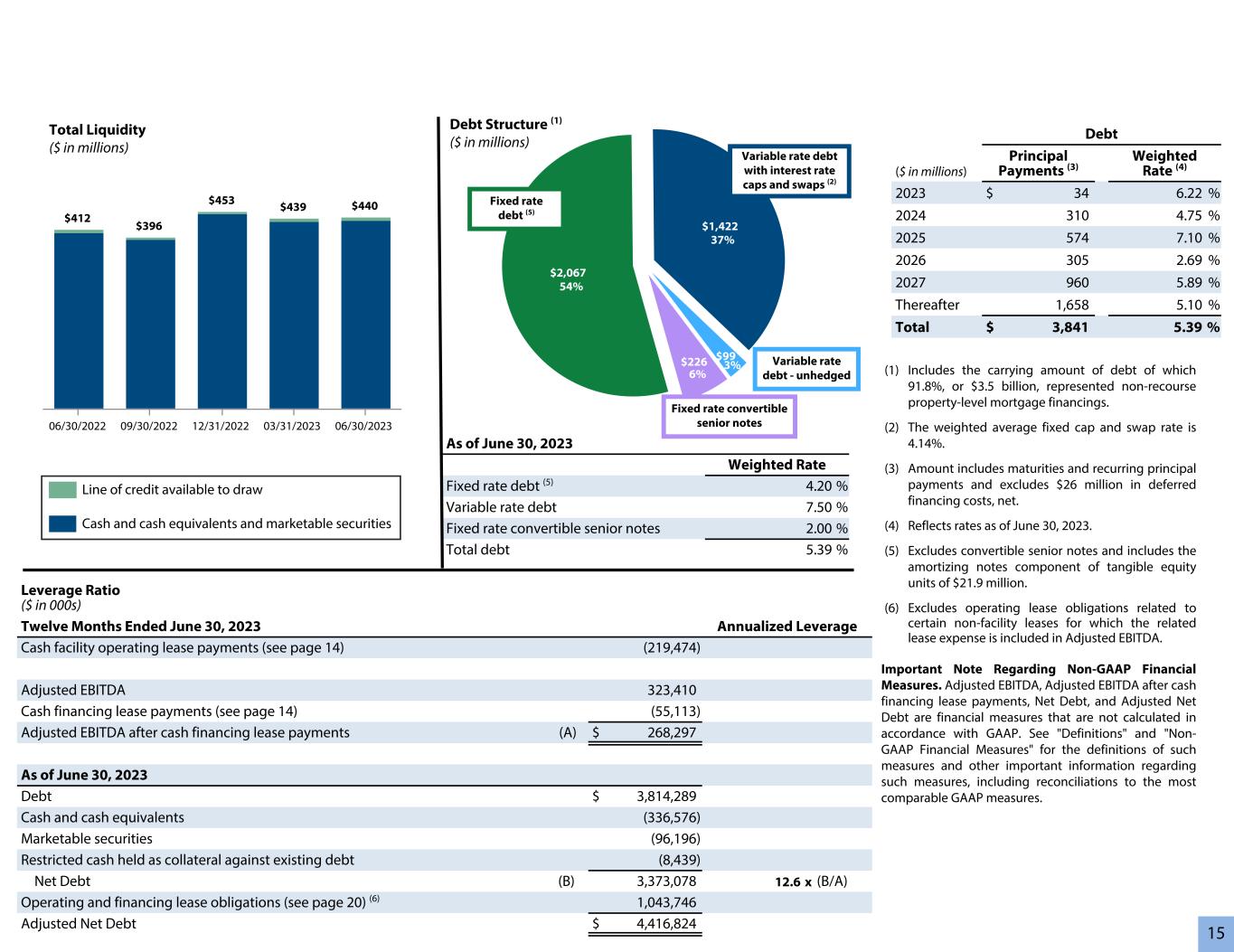 14 (1) Classification of amounts prospectively impacted by lease amendments in the fourth quarter of 2022 and second quarter of 2023 with no impact to total cash facility lease payments. See page 4. (2) Includes cash lease payments for leases of corporate offices and information technology systems and equipment. 2022 2023 2Q23 vs 2Q22 YTD 2Q23 vs YTD 2Q22 ($ in 000s) 1Q 2Q 3Q 4Q Full Year 1Q 2Q B(W) B(W) Operating Lease Obligations Facility operating lease expense $ 41,564 $ 41,538 $ 41,317 $ 40,875 $ 165,294 $ 46,127 $ 50,512 Operating lease expense adjustment 8,307 8,308 8,714 9,567 34,896 10,805 11,557 Cash facility operating lease payments (1) 49,871 49,846 50,031 50,442 200,190 56,932 62,069 (24.5) % (19.3) % Financing Lease Obligations Interest expense: financing lease obligations 12,058 11,994 11,916 12,093 48,061 6,552 5,453 Payment of financing lease obligations 5,490 5,610 5,506 5,615 22,221 5,852 2,126 Cash financing lease payments (1) 17,548 17,604 17,422 17,708 70,282 12,404 7,579 56.9 % 43.2 % Total cash facility lease payments (2) $ 67,419 $ 67,450 $ 67,453 $ 68,150 $ 270,472 $ 69,336 $ 69,648 (3.3) % (3.1) % Interest Expense Reconciliation to Income Statement Interest expense: financing lease obligations $ 12,058 $ 11,994 $ 11,916 $ 12,093 $ 48,061 $ 6,552 $ 5,453 54.5 % 50.1 % Interest income (95) (778) (2,192) (3,870) (6,935) (5,326) (6,115) NM NM Interest expense: debt 33,157 35,693 41,330 47,689 157,869 50,315 52,256 (46.4) % (49.0) % Interest expense, net 45,120 46,909 51,054 55,912 198,995 51,541 51,594 (10.0) % (12.1) % Amortization of deferred financing costs 1,542 1,520 1,528 1,856 6,446 1,940 1,899 Change in fair value of derivatives (3,403) (973) (4,901) 1,618 (7,659) 904 (5,173) Interest income 95 778 2,192 3,870 6,935 5,326 6,115 Interest expense per income statement $ 43,354 $ 48,234 $ 49,873 $ 63,256 $ 204,717 $ 59,711 $ 54,435 (12.9) % (24.6) % Cash Facility Lease Payments
