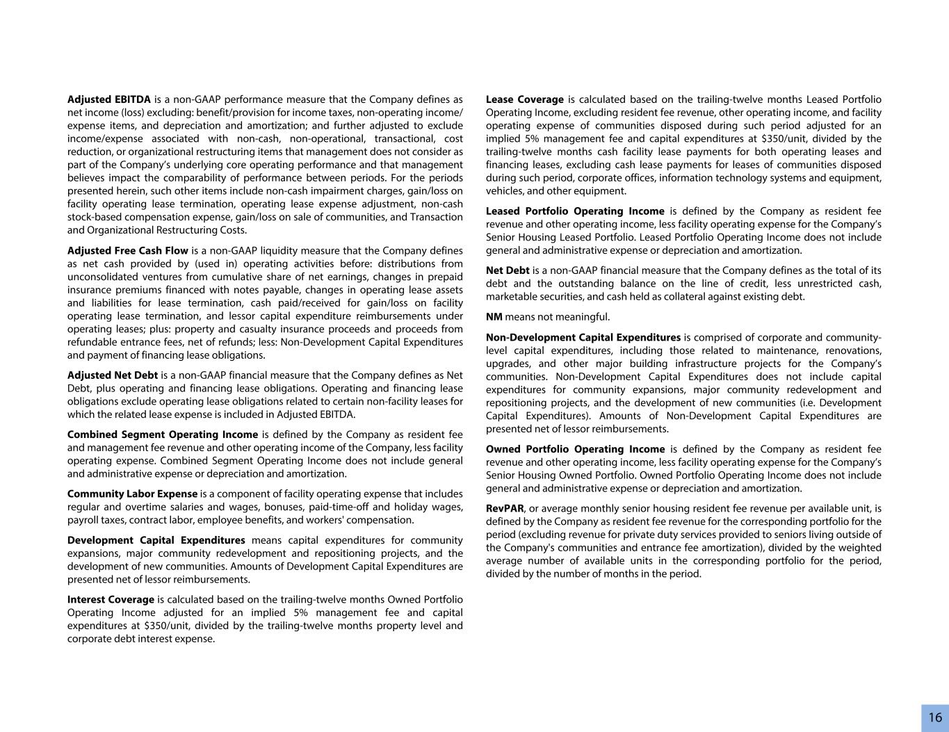 16 Adjusted EBITDA is a non-GAAP performance measure that the Company defines as net income (loss) excluding: benefit/provision for income taxes, non-operating income/ expense items, and depreciation and amortization; and further adjusted to exclude income/expense associated with non-cash, non-operational, transactional, cost reduction, or organizational restructuring items that management does not consider as part of the Company’s underlying core operating performance and that management believes impact the comparability of performance between periods. For the periods presented herein, such other items include non-cash impairment charges, gain/loss on facility operating lease termination, operating lease expense adjustment, non-cash stock-based compensation expense, gain/loss on sale of communities, and Transaction and Organizational Restructuring Costs. Adjusted Free Cash Flow is a non-GAAP liquidity measure that the Company defines as net cash provided by (used in) operating activities before: distributions from unconsolidated ventures from cumulative share of net earnings, changes in prepaid insurance premiums financed with notes payable, changes in operating lease assets and liabilities for lease termination, cash paid/received for gain/loss on facility operating lease termination, and lessor capital expenditure reimbursements under operating leases; plus: property and casualty insurance proceeds and proceeds from refundable entrance fees, net of refunds; less: Non-Development Capital Expenditures and payment of financing lease obligations. Adjusted Net Debt is a non-GAAP financial measure that the Company defines as Net Debt, plus operating and financing lease obligations. Operating and financing lease obligations exclude operating lease obligations related to certain non-facility leases for which the related lease expense is included in Adjusted EBITDA. Combined Segment Operating Income is defined by the Company as resident fee and management fee revenue and other operating income of the Company, less facility operating expense. Combined Segment Operating Income does not include general and administrative expense or depreciation and amortization. Community Labor Expense is a component of facility operating expense that includes regular and overtime salaries and wages, bonuses, paid-time-off and holiday wages, payroll taxes, contract labor, employee benefits, and workers' compensation. Development Capital Expenditures means capital expenditures for community expansions, major community redevelopment and repositioning projects, and the development of new communities. Amounts of Development Capital Expenditures are presented net of lessor reimbursements. Interest Coverage is calculated based on the trailing-twelve months Owned Portfolio Operating Income adjusted for an implied 5% management fee and capital expenditures at $350/unit, divided by the trailing-twelve months property level and corporate debt interest expense. Lease Coverage is calculated based on the trailing-twelve months Leased Portfolio Operating Income, excluding resident fee revenue, other operating income, and facility operating expense of communities disposed during such period adjusted for an implied 5% management fee and capital expenditures at $350/unit, divided by the trailing-twelve months cash facility lease payments for both operating leases and financing leases, excluding cash lease payments for leases of communities disposed during such period, corporate offices, information technology systems and equipment, vehicles, and other equipment. Leased Portfolio Operating Income is defined by the Company as resident fee revenue and other operating income, less facility operating expense for the Company’s Senior Housing Leased Portfolio. Leased Portfolio Operating Income does not include general and administrative expense or depreciation and amortization. Net Debt is a non-GAAP financial measure that the Company defines as the total of its debt and the outstanding balance on the line of credit, less unrestricted cash, marketable securities, and cash held as collateral against existing debt. NM means not meaningful. Non-Development Capital Expenditures is comprised of corporate and community- level capital expenditures, including those related to maintenance, renovations, upgrades, and other major building infrastructure projects for the Company’s communities. Non-Development Capital Expenditures does not include capital expenditures for community expansions, major community redevelopment and repositioning projects, and the development of new communities (i.e. Development Capital Expenditures). Amounts of Non-Development Capital Expenditures are presented net of lessor reimbursements. Owned Portfolio Operating Income is defined by the Company as resident fee revenue and other operating income, less facility operating expense for the Company’s Senior Housing Owned Portfolio. Owned Portfolio Operating Income does not include general and administrative expense or depreciation and amortization. RevPAR, or average monthly senior housing resident fee revenue per available unit, is defined by the Company as resident fee revenue for the corresponding portfolio for the period (excluding revenue for private duty services provided to seniors living outside of the Company's communities and entrance fee amortization), divided by the weighted average number of available units in the corresponding portfolio for the period, divided by the number of months in the period. Definitions