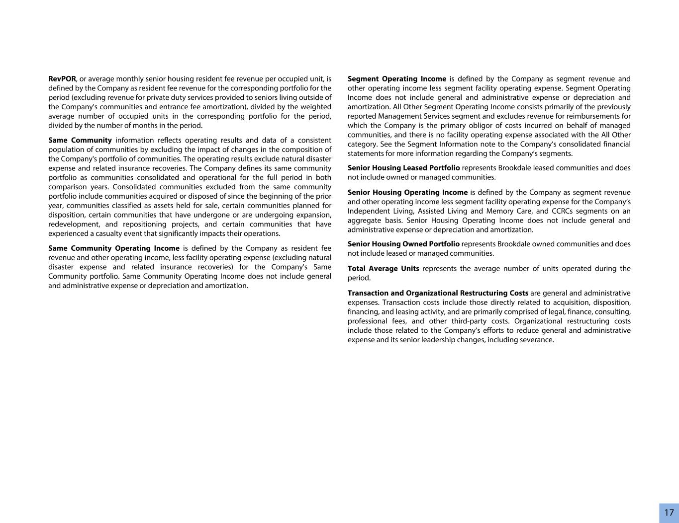 17 RevPOR, or average monthly senior housing resident fee revenue per occupied unit, is defined by the Company as resident fee revenue for the corresponding portfolio for the period (excluding revenue for private duty services provided to seniors living outside of the Company's communities and entrance fee amortization), divided by the weighted average number of occupied units in the corresponding portfolio for the period, divided by the number of months in the period. Same Community information reflects operating results and data  of a consistent population of communities by excluding the impact of changes in the composition of the Company's portfolio of communities. The operating results exclude natural disaster expense and related insurance recoveries. The Company defines its same community portfolio as communities consolidated and operational for the full period in both comparison years. Consolidated communities excluded from the same community portfolio include communities acquired or disposed of since the beginning of the prior year, communities classified as assets held for sale, certain communities planned for disposition, certain communities that have undergone or are undergoing expansion, redevelopment, and repositioning projects, and certain communities that have experienced a casualty event that significantly impacts their operations. Same Community Operating Income is defined by the Company as resident fee revenue and other operating income, less facility operating expense (excluding natural disaster expense and related insurance recoveries) for the Company's Same Community portfolio. Same Community Operating Income does not include general and administrative expense or depreciation and amortization. Segment Operating Income is defined by the Company as segment revenue and other operating income less segment facility operating expense. Segment Operating Income does not include general and administrative expense or depreciation and amortization. All Other Segment Operating Income consists primarily of the previously reported Management Services segment and excludes revenue for reimbursements for which the Company is the primary obligor of costs incurred on behalf of managed communities, and there is no facility operating expense associated with the All Other category. See the Segment Information note to the Company’s consolidated financial statements for more information regarding the Company’s segments. Senior Housing Leased Portfolio represents Brookdale leased communities and does not include owned or managed communities. Senior Housing Operating Income is defined by the Company as segment revenue and other operating income less segment facility operating expense for the Company’s Independent Living, Assisted Living and Memory Care, and CCRCs segments on an aggregate basis. Senior Housing Operating Income does not include general and administrative expense or depreciation and amortization. Senior Housing Owned Portfolio represents Brookdale owned communities and does not include leased or managed communities. Total Average Units represents the average number of units operated during the period. Transaction and Organizational Restructuring Costs are general and administrative expenses. Transaction costs include those directly related to acquisition, disposition, financing, and leasing activity, and are primarily comprised of legal, finance, consulting, professional fees, and other third-party costs. Organizational restructuring costs include those related to the Company’s efforts to reduce general and administrative expense and its senior leadership changes, including severance. Definitions