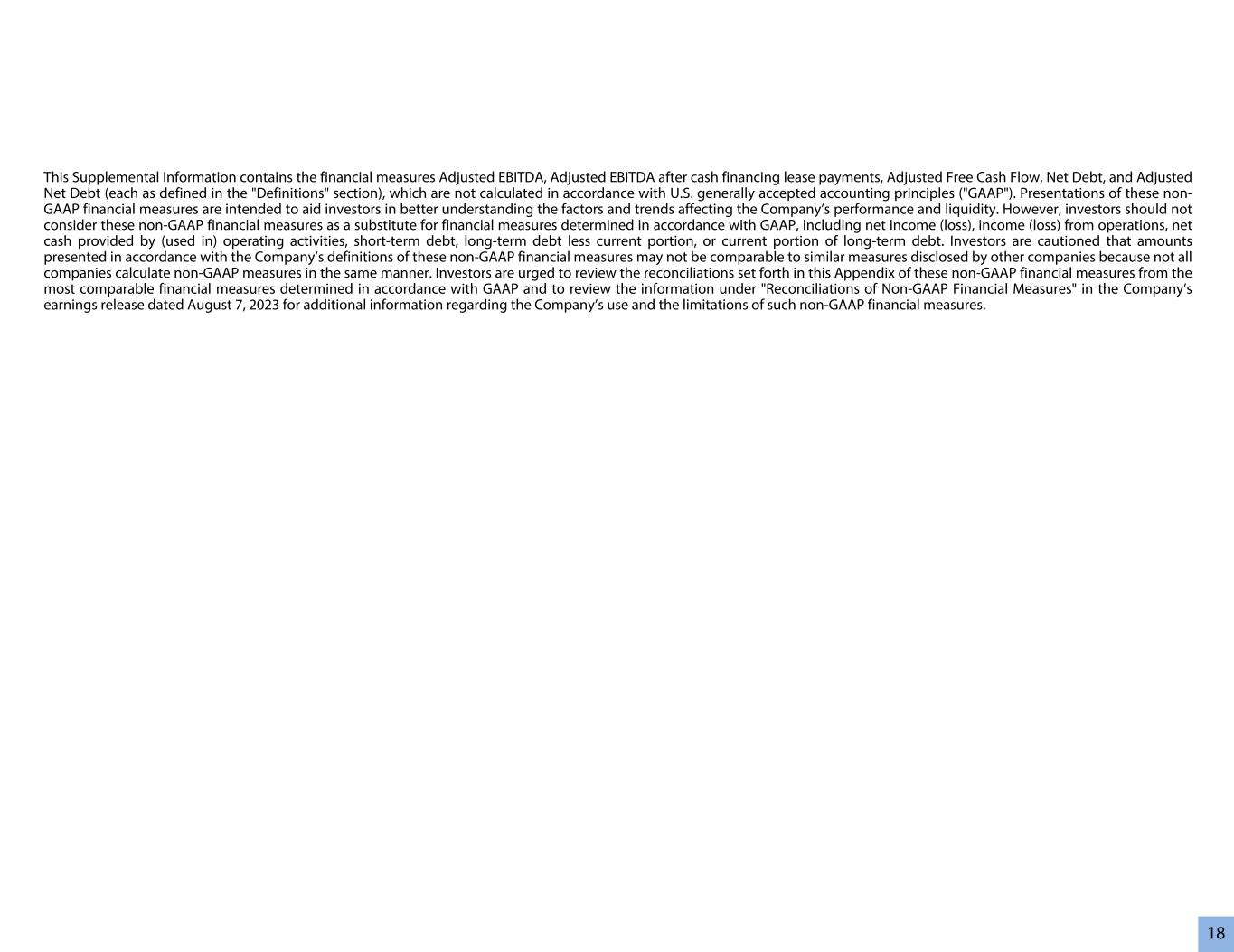 18 Appendix: Non-GAAP Financial Measures This Supplemental Information contains the financial measures Adjusted EBITDA, Adjusted EBITDA after cash financing lease payments, Adjusted Free Cash Flow, Net Debt, and Adjusted Net Debt (each as defined in the "Definitions" section), which are not calculated in accordance with U.S. generally accepted accounting principles ("GAAP"). Presentations of these non- GAAP financial measures are intended to aid investors in better understanding the factors and trends affecting the Company’s performance and liquidity. However, investors should not consider these non-GAAP financial measures as a substitute for financial measures determined in accordance with GAAP, including net income (loss), income (loss) from operations, net cash provided by (used in) operating activities, short-term debt, long-term debt less current portion, or current portion of long-term debt. Investors are cautioned that amounts presented in accordance with the Company’s definitions of these non-GAAP financial measures may not be comparable to similar measures disclosed by other companies because not all companies calculate non-GAAP measures in the same manner. Investors are urged to review the reconciliations set forth in this Appendix of these non-GAAP financial measures from the most comparable financial measures determined in accordance with GAAP and to review the information under "Reconciliations of Non-GAAP Financial Measures" in the Company’s earnings release dated August 7, 2023 for additional information regarding the Company’s use and the limitations of such non-GAAP financial measures.