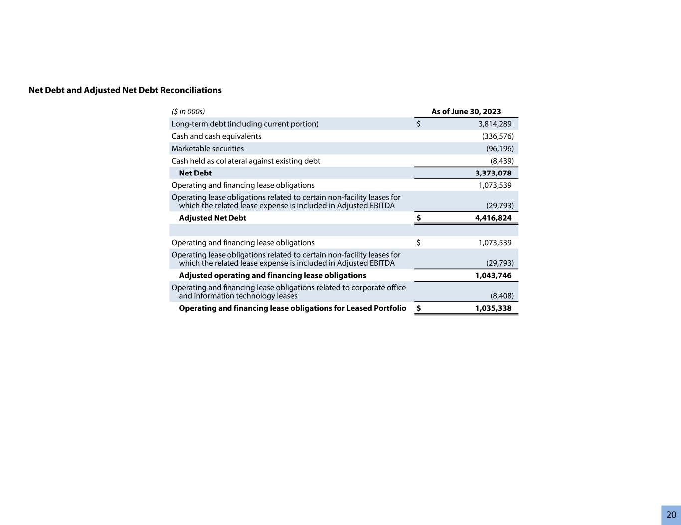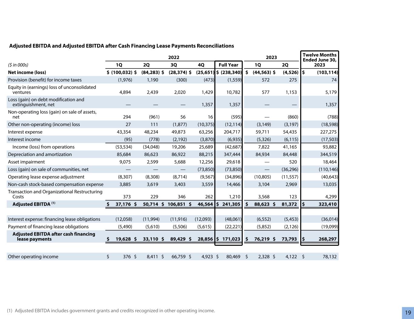 19 2022 2023 Twelve Months Ended June 30, 2023($ in 000s) 1Q 2Q 3Q 4Q Full Year 1Q 2Q Net income (loss) $ (100,032) $ (84,283) $ (28,374) $ (25,651) $ (238,340) $ (44,563) $ (4,526) $ (103,114) Provision (benefit) for income taxes (1,976) 1,190 (300) (473) (1,559) 572 275 74 Equity in (earnings) loss of unconsolidated ventures 4,894 2,439 2,020 1,429 10,782 577 1,153 5,179 Loss (gain) on debt modification and extinguishment, net — — — 1,357 1,357 — — 1,357 Non-operating loss (gain) on sale of assets, net 294 (961) 56 16 (595) — (860) (788) Other non-operating (income) loss 27 111 (1,877) (10,375) (12,114) (3,149) (3,197) (18,598) Interest expense 43,354 48,234 49,873 63,256 204,717 59,711 54,435 227,275 Interest income (95) (778) (2,192) (3,870) (6,935) (5,326) (6,115) (17,503) Income (loss) from operations (53,534) (34,048) 19,206 25,689 (42,687) 7,822 41,165 93,882 Depreciation and amortization 85,684 86,623 86,922 88,215 347,444 84,934 84,448 344,519 Asset impairment 9,075 2,599 5,688 12,256 29,618 — 520 18,464 Loss (gain) on sale of communities, net — — — (73,850) (73,850) — (36,296) (110,146) Operating lease expense adjustment (8,307) (8,308) (8,714) (9,567) (34,896) (10,805) (11,557) (40,643) Non-cash stock-based compensation expense 3,885 3,619 3,403 3,559 14,466 3,104 2,969 13,035 Transaction and Organizational Restructuring Costs 373 229 346 262 1,210 3,568 123 4,299 Adjusted EBITDA (1) $ 37,176 $ 50,714 $ 106,851 $ 46,564 $ 241,305 $ 88,623 $ 81,372 $ 323,410 Interest expense: financing lease obligations (12,058) (11,994) (11,916) (12,093) (48,061) (6,552) (5,453) (36,014) Payment of financing lease obligations (5,490) (5,610) (5,506) (5,615) (22,221) (5,852) (2,126) (19,099) Adjusted EBITDA after cash financing lease payments $ 19,628 $ 33,110 $ 89,429 $ 28,856 $ 171,023 $ 76,219 $ 73,793 $ 268,297 Other operating income $ 376 $ 8,411 $ 66,759 $ 4,923 $ 80,469 $ 2,328 $ 4,122 $ 78,132 Adjusted EBITDA and Adjusted EBITDA after Cash Financing Lease Payments Reconciliations Appendix: Non-GAAP Financial Measures (continued) (1) Adjusted EBITDA includes government grants and credits recognized in other operating income.