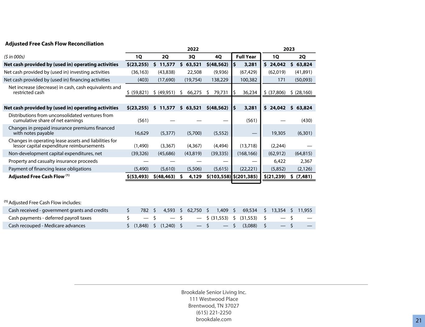 21 2022 2023 ($ in 000s) 1Q 2Q 3Q 4Q Full Year 1Q 2Q Net cash provided by (used in) operating activities $ (23,255) $ 11,577 $ 63,521 $ (48,562) $ 3,281 $ 24,042 $ 63,824 Net cash provided by (used in) investing activities (36,163) (43,838) 22,508 (9,936) (67,429) (62,019) (41,891) Net cash provided by (used in) financing activities (403) (17,690) (19,754) 138,229 100,382 171 (50,093) Net increase (decrease) in cash, cash equivalents and restricted cash $ (59,821) $ (49,951) $ 66,275 $ 79,731 $ 36,234 $ (37,806) $ (28,160) Net cash provided by (used in) operating activities $ (23,255) $ 11,577 $ 63,521 $ (48,562) $ 3,281 $ 24,042 $ 63,824 Distributions from unconsolidated ventures from cumulative share of net earnings (561) — — — (561) — (430) Changes in prepaid insurance premiums financed with notes payable 16,629 (5,377) (5,700) (5,552) — 19,305 (6,301) Changes in operating lease assets and liabilities for lessor capital expenditure reimbursements (1,490) (3,367) (4,367) (4,494) (13,718) (2,244) — Non-development capital expenditures, net (39,326) (45,686) (43,819) (39,335) (168,166) (62,912) (64,815) Property and casualty insurance proceeds — — — — — 6,422 2,367 Payment of financing lease obligations (5,490) (5,610) (5,506) (5,615) (22,221) (5,852) (2,126) Adjusted Free Cash Flow (1) $ (53,493) $ (48,463) $ 4,129 $ (103,558) $ (201,385) $ (21,239) $ (7,481) (1) Adjusted Free Cash Flow includes: Cash received - government grants and credits $ 782 $ 4,593 $ 62,750 $ 1,409 $ 69,534 $ 13,354 $ 11,955 Cash payments - deferred payroll taxes $ — $ — $ — $ (31,553) $ (31,553) $ — $ — Cash recouped - Medicare advances $ (1,848) $ (1,240) $ — $ — $ (3,088) $ — $ — Adjusted Free Cash Flow Reconciliation Appendix: Non-GAAP Financial Measures (continued) Brookdale Senior Living Inc. 111 Westwood Place Brentwood, TN 37027 (615) 221-2250 brookdale.com