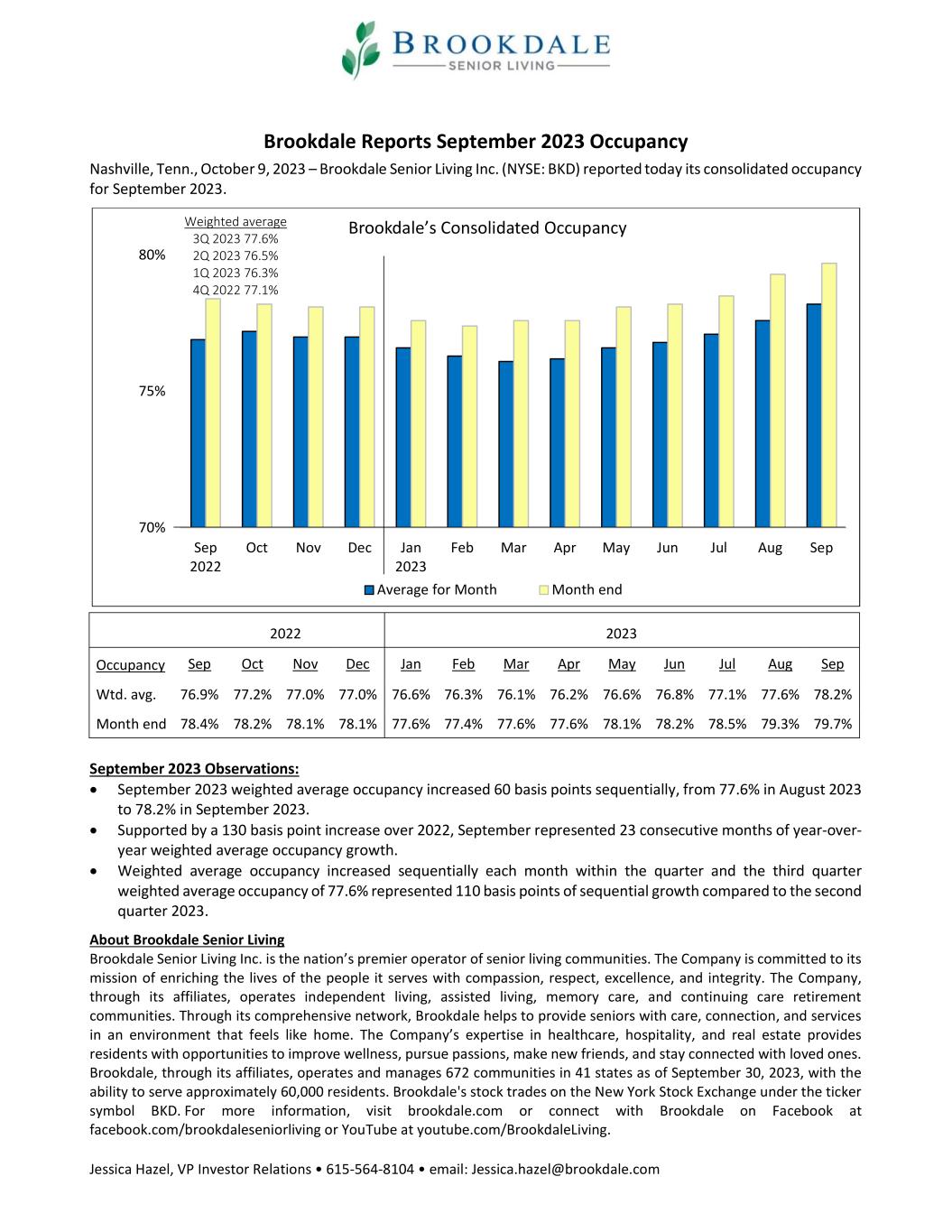 Brookdale Reports September 2023 Occupancy Nashville, Tenn., October 9, 2023 – Brookdale Senior Living Inc. (NYSE: BKD) reported today its consolidated occupancy for September 2023. 2022 2023 Occupancy Sep Oct Nov Dec Jan Feb Mar Apr May Jun Jul Aug Sep Wtd. avg. 76.9% 77.2% 77.0% 77.0% 76.6% 76.3% 76.1% 76.2% 76.6% 76.8% 77.1% 77.6% 78.2% Month end 78.4% 78.2% 78.1% 78.1% 77.6% 77.4% 77.6% 77.6% 78.1% 78.2% 78.5% 79.3% 79.7% September 2023 Observations:  September 2023 weighted average occupancy increased 60 basis points sequentially, from 77.6% in August 2023 to 78.2% in September 2023.  Supported by a 130 basis point increase over 2022, September represented 23 consecutive months of year-over- year weighted average occupancy growth.  Weighted average occupancy increased sequentially each month within the quarter and the third quarter weighted average occupancy of 77.6% represented 110 basis points of sequential growth compared to the second quarter 2023. About Brookdale Senior Living Brookdale Senior Living Inc. is the nation’s premier operator of senior living communities. The Company is committed to its mission of enriching the lives of the people it serves with compassion, respect, excellence, and integrity. The Company, through its affiliates, operates independent living, assisted living, memory care, and continuing care retirement communities. Through its comprehensive network, Brookdale helps to provide seniors with care, connection, and services in an environment that feels like home. The Company’s expertise in healthcare, hospitality, and real estate provides residents with opportunities to improve wellness, pursue passions, make new friends, and stay connected with loved ones. Brookdale, through its affiliates, operates and manages 672 communities in 41 states as of September 30, 2023, with the ability to serve approximately 60,000 residents. Brookdale's stock trades on the New York Stock Exchange under the ticker symbol BKD. For more information, visit brookdale.com or connect with Brookdale on Facebook at facebook.com/brookdaleseniorliving or YouTube at youtube.com/BrookdaleLiving. Jessica Hazel, VP Investor Relations • 615-564-8104 • email: Jessica.hazel@brookdale.com 70% 75% 80% Sep 2022 Oct Nov Dec Jan 2023 Feb Mar Apr May Jun Jul Aug Sep Average for Month Month end Weighted average 3Q 2023 77.6% 2Q 2023 76.5% 1Q 2023 76.3% 4Q 2022 77.1% Brookdale’s Consolidated Occupancy