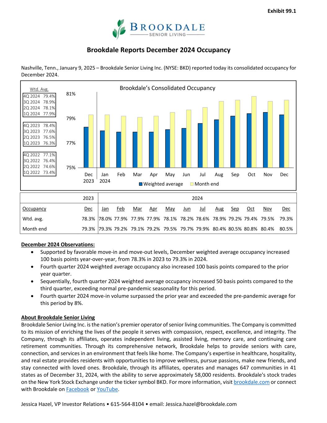 Exhibit 99.1 Brookdale Reports December 2024 Occupancy Nashville, Tenn., January 9, 2025 – Brookdale Senior Living Inc. (NYSE: BKD) reported today its consolidated occupancy for December 2024. 2023 2024 Occupancy Dec Jan Feb Mar Apr May Jun Jul Aug Sep Oct Nov Dec Wtd. avg. 78.3% 78.0% 77.9% 77.9% 77.9% 78.1% 78.2% 78.6% 78.9% 79.2% 79.4% 79.5% 79.3% Month end 79.3% 79.3% 79.2% 79.1% 79.2% 79.5% 79.7% 79.9% 80.4% 80.5% 80.8% 80.4% 80.5% December 2024 Observations: • Supported by favorable move‐in and move‐out levels, December weighted average occupancy increased 100 basis points year‐over‐year, from 78.3% in 2023 to 79.3% in 2024. • Fourth quarter 2024 weighted average occupancy also increased 100 basis points compared to the prior year quarter. • Sequentially, fourth quarter 2024 weighted average occupancy increased 50 basis points compared to the third quarter, exceeding normal pre‐pandemic seasonality for this period. • Fourth quarter 2024 move‐in volume surpassed the prior year and exceeded the pre‐pandemic average for this period by 8%. About Brookdale Senior Living Brookdale Senior Living Inc. is the nation’s premier operator of senior living communities. The Company is committed to its mission of enriching the lives of the people it serves with compassion, respect, excellence, and integrity. The Company, through its affiliates, operates independent living, assisted living, memory care, and continuing care retirement communities. Through its comprehensive network, Brookdale helps to provide seniors with care, connection, and services in an environment that feels like home. The Company’s expertise in healthcare, hospitality, and real estate provides residents with opportunities to improve wellness, pursue passions, make new friends, and stay connected with loved ones. Brookdale, through its affiliates, operates and manages 647 communities in 41 states as of December 31, 2024, with the ability to serve approximately 58,000 residents. Brookdale's stock trades on the New York Stock Exchange under the ticker symbol BKD. For more information, visit brookdale.com or connect with Brookdale on Facebook or YouTube. Jessica Hazel, VP Investor Relations • 615‐564‐8104 • email: Jessica.hazel@brookdale.com 75% 77% 79% 81% Dec 2023 Jan 2024 Feb Mar Apr May Jun Jul Aug Sep Oct Nov Dec Weighted average Month end Wtd. Avg. 4Q 2024 79.4% 3Q 2024 78.9% 2Q 2024 78.1% 1Q 2024 77.9% 4Q 2023 78.4% 3Q 2023 77.6% 2Q 2023 76.5% 1Q 2023 76.3% 4Q 2022 77.1% 3Q 2022 76.4% 2Q 2022 74.6% 1Q 2022 73.4% Brookdale’s Consolidated Occupancy