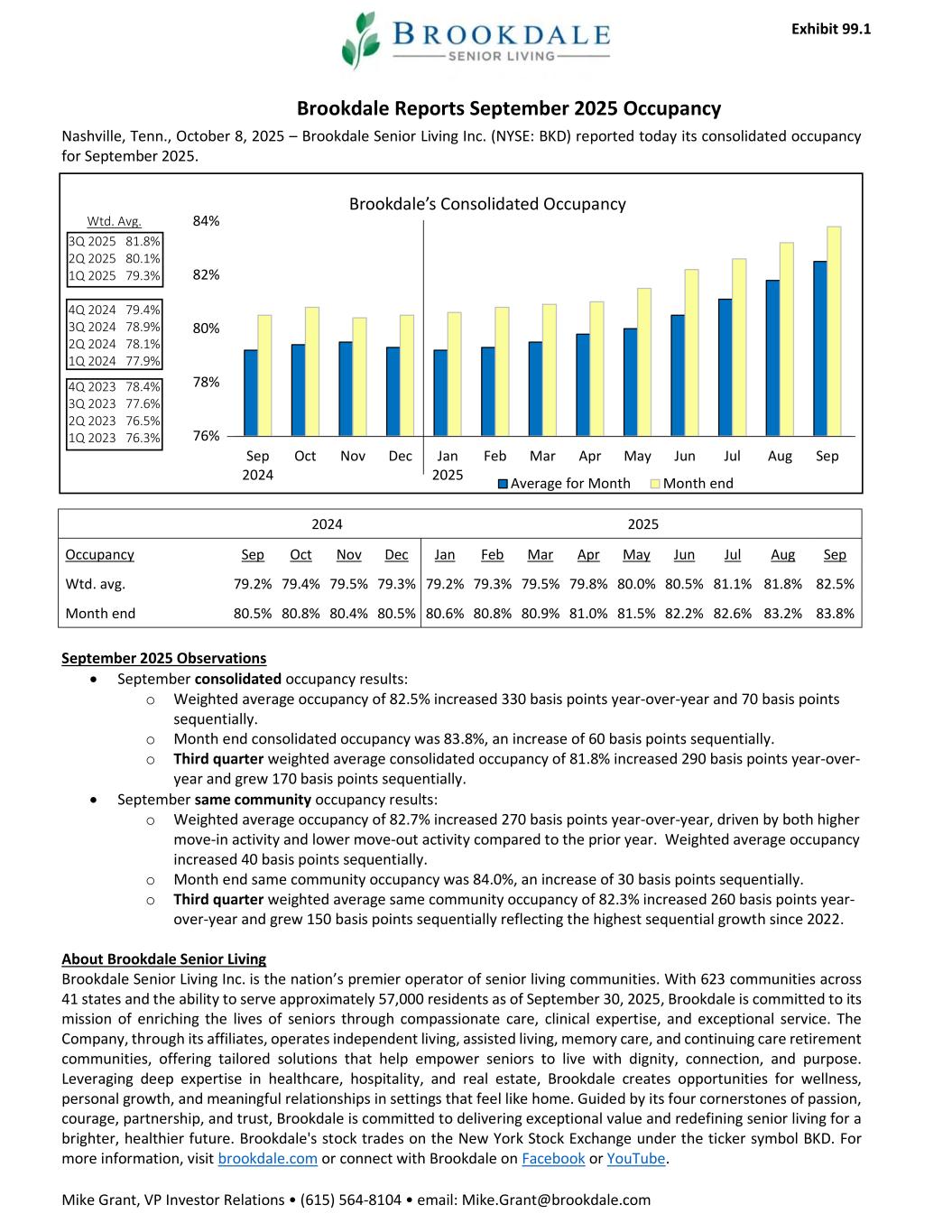Brookdale Reports September 2025 Occupancy Nashville, Tenn., October 8, 2025 – Brookdale Senior Living Inc. (NYSE: BKD) reported today its consolidated occupancy for September 2025. 2024 2025 Occupancy Sep Oct Nov Dec Jan Feb Mar Apr May Jun Jul Aug Sep Wtd. avg. 79.2% 79.4% 79.5% 79.3% 79.2% 79.3% 79.5% 79.8% 80.0% 80.5% 81.1% 81.8% 82.5% Month end 80.5% 80.8% 80.4% 80.5% 80.6% 80.8% 80.9% 81.0% 81.5% 82.2% 82.6% 83.2% 83.8% September 2025 Observations  September consolidated occupancy results: o Weighted average occupancy of 82.5% increased 330 basis points year-over-year and 70 basis points sequentially. o Month end consolidated occupancy was 83.8%, an increase of 60 basis points sequentially. o Third quarter weighted average consolidated occupancy of 81.8% increased 290 basis points year-over- year and grew 170 basis points sequentially.  September same community occupancy results: o Weighted average occupancy of 82.7% increased 270 basis points year-over-year, driven by both higher move-in activity and lower move-out activity compared to the prior year. Weighted average occupancy increased 40 basis points sequentially. o Month end same community occupancy was 84.0%, an increase of 30 basis points sequentially. o Third quarter weighted average same community occupancy of 82.3% increased 260 basis points year- over-year and grew 150 basis points sequentially reflecting the highest sequential growth since 2022. About Brookdale Senior Living Brookdale Senior Living Inc. is the nation’s premier operator of senior living communities. With 623 communities across 41 states and the ability to serve approximately 57,000 residents as of September 30, 2025, Brookdale is committed to its mission of enriching the lives of seniors through compassionate care, clinical expertise, and exceptional service. The Company, through its affiliates, operates independent living, assisted living, memory care, and continuing care retirement communities, offering tailored solutions that help empower seniors to live with dignity, connection, and purpose. Leveraging deep expertise in healthcare, hospitality, and real estate, Brookdale creates opportunities for wellness, personal growth, and meaningful relationships in settings that feel like home. Guided by its four cornerstones of passion, courage, partnership, and trust, Brookdale is committed to delivering exceptional value and redefining senior living for a brighter, healthier future. Brookdale's stock trades on the New York Stock Exchange under the ticker symbol BKD. For more information, visit brookdale.com or connect with Brookdale on Facebook or YouTube. Mike Grant, VP Investor Relations • (615) 564-8104 • email: Mike.Grant@brookdale.com 76% 78% 80% 82% 84% Sep 2024 Oct Nov Dec Jan 2025 Feb Mar Apr May Jun Jul Aug Sep Average for Month Month end Wtd. Avg. 3Q 2025 81.8% 2Q 2025 80.1% 1Q 2025 79.3% 4Q 2024 79.4% 3Q 2024 78.9% 2Q 2024 78.1% 1Q 2024 77.9% 4Q 2023 78.4% 3Q 2023 77.6% 2Q 2023 76.5% 1Q 2023 76.3% Brookdale’s Consolidated Occupancy Exhibit 99.1