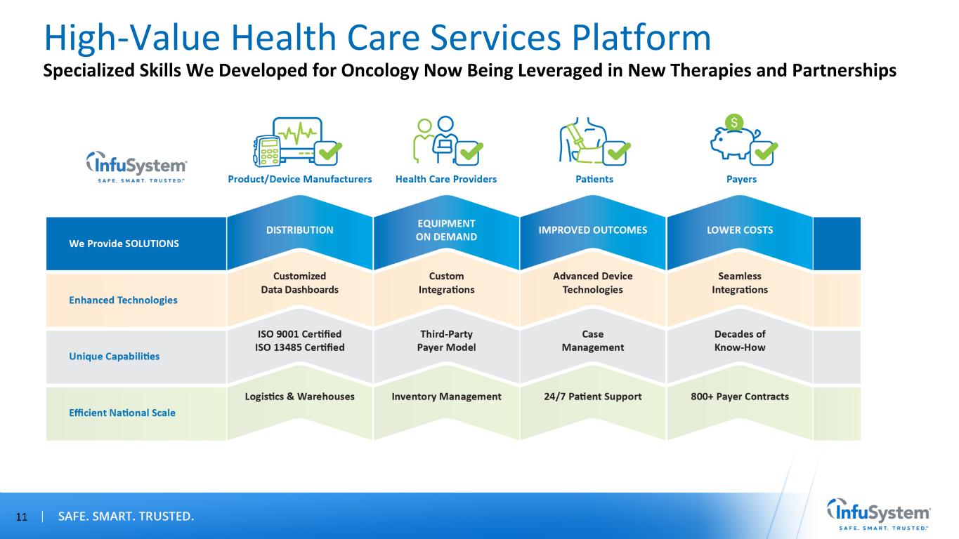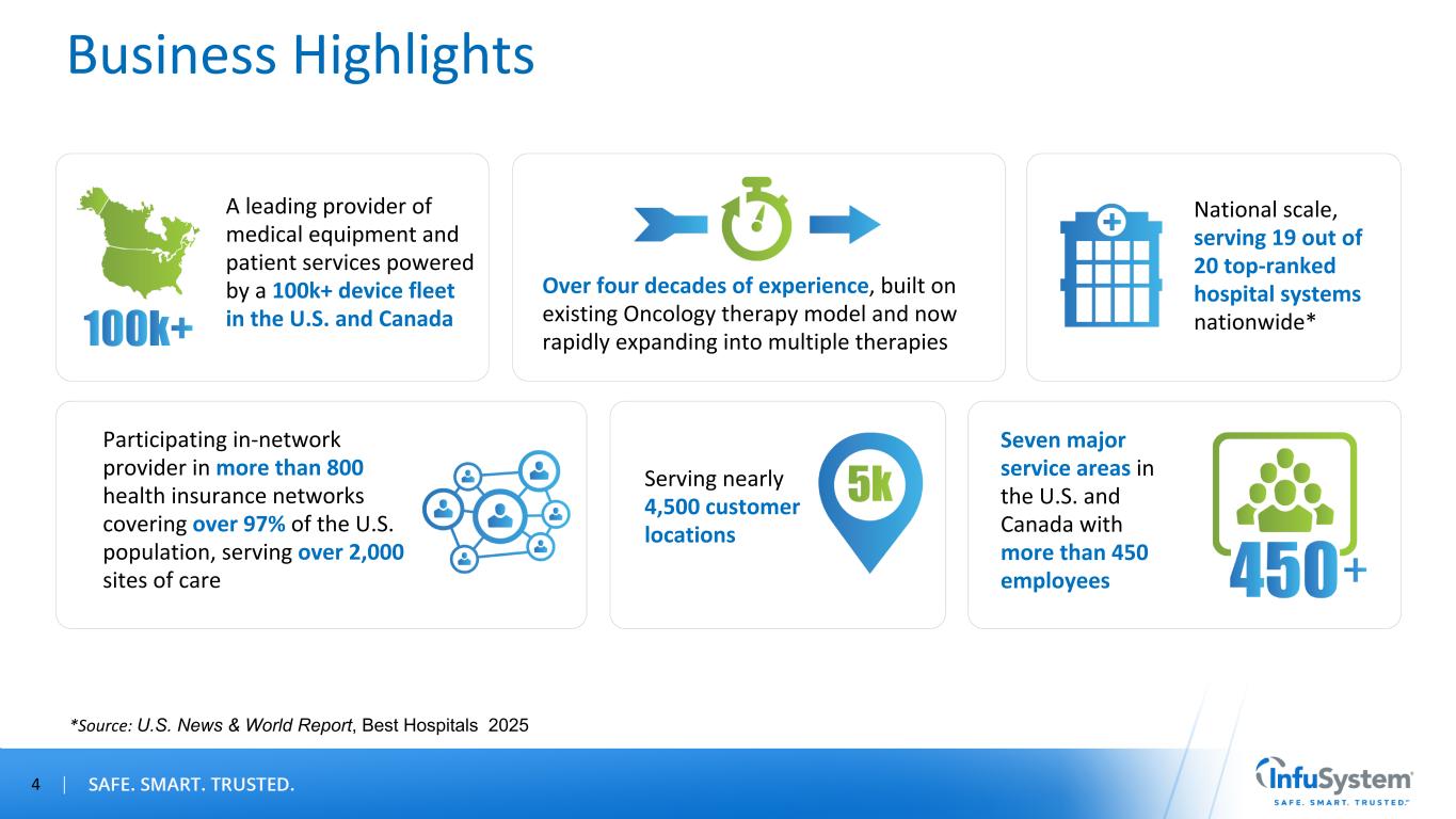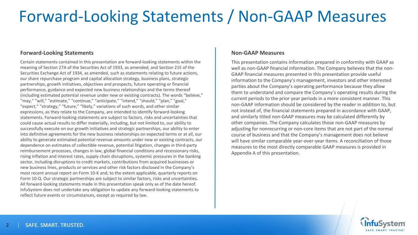 Forward-Looking Statements / Non-GAAP Measures Forward-Looking Statements Certain statements contained in this presentation are forward-looking statements within the meaning of Section 27A of the Securities Act of 1933, as amended, and Section 21E of the Securities Exchange Act of 1934, as amended, such as statements relating to future actions, our share repurchase program and capital allocation strategy, business plans, strategic partnerships, growth initiatives, objectives and prospects, future operating or financial performance, guidance and expected new business relationships and the terms thereof (including estimated potential revenue under new or existing contracts). The words “believe,” “may,” “will,” “estimate,” “continue,” “anticipate,” “intend,” “should,” “plan,” "goal," “expect,” “strategy,” “future,” “likely,” variations of such words, and other similar expressions, as they relate to the Company, are intended to identify forward-looking statements. Forward-looking statements are subject to factors, risks and uncertainties that could cause actual results to differ materially, including, but not limited to, our ability to successfully execute on our growth initiatives and strategic partnerships, our ability to enter into definitive agreements for the new business relationships on expected terms or at all, our ability to generate estimated potential revenue amounts under new or existing contracts, our dependence on estimates of collectible revenue, potential litigation, changes in third-party reimbursement processes, changes in law, global financial conditions and recessionary risks, rising inflation and interest rates, supply chain disruptions, systemic pressures in the banking sector, including disruptions to credit markets, contributions from acquired businesses or new business lines, products or services and other risk factors disclosed in the Company’s most recent annual report on Form 10-K and, to the extent applicable, quarterly reports on Form 10-Q. Our strategic partnerships are subject to similar factors, risks and uncertainties. All forward-looking statements made in this presentation speak only as of the date hereof. InfuSystem does not undertake any obligation to update any forward-looking statements to reflect future events or circumstances, except as required by law. Non-GAAP Measures This presentation contains information prepared in conformity with GAAP as well as non-GAAP financial information. The Company believes that the non- GAAP financial measures presented in this presentation provide useful information to the Company’s management, investors and other interested parties about the Company’s operating performance because they allow them to understand and compare the Company’s operating results during the current periods to the prior year periods in a more consistent manner. This non-GAAP information should be considered by the reader in addition to, but not instead of, the financial statements prepared in accordance with GAAP, and similarly titled non-GAAP measures may be calculated differently by other companies. The Company calculates those non-GAAP measures by adjusting for nonrecurring or non-core items that are not part of the normal course of business and that the Company’s management does not believe will have similar comparable year-over-year items. A reconciliation of those measures to the most directly comparable GAAP measures is provided in Appendix A of this presentation. 2