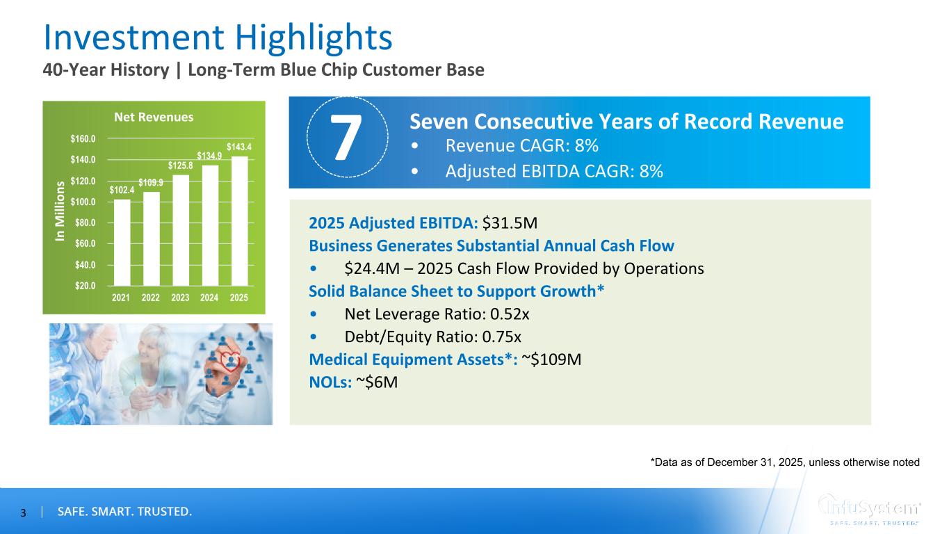 3 *Data as of December 31, 2025, unless otherwise noted 6 Investment Highlights 40-Year History | Long-Term Blue Chip Customer Base 7 Seven Consecutive Years of Record Revenue • Revenue CAGR: 8% • Adjusted EBITDA CAGR: 8% 2025 Adjusted EBITDA: $31.5M Business Generates Substantial Annual Cash Flow • $24.4M – 2025 Cash Flow Provided by Operations Solid Balance Sheet to Support Growth* • Net Leverage Ratio: 0.52x • Debt/Equity Ratio: 0.75x Medical Equipment Assets*: ~$109M NOLs: ~$6M Net Revenues In M ill io ns $102.4 $109.9 $125.8 $134.9 $143.4 2021 2022 2023 2024 2025 $20.0 $40.0 $60.0 $80.0 $100.0 $120.0 $140.0 $160.0