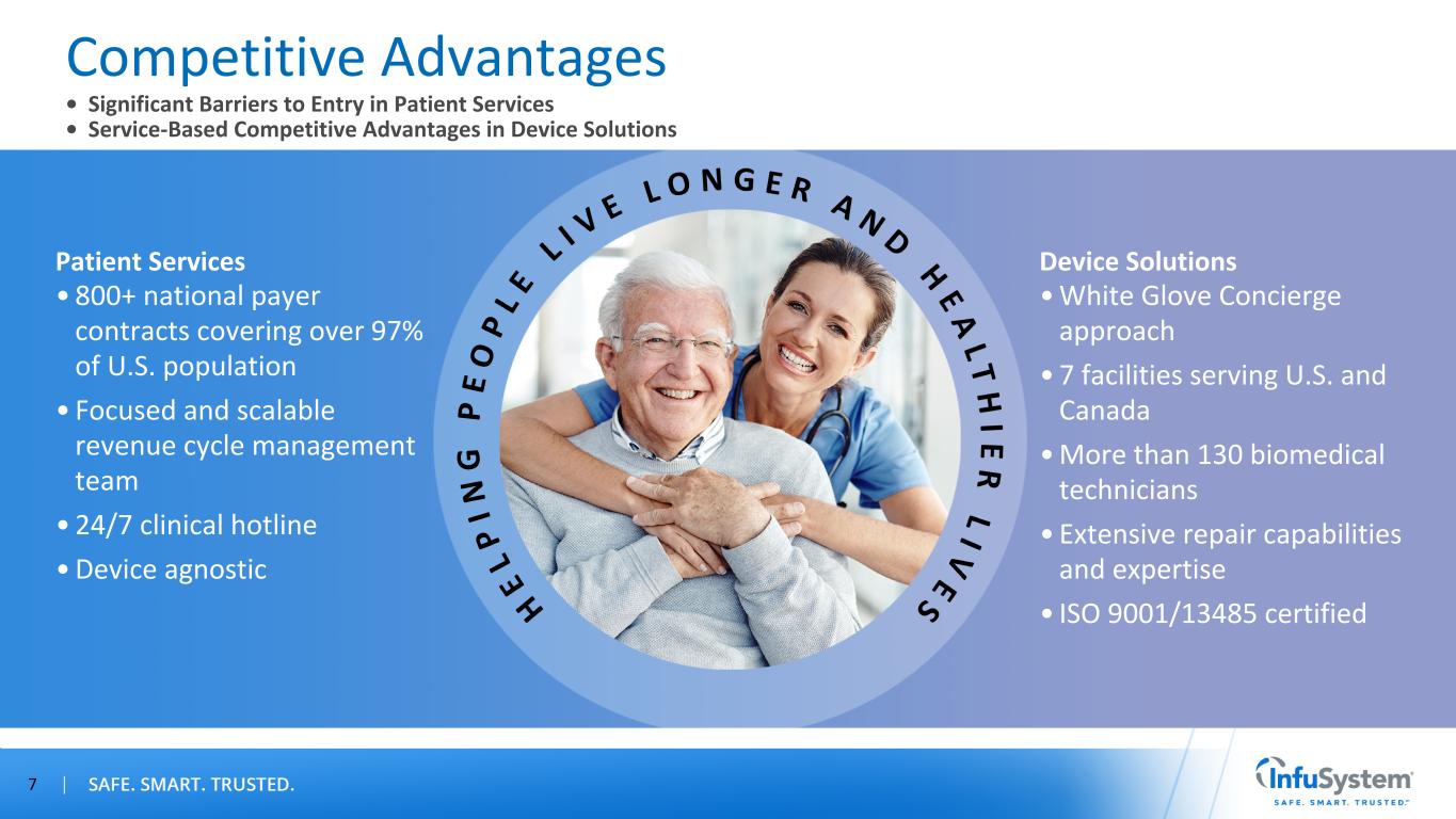 SALES BY SEGMENT Total 2025 Revenue: $143.4 Million $56.9M (40%)$86.5M (60%) Device Solutions Providing equipment, products and services to hospitals, clinics and home infusion providers Patient Services Facilitating outpatient care for patients requiring durable medical equipment Patient Services • Oncology • Pain Management • Wound Care Device Solutions • Biomedical Services • Consumables • Inventory Management • Sales, Rentals & Leasing 6