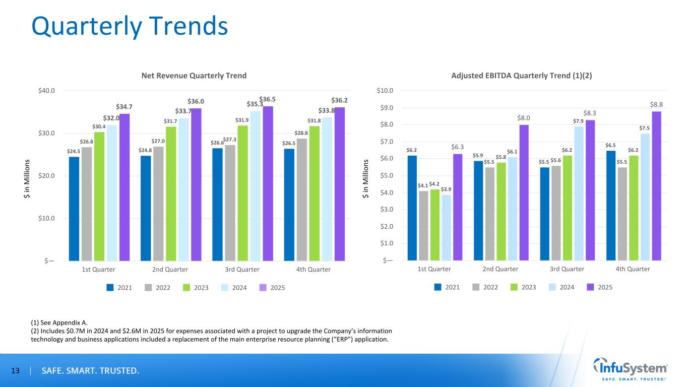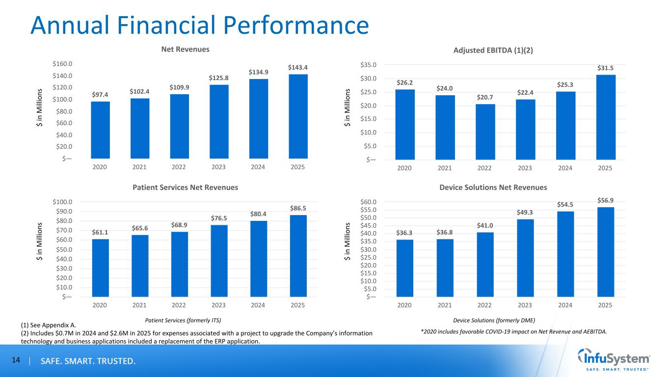 Quarterly Trends 13 Net Revenue Quarterly Trend $24.5 $24.8 $26.6 $26.5$26.8 $27.0 $27.3 $28.8 $30.4 $31.7 $31.9 $31.8$32.0 $33.7 $35.3 $33.8$34.7 $36.0 $36.5 $36.2 2021 2022 2023 2024 2025 1st Quarter 2nd Quarter 3rd Quarter 4th Quarter $— $10.0 $20.0 $30.0 $40.0 Adjusted EBITDA Quarterly Trend (1)(2) $6.2 $5.9 $5.5 $6.5 $4.1 $5.5 $5.6 $5.5 $4.2 $5.8 $6.2 $6.2 $3.9 $6.1 $7.9 $7.5 $6.3 $8.0 $8.3 $8.8 2021 2022 2023 2024 2025 1st Quarter 2nd Quarter 3rd Quarter 4th Quarter $— $1.0 $2.0 $3.0 $4.0 $5.0 $6.0 $7.0 $8.0 $9.0 $10.0 $ in M ill io ns $ in M ill io ns (1) See Appendix A. (2) Includes $0.7M in 2024 and $2.6M in 2025 for expenses associated with a project to upgrade the Company’s information technology and business applications included a replacement of the main enterprise resource planning (“ERP”) application.
