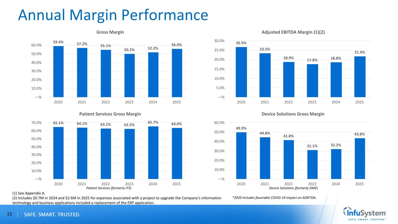 Annual Financial Performance 14 $ in M ill io ns $ in M ill io ns Net Revenues $97.4 $102.4 $109.9 $125.8 $134.9 $143.4 2020 2021 2022 2023 2024 2025 $— $20.0 $40.0 $60.0 $80.0 $100.0 $120.0 $140.0 $160.0 Adjusted EBITDA (1)(2) $26.2 $24.0 $20.7 $22.4 $25.3 $31.5 2020 2021 2022 2023 2024 2025 $— $5.0 $10.0 $15.0 $20.0 $25.0 $30.0 $35.0 Patient Services Net Revenues $61.1 $65.6 $68.9 $76.5 $80.4 $86.5 2020 2021 2022 2023 2024 2025 $— $10.0 $20.0 $30.0 $40.0 $50.0 $60.0 $70.0 $80.0 $90.0 $100.0 Device Solutions Net Revenues $36.3 $36.8 $41.0 $49.3 $54.5 $56.9 2020 2021 2022 2023 2024 2025 $— $5.0 $10.0 $15.0 $20.0 $25.0 $30.0 $35.0 $40.0 $45.0 $50.0 $55.0 $60.0 Patient Services (formerly ITS) Device Solutions (formerly DME) $ in M ill io ns $ in M ill io ns *2020 includes favorable COVID-19 impact on Net Revenue and AEBITDA. (1) See Appendix A. (2) Includes $0.7M in 2024 and $2.6M in 2025 for expenses associated with a project to upgrade the Company’s information technology and business applications included a replacement of the ERP application.