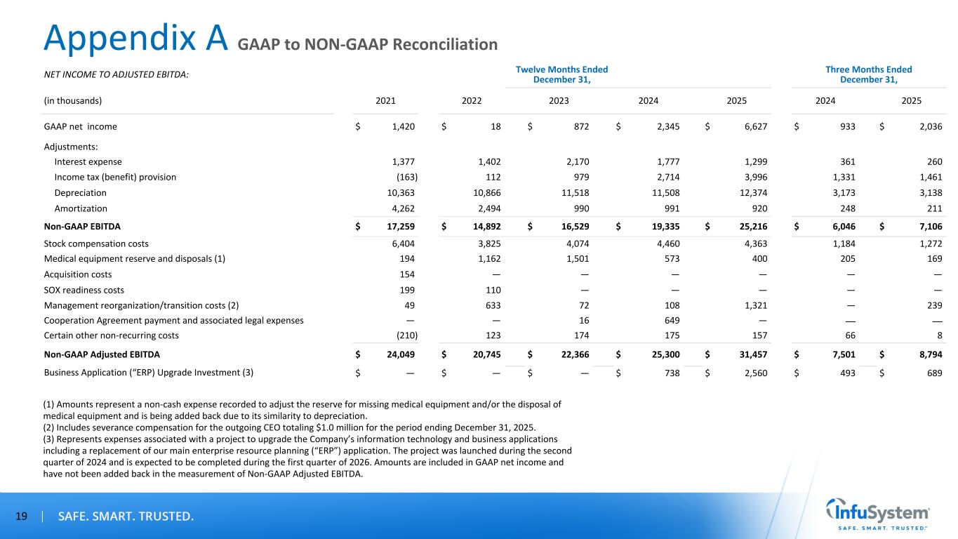 Appendix A GAAP to NON-GAAP Reconciliation NET INCOME TO ADJUSTED EBITDA: Twelve Months Ended December 31, Three Months Ended December 31, (in thousands) 2021 2022 2023 2024 2025 2024 2025 GAAP net income $ 1,420 $ 18 $ 872 $ 2,345 $ 6,627 $ 933 $ 2,036 Adjustments: Interest expense 1,377 1,402 2,170 1,777 1,299 361 260 Income tax (benefit) provision (163) 112 979 2,714 3,996 1,331 1,461 Depreciation 10,363 10,866 11,518 11,508 12,374 3,173 3,138 Amortization 4,262 2,494 990 991 920 248 211 Non-GAAP EBITDA $ 17,259 $ 14,892 $ 16,529 $ 19,335 $ 25,216 $ 6,046 $ 7,106 Stock compensation costs 6,404 3,825 4,074 4,460 4,363 1,184 1,272 Medical equipment reserve and disposals (1) 194 1,162 1,501 573 400 205 169 Acquisition costs 154 — — — — — — SOX readiness costs 199 110 — — — — — Management reorganization/transition costs (2) 49 633 72 108 1,321 — 239 Cooperation Agreement payment and associated legal expenses — — 16 649 — — — Certain other non-recurring costs (210) 123 174 175 157 66 8 Non-GAAP Adjusted EBITDA $ 24,049 $ 20,745 $ 22,366 $ 25,300 $ 31,457 $ 7,501 $ 8,794 Business Application (“ERP) Upgrade Investment (3) $ — $ — $ — $ 738 $ 2,560 $ 493 $ 689 19 (1) Amounts represent a non-cash expense recorded to adjust the reserve for missing medical equipment and/or the disposal of medical equipment and is being added back due to its similarity to depreciation. (2) Includes severance compensation for the outgoing CEO totaling $1.0 million for the period ending December 31, 2025. (3) Represents expenses associated with a project to upgrade the Company’s information technology and business applications including a replacement of our main enterprise resource planning (“ERP”) application. The project was launched during the second quarter of 2024 and is expected to be completed during the first quarter of 2026. Amounts are included in GAAP net income and have not been added back in the measurement of Non-GAAP Adjusted EBITDA.