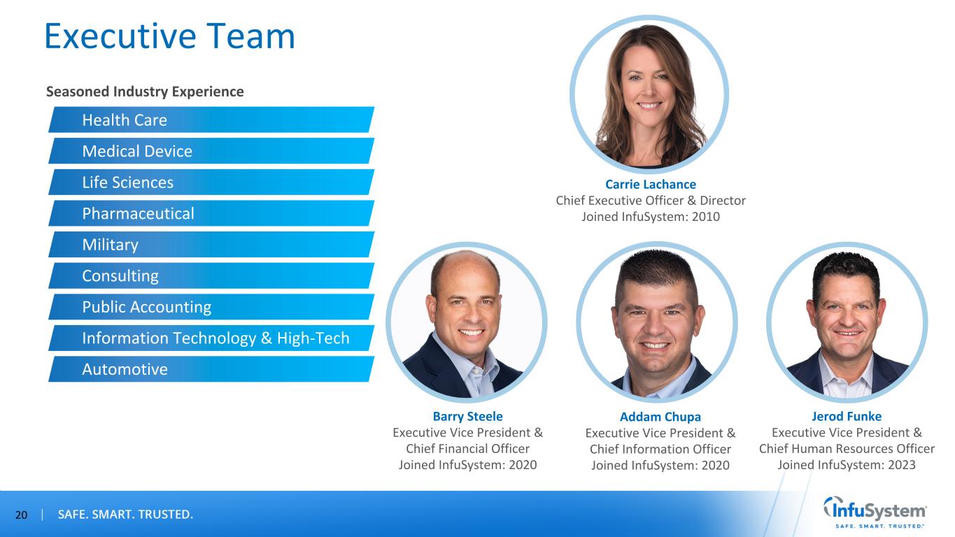 Barry Steele Executive Vice President & Chief Financial Officer Joined InfuSystem: 2020 Carrie Lachance Chief Executive Officer & Director Joined InfuSystem: 2010 Addam Chupa Executive Vice President & Chief Information Officer Joined InfuSystem: 2020 Executive Team Seasoned Industry Experience Health Care Medical Device Life Sciences Pharmaceutical Military Consulting Public Accounting Information Technology & High-Tech Automotive 20 Jerod Funke Executive Vice President & Chief Human Resources Officer Joined InfuSystem: 2023