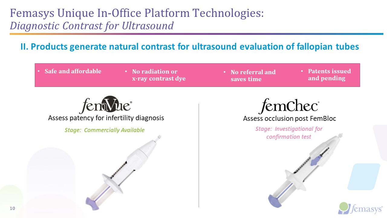 Femasys Unique In-Office Platform Technologies: Delivery Directed to Fallopian Tubes   9  I. Products isolate opening of fallopian tube(s) for precise delivery of materials   Selective catheter for sperm  Dual catheters for biopolymer  Selective catheter for contrast  Stage: Investigational in U.S. for artificial insemination  Stage: Investigational for permanent birth control  No special skillset and no capital equipment  No cannulation of tube  Patents issued and pending  No anesthesia and no incisions  Stage: Commercially Available