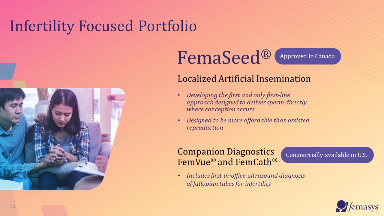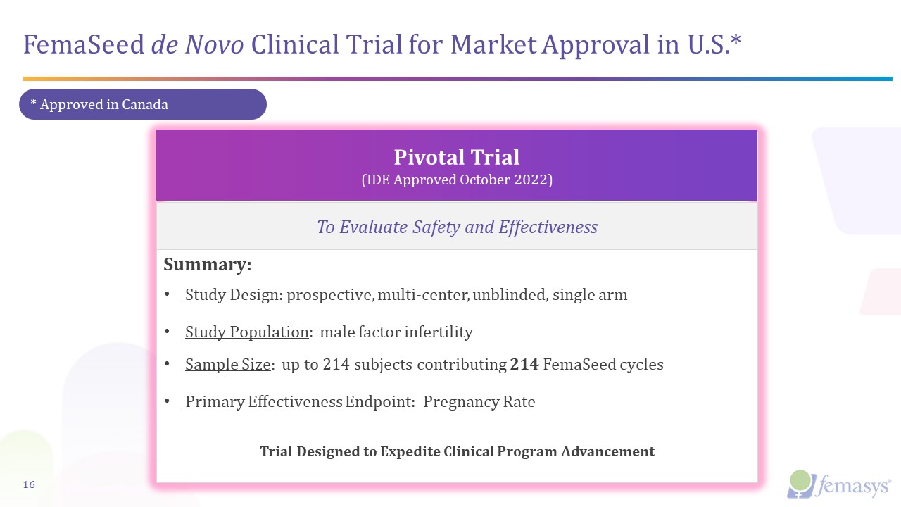 Summary:  Study Design: prospective, multi-center, unblinded, single arm  Study Population: male factor infertility  Sample Size: up to 214 subjects contributing 214 FemaSeed cycles   Primary Effectiveness Endpoint: Pregnancy Rate      Trial Designed to Expedite Clinical Program Advancement  FemaSeed de Novo Clinical Trial for Market Approval in U.S.*  SITE RECRUITMENT UNDERWAY  Pivotal Trial(IDE Approved October 2022)  16  To Evaluate Safety and Effectiveness  * Approved in Canada