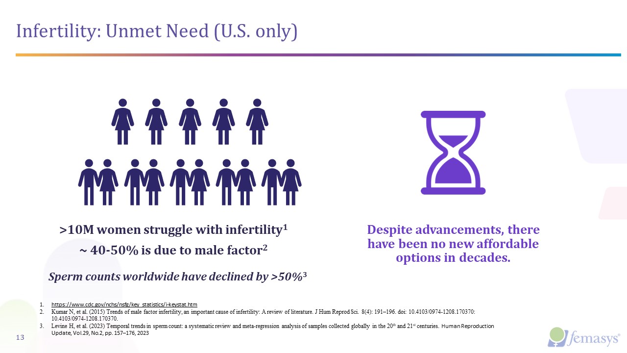 Infertility: Unmet Need (U.S. only)   >10M women struggle with infertility1  ~ 40-50% is due to male factor2  Despite advancements, there have been no new affordable options in decades.  13  https://www.cdc.gov/nchs/nsfg/key_statistics/i-keystat.htm  Kumar N, et al. (2015) Trends of male factor infertility, an important cause of infertility: A review of literature. J Hum Reprod Sci. 8(4): 191–196. doi: 10.4103/0974-1208.170370: 10.4103/0974-1208.170370.  Levine H, et al. (2023) Temporal trends in sperm count: a systematic review and meta-regression analysis of samples collected globally in the 20th and 21st centuries. Human Reproduction Update, Vol.29, No.2, pp. 157–176, 2023  Sperm counts worldwide have declined by >50%3