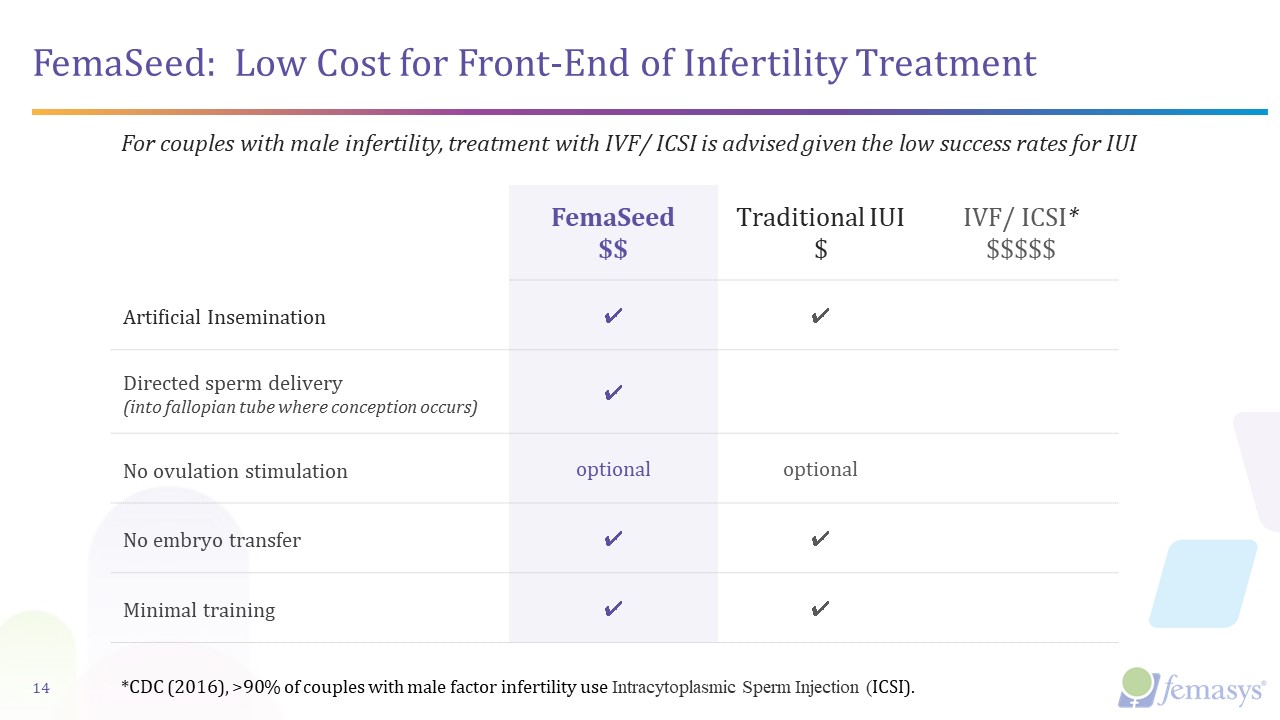 FemaSeed: Low Cost for Front-End of Infertility Treatment  FemaSeed  $$  Traditional IUI  $  IVF/ ICSI*  $$$$$  Artificial Insemination  ✔  ✔  Directed sperm delivery   (into fallopian tube where conception occurs)  ✔  No ovulation stimulation  optional  optional  No embryo transfer   ✔  ✔  Minimal training  ✔  ✔  14  For couples with male infertility, treatment with IVF/ ICSI is advised given the low success rates for IUI  *CDC (2016), >90% of couples with male factor infertility use Intracytoplasmic Sperm Injection (ICSI).