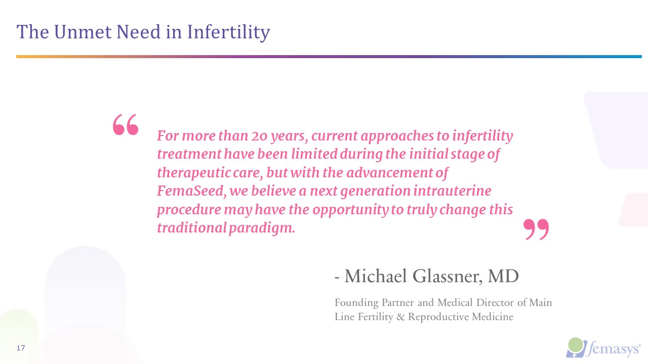 The Unmet Need in Infertility  17  For more than 20 years, current approaches to infertility treatment have been limited during the initial stage of therapeutic care, but with the advancement of FemaSeed, we believe a next generation intrauterine procedure may have the opportunity to truly change this traditional paradigm.  - Michael Glassner, MD  Founding Partner and Medical Director of Main Line Fertility & Reproductive Medicine
