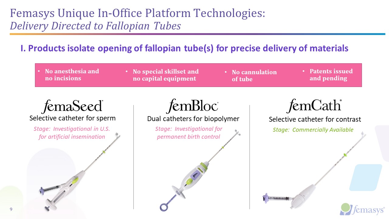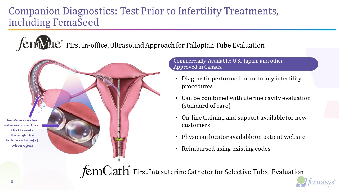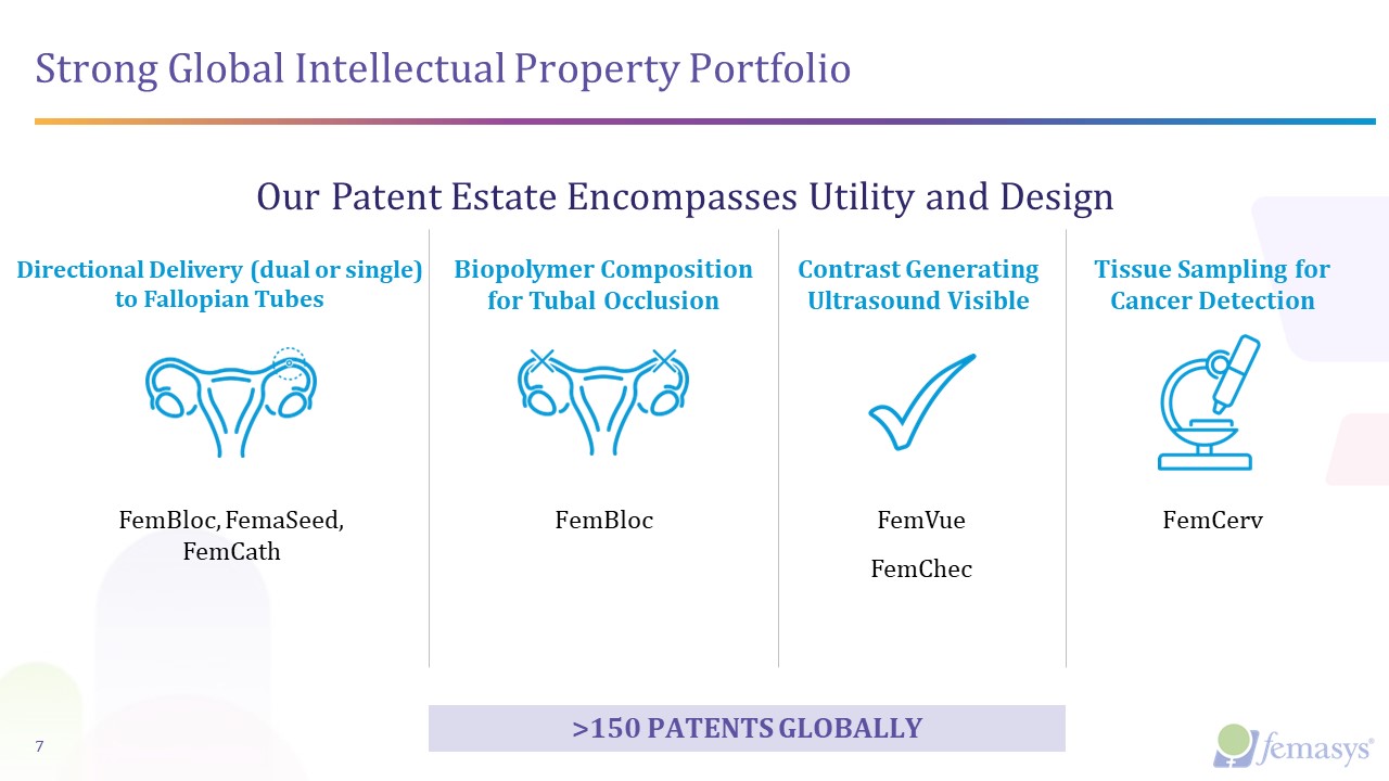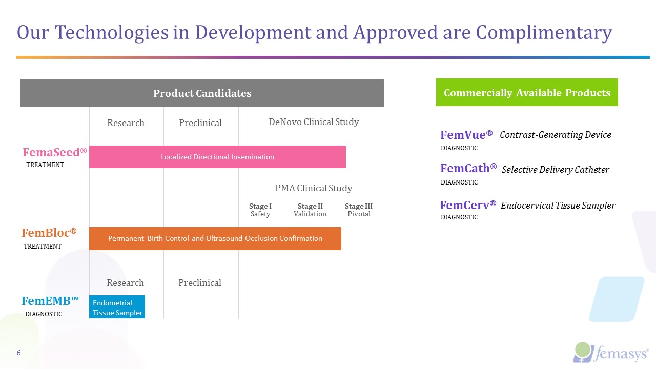 FemVue®️  Contrast-Generating Device  FemCath™️  Selective Delivery Catheter  FemaSeed®  Localized Directional Insemination  FemBloc®  Permanent Birth Control and Ultrasound Occlusion Confirmation  FemCerv®  Endocervical Tissue Sampler  FemaSeed®  FemBloc®  Product Candidates  Localized Directional Insemination  Research  Preclinical  Stage ISafety  Stage IIValidation  Stage IIIPivotal  DeNovo Clinical Study  PMA Clinical Study  Our Technologies in Development and Approved are Complimentary  TREATMENT  TREATMENT  Permanent Birth Control and Ultrasound Occlusion Confirmation  FemEMB™  DIAGNOSTIC  Endometrial   Tissue Sampler  Research  Preclinical  FemVue®️  Contrast-Generating Device  FemCath®️  Selective Delivery Catheter  Commercially Available Products  FemCerv®  Endocervical Tissue Sampler  DIAGNOSTIC  DIAGNOSTIC  DIAGNOSTIC  6